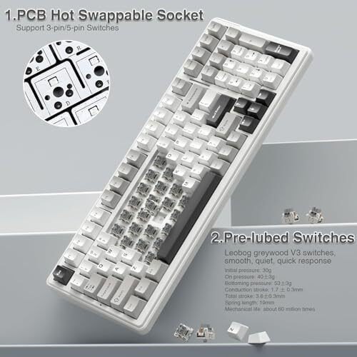 Item model number: Grey+White - Graywood Switch Special Feature: Backlit, Integrated Stand, Rechargeable, Hot-Swappable Color: Black&Grey&White Compatible Devices: Laptop, Gaming Console, PC, Tablet, Smartphone Item Weight: 3.21 pounds Batteries: 1 Lithium Polymer batteries required. (included) Connectivity Technology: 2.4GHz, BT5.0, USB-C UPC: Does Not Apply Keyboard Description: Mechanical Brand: Does Not Apply gtin13: Does Not Apply Item Height: 15.38 Item Length: 5.78 Number of Keys: 99 Type: Does Not Apply EAN: Does Not Apply Country of Origin: China Date First Available: October 23, 2023 MPN: Does Not Apply Style: Contemporary Customer Reviews: 4.7 out of 5 stars Product Dimensions: 5.78 x 1.67 x 15.38 inches Keyboard backlighting color support: RGB Item Width: 1.67 Manufacturer: Does Not Apply