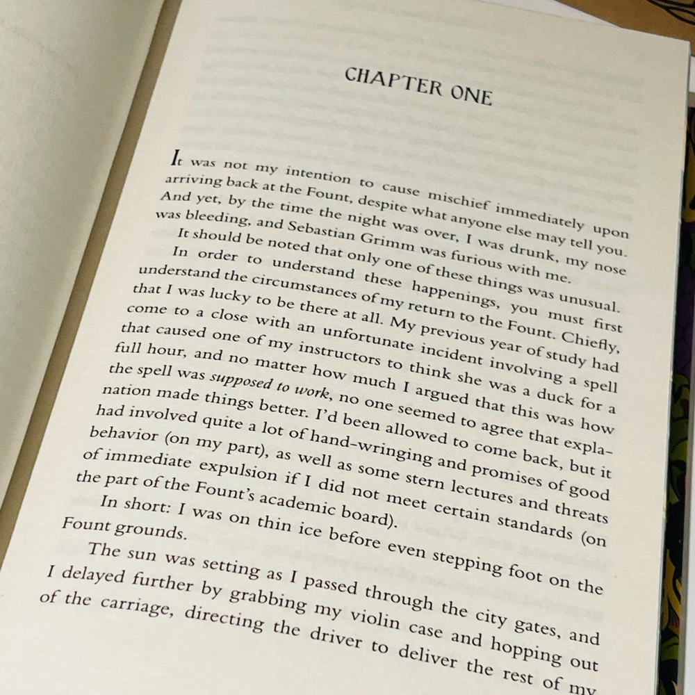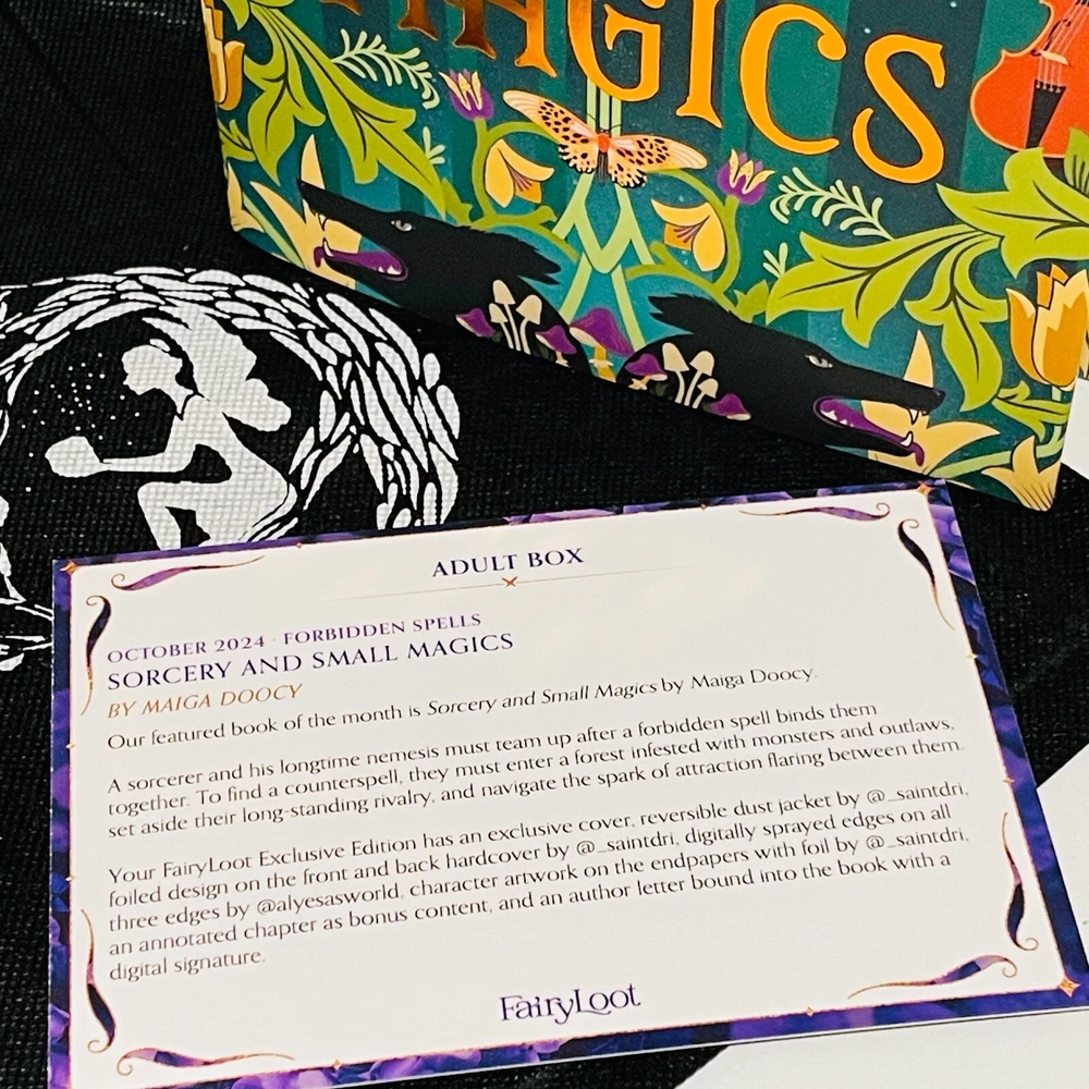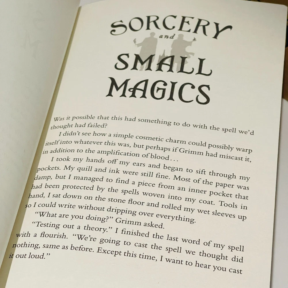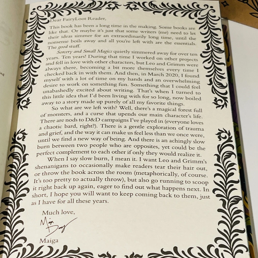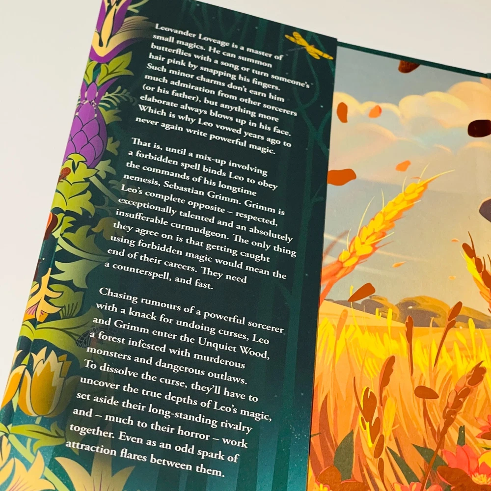 Sorcery and Small Magics by Maiga Doocy FAIRYLOOT Exclusive October Edition Leovander Loveage is a master of small magics. He can summon butterflies with a song, or turn someone’s hair pink by snapping his fingers. Such minor charms don’t earn him much admiration from other sorcerers (or his father), but anything more elaborate always blows up in his face. Which is why Leo vowed years ago to never again write powerful magic. That is, until a mix-up involving a forbidden spell binds Leo to obey the commands of his longtime nemesis, Sebastian Grimm. Grimm is Leo’s complete opposite—respected, exceptionally talented, and an absolutely insufferable curmudgeon. The only thing they agree on is that getting caught using forbidden magic would mean the end of their careers. They need a counterspell, and fast. But Grimm casts spells, he doesn’t undo them, and Leo doesn’t mess with powerful magic. Chasing rumors of a powerful sorcerer with a knack for undoing curses, Leo and Grimm enter the Unquiet Wood, a forest infested with murderous monsters and dangerous outlaws alike. To dissolve the curse, they’ll have to uncover the true depths of Leo’s magic, set aside their long-standing rivalry, and—much to their horror—work together. Even as an odd spark of attraction flares between them. . EXCLUSIVE REDESIGNED COVER REVERSIBLE DUST JACKET FOIL ON THE HARDCOVER DIGITAL SPRAYED EDGE SIGNED BY THE AUTHOR, AUTHOR LETTER Maiga Doocy BONUS CONTENT Hardcover brand new book with Fairyloot Bag