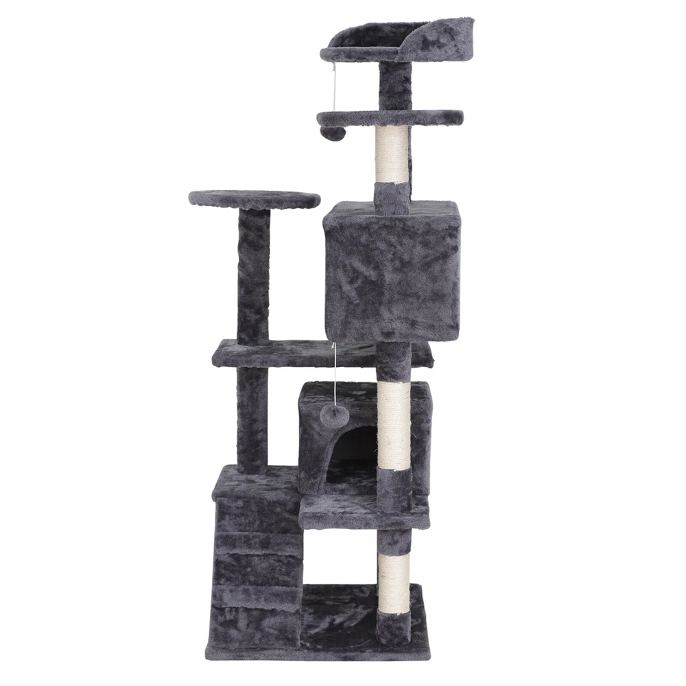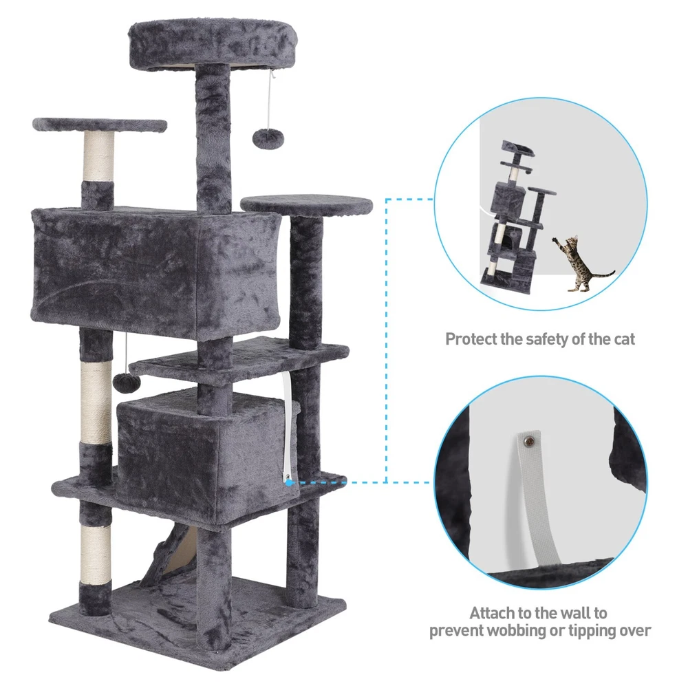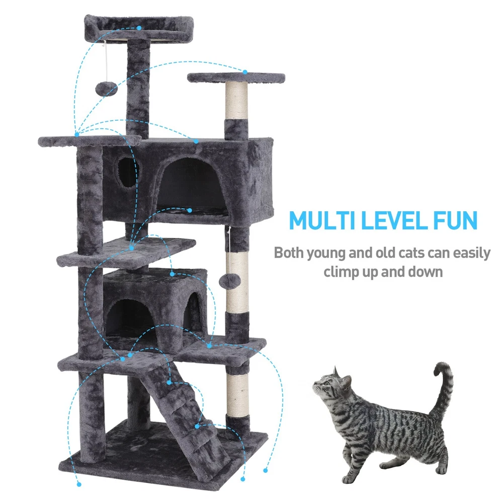 [FALSH SALE]HomGarden 55''H Multi-Level Soft Cat Tree Condo Cat Tower WScratching Posts & Top Perch, Gray About this item Roomy & Cozy Cat Condo: All-day snoozes are part of your cat's daily routine. 2 spacious room offer soft and warm lounging spots, perfect to curl up for snoozing. Multi-Level for Playtime: The ladder provides plenty of space for your cats to climb up and down and adds an extra element of fun. Your frisky cats can jump from perch to perch and climb to the top of the lookout tower. Dangling ball and rope toys offer a fun-filled, stimulating playtime. No More Scratch: Multiple scratching posts are wrapped in natural sisal rope to hold up to daily scratching with one or more cats. Scratching ramp connects at two points to increase stability as well as prevent your cats from scratching your furniture. Durable & Soft Cat Condo: The board is made of grade P2 particleboard certified by CARB, and a soft & skin-friendly plush fabric covering for maximum comfort during naptime. Added Safety: Our cat tree aims to offer a safe, sturdy, and stable home and entertaining center for your feline friends. The bottom base is strengthened with battens to ensure its stability. Moreover, you can secure the tower to the wall with the included anti-tip kit for double safety. Easy To Assemble: Comes with detailed instructions for quick and easy installation, all the hardware and tools are included. Big Room: 19.5'' L x 10.6'' W x 9.44'' H | Small Room: 11'' L x 11'' W x 8.5’’H | Max Load Capacity up to 44lbs. Beautiful appearance will add luster to any room in your home. Specifications: Color: Black Gray Net Weight: 30.75lbs Max. Load: 44lbs Material: Particleboard & Plush & Sisal Small Room: 11'' L x 11'' W x 8.5’’H Big Room: 19.5'' L x 10.6'' W x 9.44'' H Overall Dimension: 25.6'' L x 26'' W x 55'' H Warm note: It is recommend for Small and Medium sized cats rather than large cats. Please check the size before purchasing. For Big Orange Cat, it shouldn't be more than 2. For other medium cats, it could hold no more than 4. This cat tree doesn't work for Maine coon. Specifications Features Multi-Level Brand HomGarden Animal Type Cat Color Gray Manufacturer Part Number P01-3382-G2 Manufacturer HomGarden Assembled Product Weight 30.75 lb Assembled Product Dimensions (L x W x H) 25.60 x 26.00 x 55.00 Inches