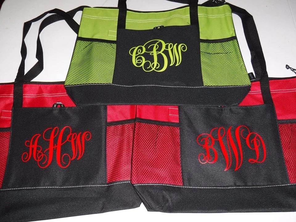 FANCY CROSS MONOGRAM ZIPPERED GEMLINE TOTE YOUR CHOICE OF COLOR TOTE COLOR DESIGN IS HEAT TRANSFER VINYL AND WILL BE DONE IN WHITE VERY NICE DURABLE BAG GREAT FOR TRAVELING, BEACH, OVERNIGHT BAGS, PURSE AND MORE BAG SPECS: 600-denier polyester 29½" Black webbing shoulder straps Zippered main compartment Front pocket with pen loop Two side mesh pockets Back panel is Black 20"W x 14"H x 4"D I INCLUDED A PICTURE OF SOME TOTES WE HAVE MADE WITH THE HEAT PRESSED VINYL TO GIVE AN EXAMPLE OF HOW THEY LOOK WHEN MADE. PLEASE BE SURE TO INCLUDE YOUR INITIALS first LAST middle in that order. If your name is Audra Michelle Green your monogram would be aGm. THESE ARE MADE TO ORDER ITEMS SO PLEASE ALLOW A COUPLE DAYS FOR ITEM TO BE COMPLETED PRIOR TO SHIPPING. PLEASE ASK ALL QUESTIONS PRIOR TO PURCHASING. THANK YOU! DESIGN MAY BE SLIGHTLY ENLARGED TO SHOW DETAIL. DESIGN MEASUREMENT IS 6.5 INCHES ACROSS AND NO TALLER THAN 6.5 INCHES TALL. Color may be slightly off due to camera flash and lighting. Be sure to fully examine all pictures closely and read auction completely prior to placing a bid. If you have any questions please be sure to contact me and I will do my best to answers them. I do combine shipping! Items shipped priority mail within the United States will include FREE shipping insurance. Please note that our post office is closed on Sat & Sun so we can only ship Mon-Fri. We try to get all items in the mail within 1-2 business days after payment has been completed. Paypal is the only form of payment we accept at this time. If ever there is a problem please contact us prior to leaving bad feedback. We strive for a 5 star rating. Thank You :-)
