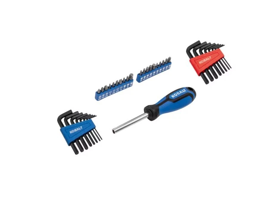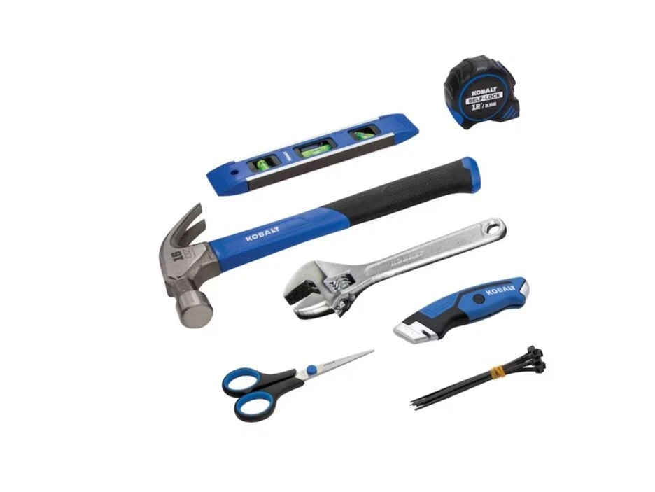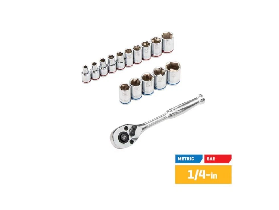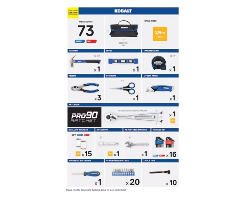 Overview We've chosen key items used in the home and workplace to create a great 73 piece set that is easy to store at home or office and convenient enough to carry with you on a job site! This metric and SAE, 1/4 inch drive set will be a great addition for simple fixes! This 1/4-in drive set includes 73 commonly used tools including 15 metric and SAE sockets, a 3-in extension and a 90-tooth ratchet and will be a great addition for simple fixes Other tools include 16 metric and SAE hex keys, 16 oz hammer, driver handle with 20 insert bits, 3-piece pliers set, 6-in adjustable wrench, 12-ft measuring tape, 9-in level, a pair of household scissors, a utility knife, and 10 cable ties 1/4-Inch drive metric and SAE socket sizes include 10, 11, 12, 13 and 14 mm as well as 5/32, 3/16, 7/32, 1/4, 9/32, 5/16, 11/32, 3/8, 7/16 and 1/2-in The 3-piece pliers set includes a pair of long-nosed pliers, a pair of diagonal cutters, and a pair of slip-joint pliers This handy all-purpose set comes in a durable nylon case with a reinforced bottom in which tools are held in place with the help of specific pockets and clips for each tool that measures 7.25-in H x 15.75-in W x 5.71-in D when closed and weighs 9 pounds The dual-layered nylon case unfolds to display all of the tools while working and returns neatly to a briefcase carrier simply by folding and fastening the strong Velcro and plastic clips; the double-stitched handle provides security when carrying Sockets are constructed of chrome vanadium steel to provide strength and durability and feature laser-etched size callouts with a blue or red color stripe to identify metric or SAE sizes Meets or exceeds ANSI specifications
