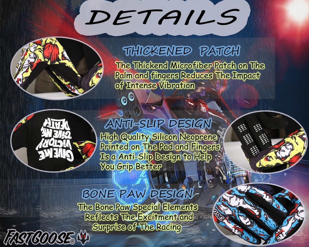 FASTGOOSE Gloves are tough built for a long term use,It will bring you a new perception, Ideal for ATV UTV motocross motorbike dirt bike,Suitable for multipurpose usage, outdoor sport,bicycling, motorcycling, climbing,Hunting etc 【Breathable & Comfortable 】The motorcycle gloves is made of the polyester,microfiber as well as the breathable hole on the fingers and palm. which can increase airflow circulation throughout your fingers so they don’t get sweaty. Also the cuff is stretchy,making the gloves fit your hands. 【Excellent Grip - Non-slip】Non-slip microfiber is used on the palm and all over the fingers. It increases the grip on motorcycle handlebars to improve driving safety. 【Screen Touch Friendly】The index finger and thumb of the gloves is equipped with the microfiber material,which is with the screen touch function. You can use your phone or adjust the navigator easily and don't need to take off gloves. 【ALL-PURPOSE】Ideal for BMX ATV MTB riding, road racing, cycling, shooting training, air pistol, powersports, motocross, climbing, skating, mountaineering, dirt bike,and many other fields. 【Measurement】Please refer to the sizing guide in pictures for optimal sizing.