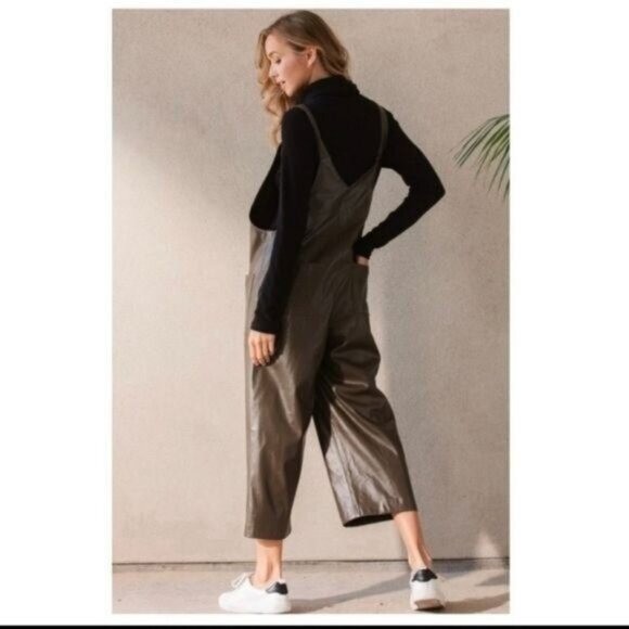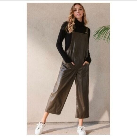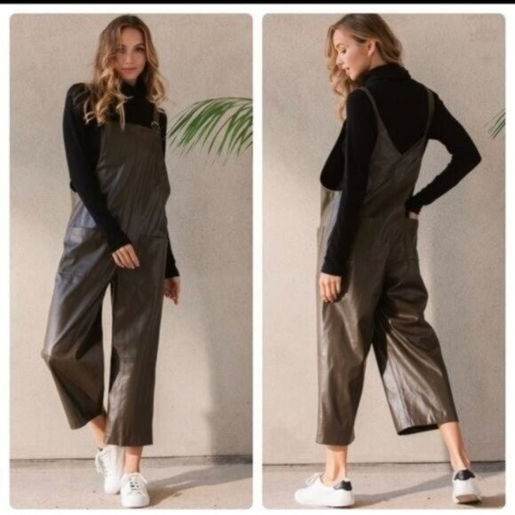 The Faux Leather Olive Wide Leg Jumpsuit is a stylish and versatile piece perfect for both party occasions and casual wear. Made from faux leather in a solid green color, this one-piece jumpsuit features a wide-leg design and a regular size fit. The jumpsuit is ideal for the summer, fall, and spring seasons, making it a great addition to any woman's wardrobe for a trendy and easy-to-wear option.