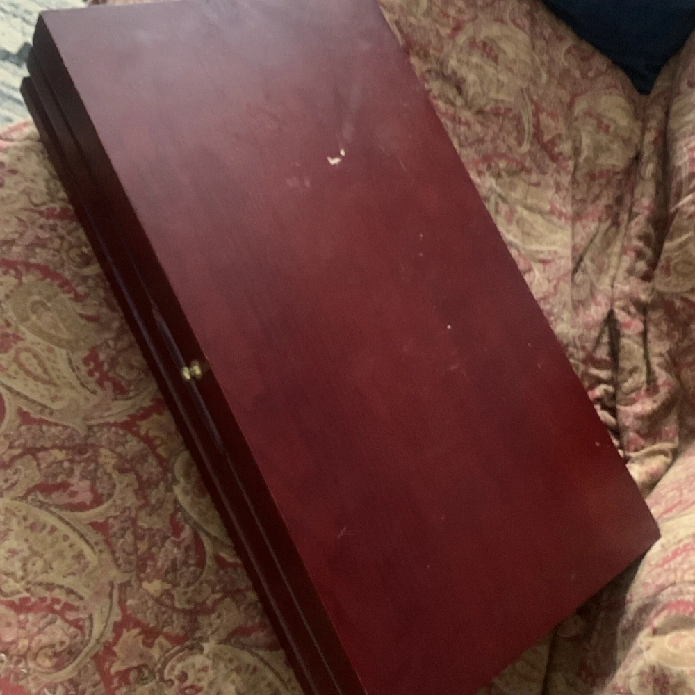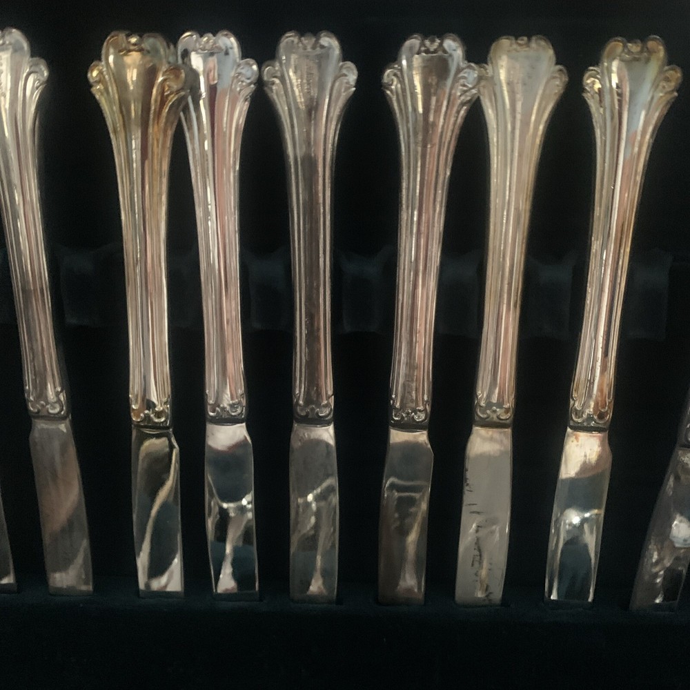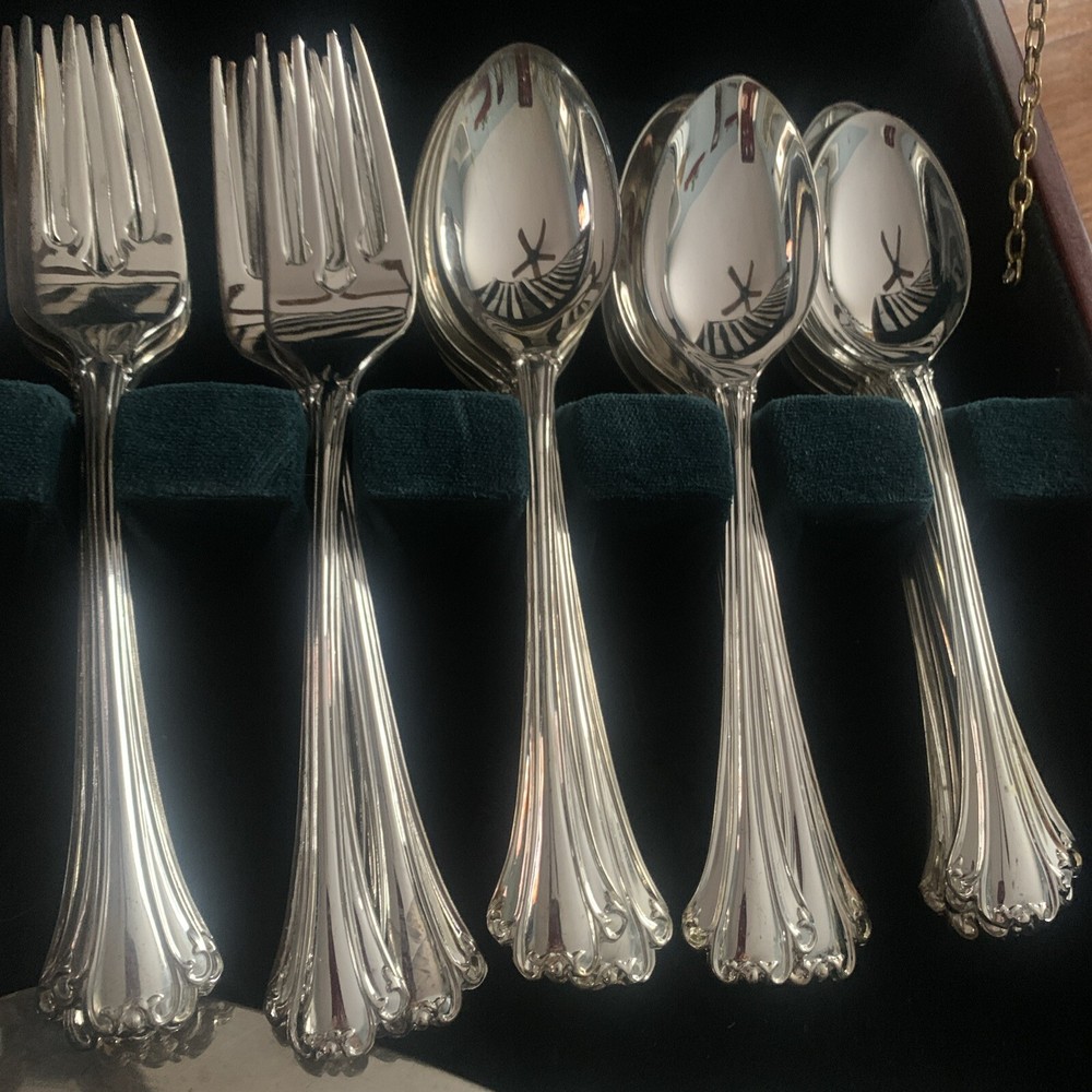 This elegant FB Rogers AMERICAN CHIPPENDALE flatware set is perfect for any occasion. With 84 pieces, including knives, forks, spoons, and a serving set, it's enough to seat 16 people. The set is made of high-quality silver-plated material with a glossy finish, giving it a traditional and timeless style. Tarnish resistant wood storage box is included. Has small small neck on lid as shown in photos. Please see all photos for the best description. I have polished most of the pieces to a high shiny finish, although one or two pieces could still use some polishing. Please see all photos, excellent set in great condition. Can’t buy this many pieces in any store for this price. The set is easy to clean, and it can be machine washed up to 140°F. It's ideal for everyday use and special occasions alike. This set is a great addition to any kitchen, dining, or bar collection.