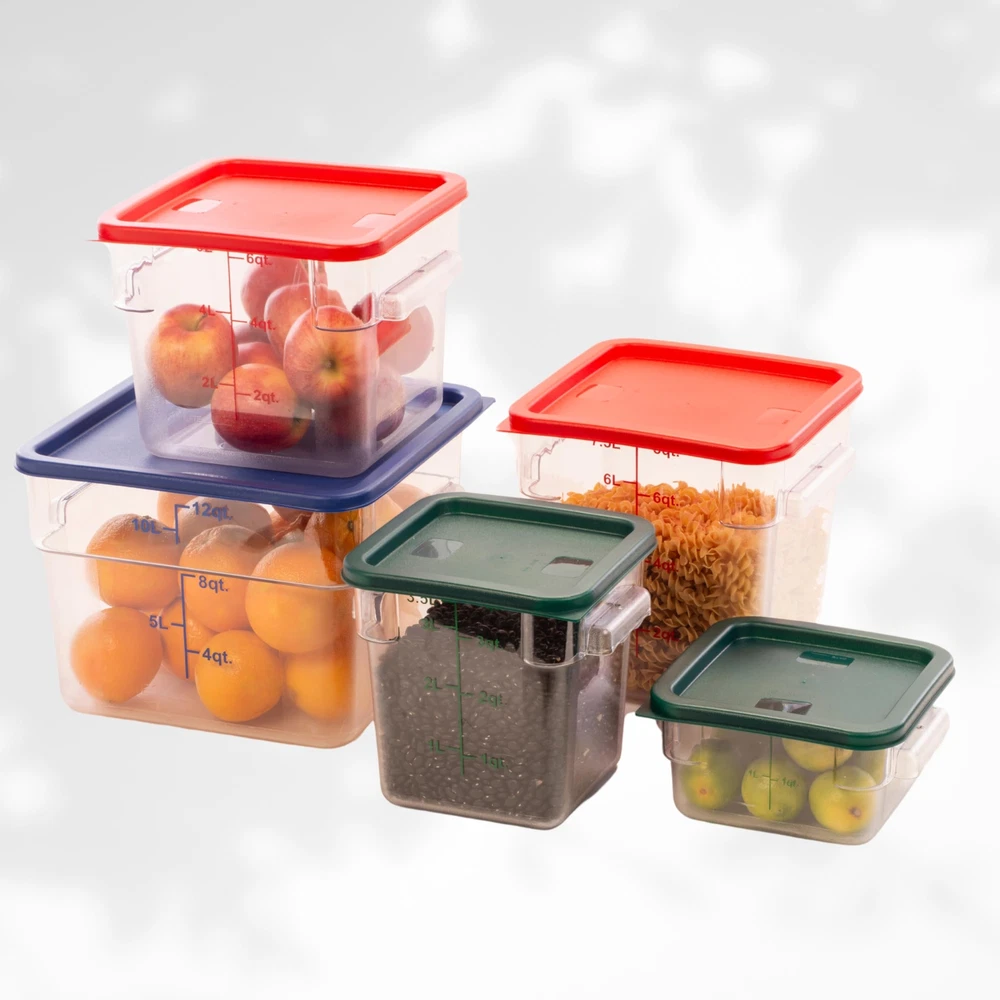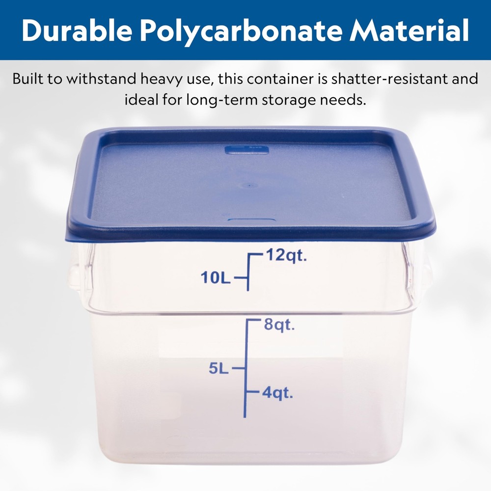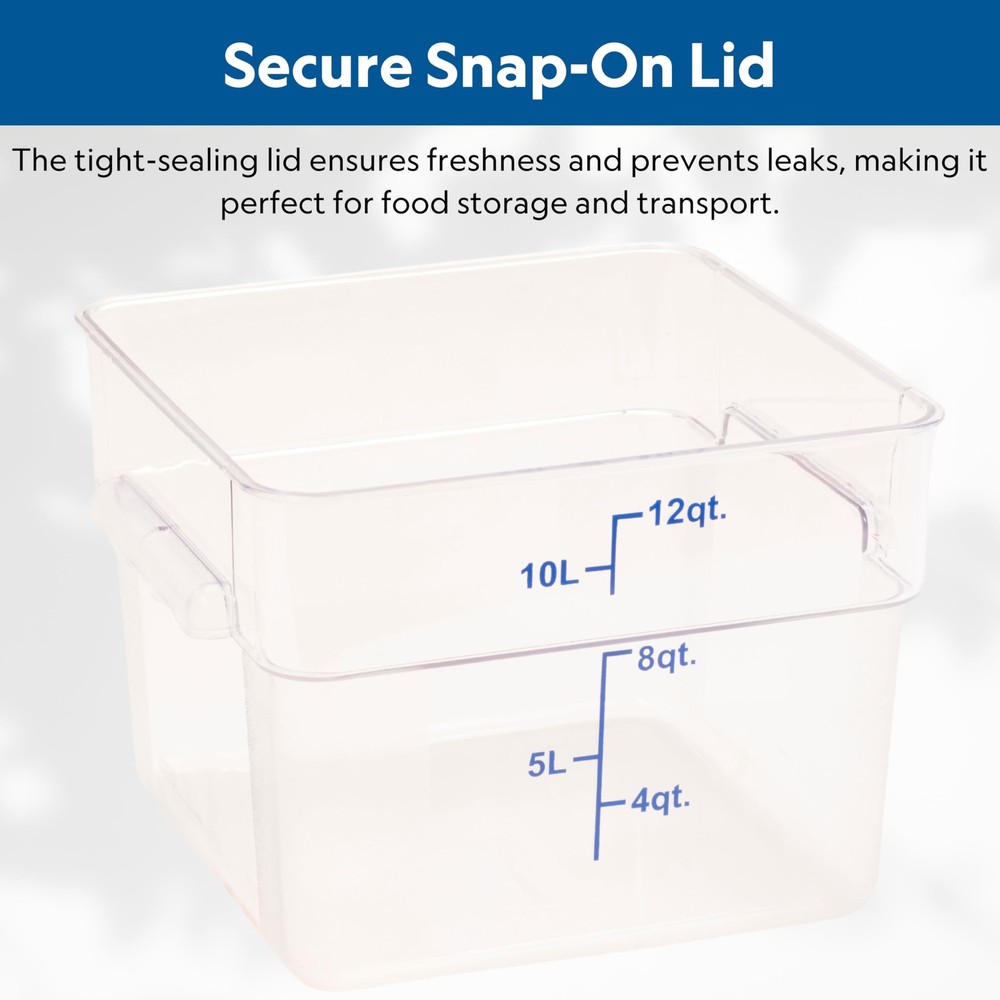 The FC12C Food Container is the ideal solution for kitchens looking to boost efficiency and streamline operations. Its durable polycarbonate construction offers exceptional strength, allowing for long-term, repeated use without compromising clarity or function. The clear design ensures quick identification of contents, helping kitchen staff save time and reduce errors when preparing ingredients. Its square shape maximizes storage space, allowing you to stack it neatly with other containers, which is particularly useful in busy commercial kitchens. The 12-quart capacity is perfect for holding everything from sauces to prepped ingredients, helping you maintain portion control and reduce food waste. For improved productivity, this reusable container can seamlessly integrate into any kitchen workflow, providing an easy-to-clean, dependable solution for daily use. MAXIMIZE STORAGE EFFICIENCY: With a 12-quart capacity and a space-saving square design, this container helps you ingredients, sauces, or leftovers in compact spaces, making it perfect for busy kitchens. CRYSTAL-CLEAR VISIBILITY: The transparent polycarbonate construction allows for quick and easy identification of contents, reducing the need to open containers and streamlining kitchen operations. DURABLE AND LONG-LASTING: Built to withstand the rigors of commercial kitchens, this reusable container ensures reliable performance over time, saving you from frequent replacements. STACKABLE DESIGN FOR SPACE OPTIMIZATION: Easily stack multiple containers to optimize your storage space and keep your kitchen organized and clutter-free, improving workflow. TEMPERATURE VERSATILITY: Designed to handle both hot and cold contents, this container is versatile for storing anything from chilled ingredients to freshly prepared dishes.