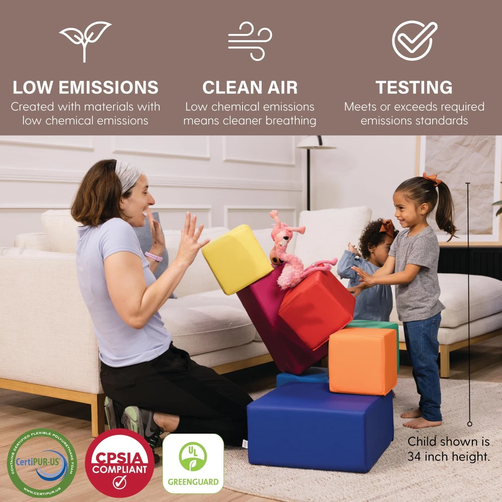 Stack and play all day long with FDP SoftScape Foam Building Block Set. Includes 7 big, bright and chunky blocks in three different shapes and sizes to stimulate children's creativity, dexterity and spatial reasoning abilities. Soft-but-sturdy foam blocks are covered in commercial upholstery grade vegan polyurethane vinyl that is buttery soft yet durable and easy to clean — just wipe with mild soap and water solution. Blocks are sewn shut and arrive fully assembled so there's no waiting and better yet, certified safe for your space and your child. Designed in San Diego and made in Mexico with globally sourced materials. IDEAL FOR HOME AND EDUCATIONAL PLAY — soft, durable foam blocks covered with high-quality, commercial grade PU vinyl, ideal for any early learning or playtime environment CHILD DEVELOPMENT — little ones develop important gross motor, social and emotional skills as they stack and play at home, daycare or classrooms COLOR RECOGNITION — kids will learn more colors with the mix of bright colorful blocks for play time EASY TO MAINTAIN — soft, durable polyurethane material is easy to clean; wipe with a mild soap-and-water solution SAFE FOR YOUR SPACE — GREENGUARD [GOLD] and CertiPUR-US Certified for low emissions into indoor air and complies with flammability regulations PRODUCT SPECIFICATIONS — small cube measures 8" L x 8" W x 8" H, rectangular block measures 16" L x 8" W x 8" H, large block measures 16" L x 16" W x 8" H