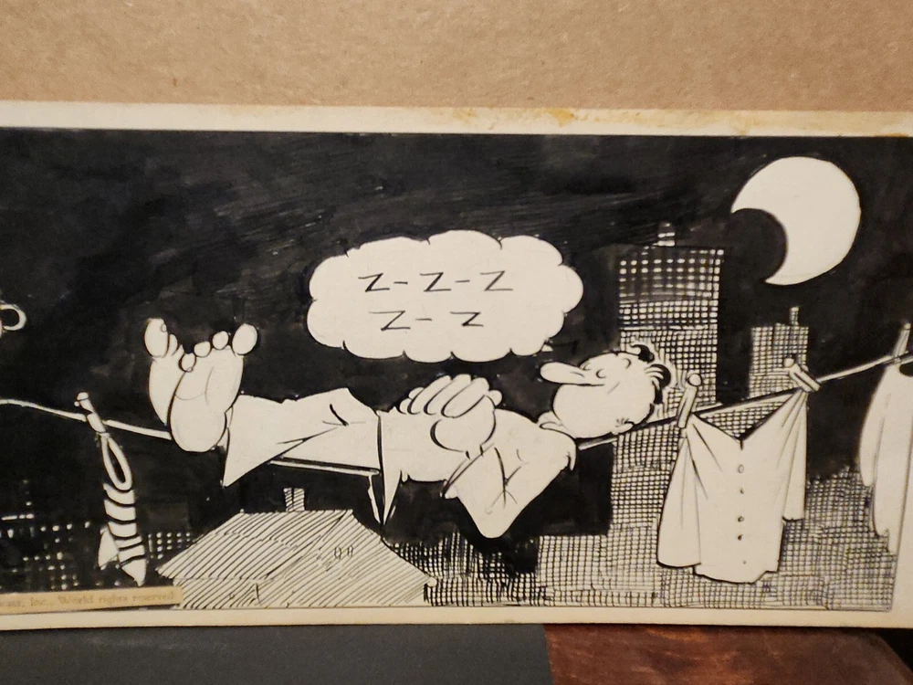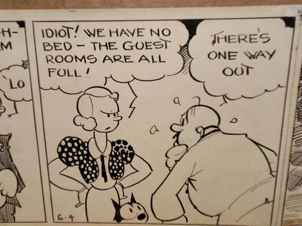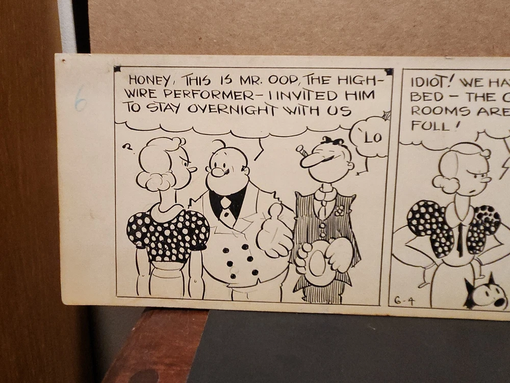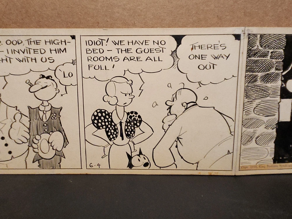 Greetings. Offered for sale is the original artwork for the daily comic strip FELIX THE CAT by Otto Messmer (1892-1983). Description : -Art Type: Daily comic strip original artwork. -Medium: Pen and ink over pencil/graphite on art board. -Publisher: King Features Syndicate, Inc. -Publication Date: June 4, 1938 -Dimensions: 27.125" wide by 5.75" tall (board dimensions; image slightly smaller) -Signed: No. -Description: This is the original artwork for the 6-4-1938 daily comic strip Felix The Cat by Otto Messmer. Felix was Garfield and Heathcliff long before they existed. Star of cartoons, comic strips and comic books, Felix was a cultural touchstone for the first half of the 20th century. Pat Sullivan was credited with creating the character in his animation studio, but the comic strip was drawn by the wickedly talented Otto Mesmer. In this daily, Pop has invited Mr. Oop, a high wire artist, to spend the night. Mom is not pleased as all of the guest rooms are occupied. No worries, as Mr. Oop clearly feels right at home on the clothes-line. Felix is shown in two of the three panels. A cute gag brilliantly rendered by Messmer. TDI Condition : -The art is in very good to excellent overall condition. The board is scored between the second and third panels (probably for mailing). It is able to be folded in half (and will be so shipped). Neat tape reinforcement to reverse. Minor to moderate age/handling wear. Pencil notes to reverse. Shipping/Payment : - Domestic buyer pays $35.00 for USPS priority mail shipping (includes tracking and insurance); this also includes packaging/handling charge. - International buyers please note that international shipping is handled by eBay international shipping. - Customs fees , duty, charges and taxes, including VAT, are NOT the responsibility of the seller and are the sole and exclusive responsibility of the buyer. - Payment is due upon purchase/auction ending. If you wish a non-standard payment method, please message me to discuss. Thank you. Please check my other listings for a selection of comic strip original art, comic book original art, books, graphic novels, music CDs, DVDs, knives, and other collectibles.