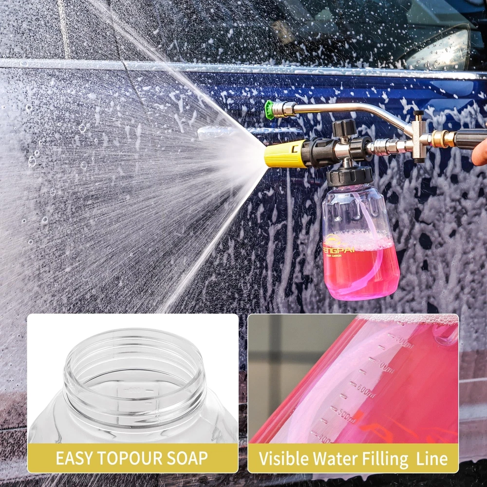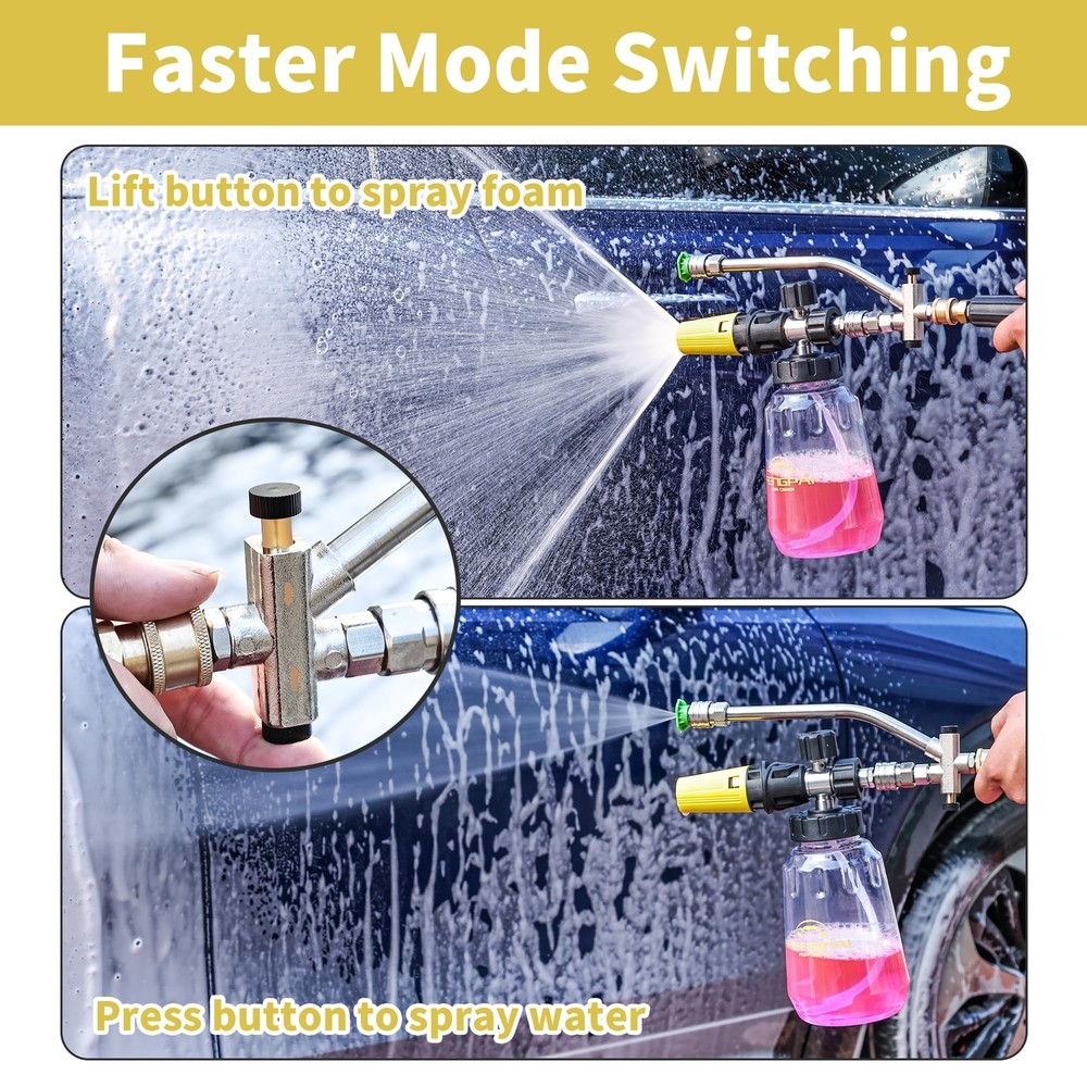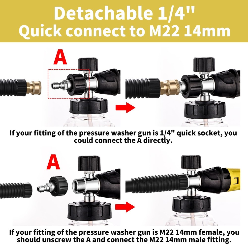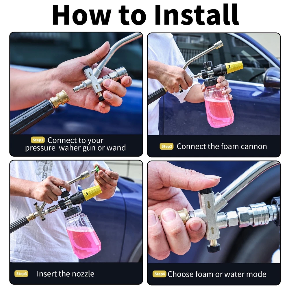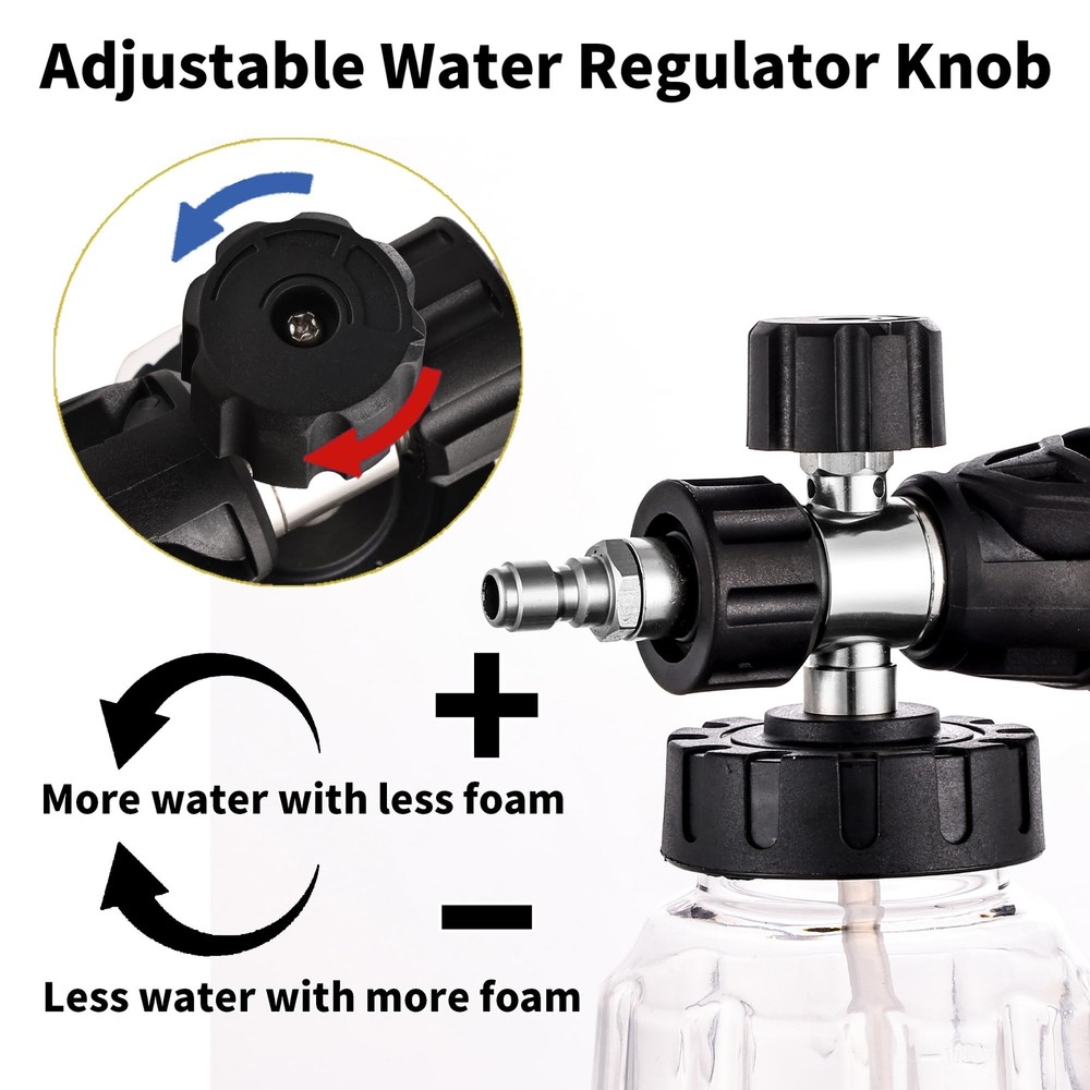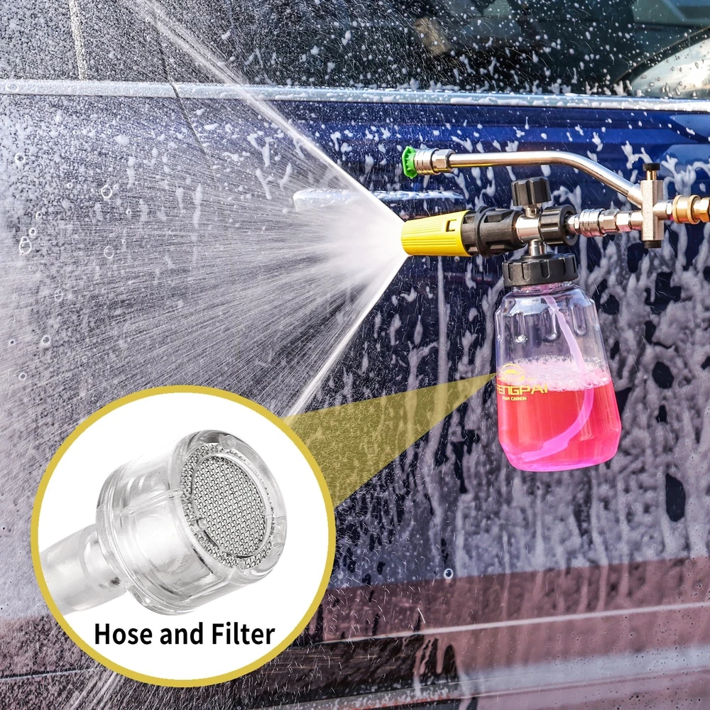 FENG PAI Foam Cannon for Pressure Washer with Dual-connector Accessory, 7 Power Washer Sprayer Nozzles, 1/4" Quick Connect Double Tip Attachment Soap Bottle Sprayer Soap, 3600 PSI (Clear) Product Details Color: Clear Brand: FENG PAI MPN: ZIP-01 UPC: Does not apply EAN: Does not apply Material: PP + Stainless Steel Brand: FENG PAI Item dimensions L x W x H: 7.3 x 4.57 x 9.3 inches Inlet Connection Size: 4.57 Inches Inlet Connection Type: National Pipe Tapered Outlet Connection Type: FNPT Maximum Operating Pressure: 3.6E+3 Pound per Square Inch Number of Ports: 2 Outlet Connection Size: 4.57 Inches Valve Type: Globe Valve Material: PP + Stainless Steel Brand: FENG PAI Item dimensions L x W x H: 7.3 x 4.57 x 9.3 inches Inlet Connection Size: 4.57 Inches Inlet Connection Type: National Pipe Tapered Outlet Connection Type: FNPT Maximum Operating Pressure: 3.6E+3 Pound per Square Inch Number of Ports: 2 Outlet Connection Size: 4.57 Inches Valve Type: Globe Valve Manufacturer: JieLiGongMao Product Dimensions: 7.3 x 4.57 x 9.3 inches Item Weight: 2.12 pounds Country of Origin: China Item model number: ZIP-01 Dual Connector Foam Cannon: Our pressure washer foam cannon features a unique design with two different connector ends - a longer one for the power washer nozzle to water washing and a shorter one for the snow foam cannon to foam washing. This design simplifies the use process, easily switch between water and foam modes, improves efficiency. Double TiP Snow Soap Attachment: 1 Liter / 0.26 gallon snow foam cannon with a detachable 1/4'' quick connector and M22-14 male thread, you can choice the connector according to your pressure washer gun. Turn the top knob right (-) and the top knob left (+) to adjust to the desired foam level, adjust nozzle to control the spray area and horizontal/vertical. 7 Spray Nozzles: Each nozzle orifice size is 2.5, different nozzles have different spray angle (0, 15, 25, 40, 65 degree, Risen and Soap). According to your cleaning purpose, choose different nozzle, washing car, garden, roof or more, universal 1/4quick connector. Tips: Please make sure that the nozzle is clean; If there is no enough water, release the gas after you add water, it will not work normally. Widely Use: Constructed from premium-grade materials, our power washer foam cannon connector promises exceptional durability and reliability for prolonged use. Which is widely used for various cleaning applications, such as motorcycle, car, roofs, driveways, floors, windows washing. And more helpful for detailing Trucks or SUVs. What You Get: Our snow foam cannon working pressure is 1000 psi to 3600 psi. Additional 1.0mm orifice nozzle is included for improved performance. Please utilize the original nozzle if the working pressure exceeds 2500 PSI. Package contains clear bottle foam cannon *1, dual-connector accessory *1, spray nozzles *7, spare 1.0mm copper spray core *1, 3.7g blowing net *1, anti-blocking needle *1, instruction *1.