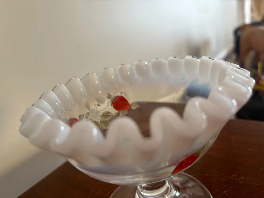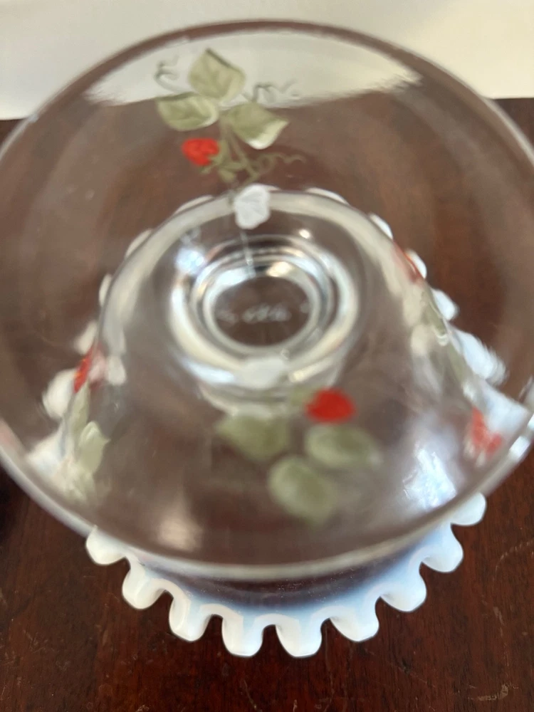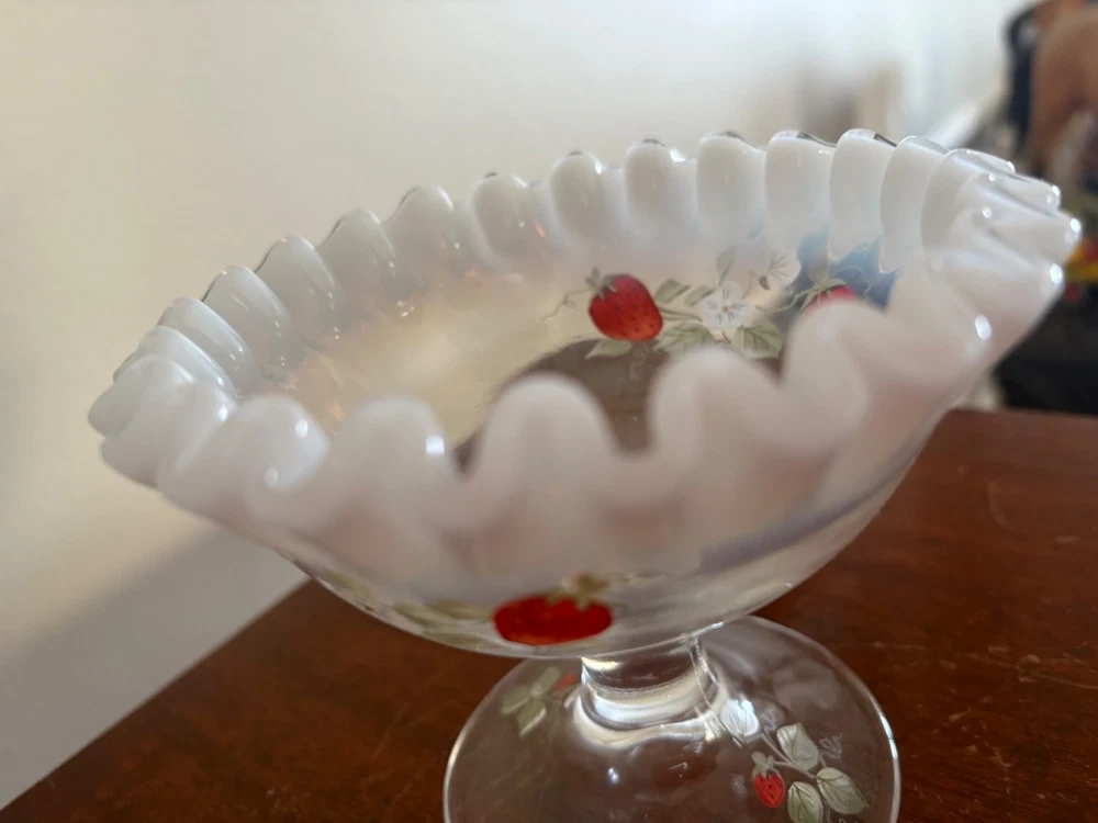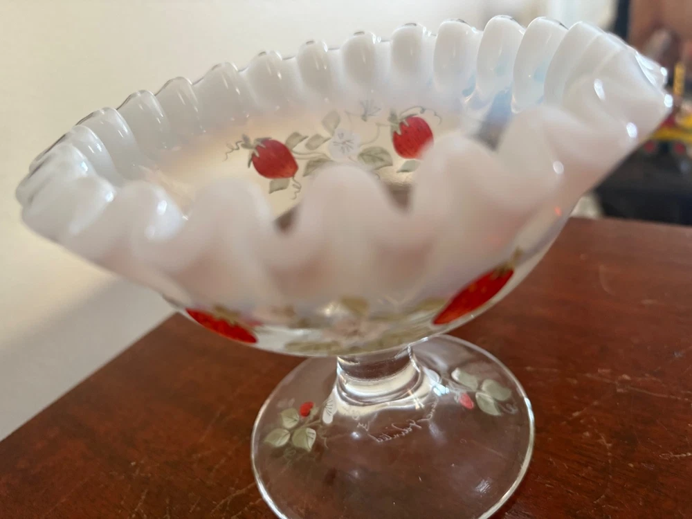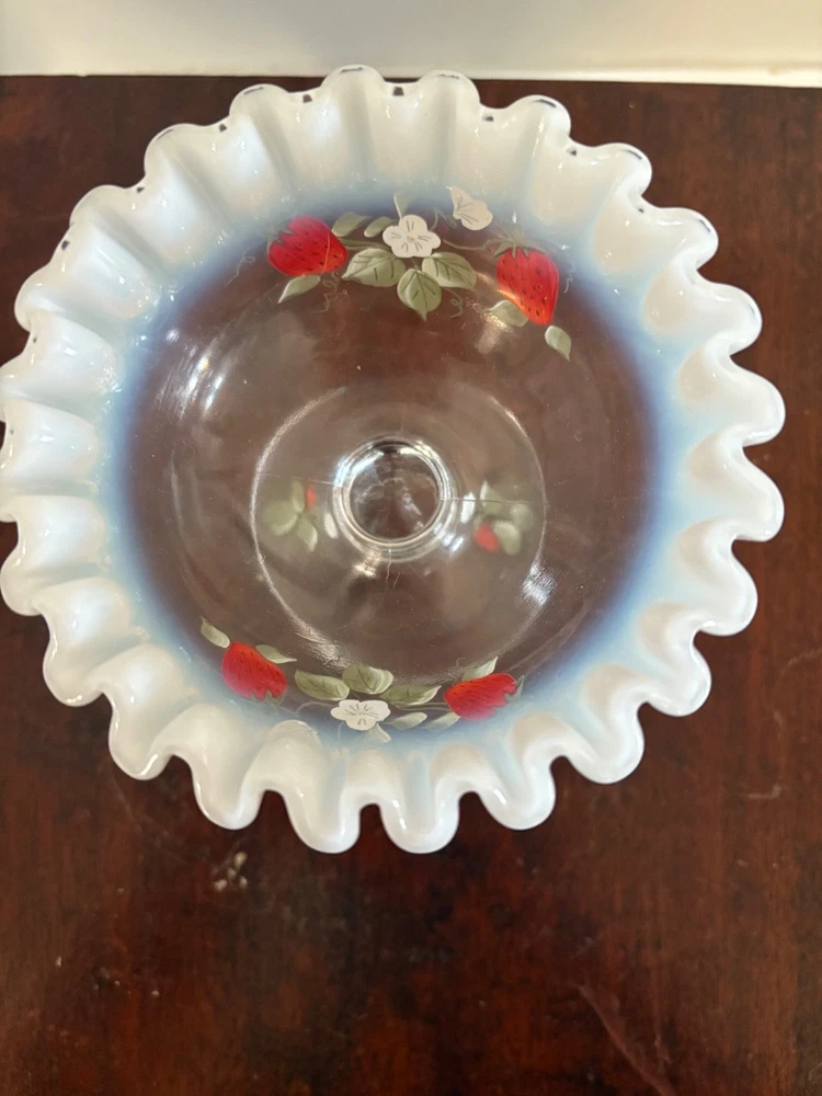 The product is a vintage Fenton French opalescent ruffled footed hand-painted strawberry compote bowl. This unique decorative collectible features a multi-color design and intricate hand-painted details typical of French style. Made of glass, this bowl adds a touch of elegance to any collection or home decor with its beautiful craftsmanship and timeless appeal. Perfect for serving or displaying fruits, candies, or potpourri, this vintage piece brings a touch of charm and nostalgia to any space. BOWL IS 4” TALL & 5” WIDE. NO CHIPS OR CRACKS. TO SEE THE SIGNATURE GO TO LAST PHOTO AND IN LARGE.