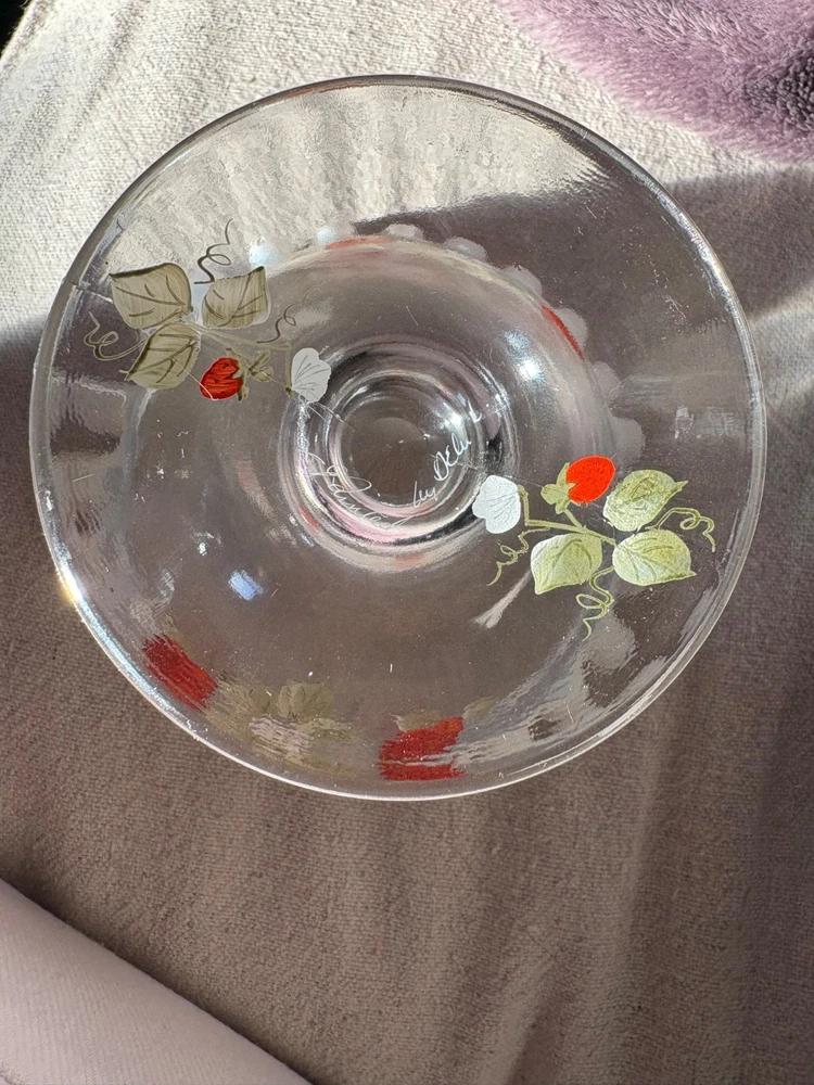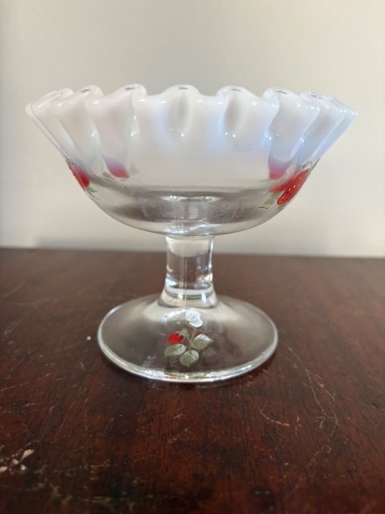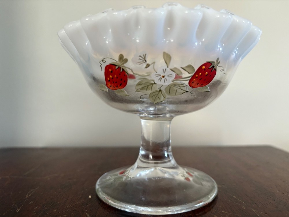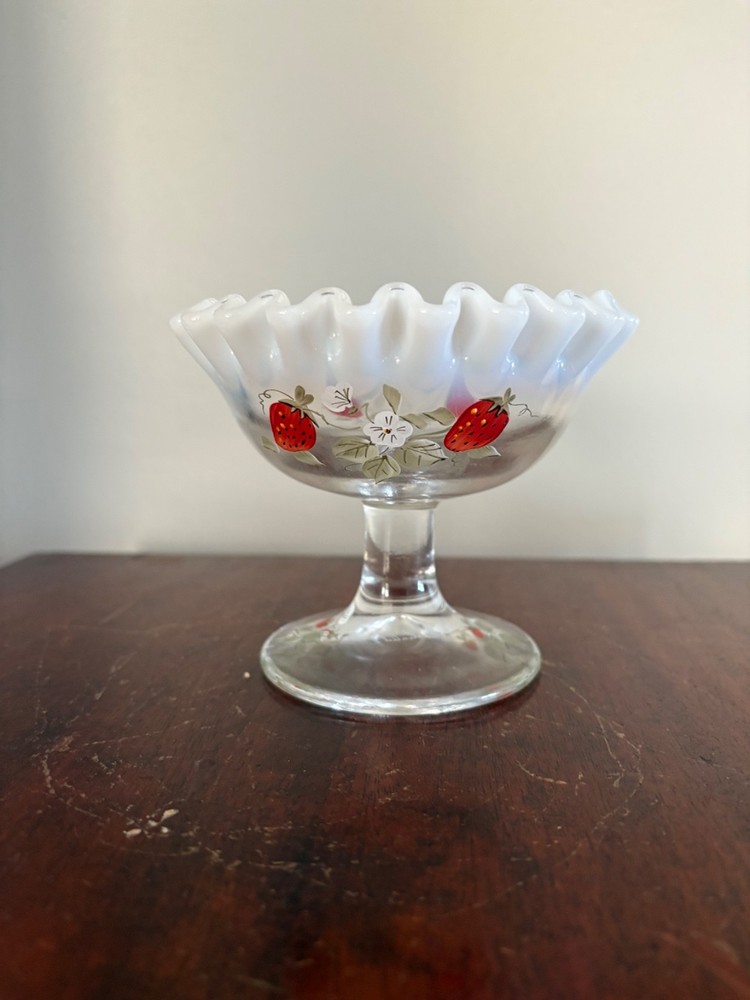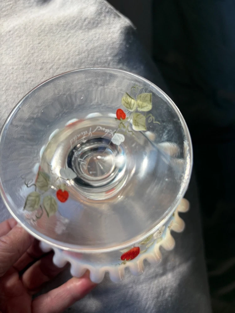 The product is a vintage Fenton French opalescent ruffled footed hand-painted strawberry compote bowl. This unique decorative collectible features a multi-color design and intricate hand-painted details typical of French style. Made of glass, this bowl adds a touch of elegance to any collection or home decor with its beautiful craftsmanship and timeless appeal. Perfect for serving or displaying fruits, candies, or potpourri, this vintage piece brings a touch of charm and nostalgia to any space. BOWL IS 4” TALL & 5” WIDE. NO CHIPS OR CRACKS. TO SEE THE SIGNATURE GO TO LAST PHOTO AND IN LARGE.