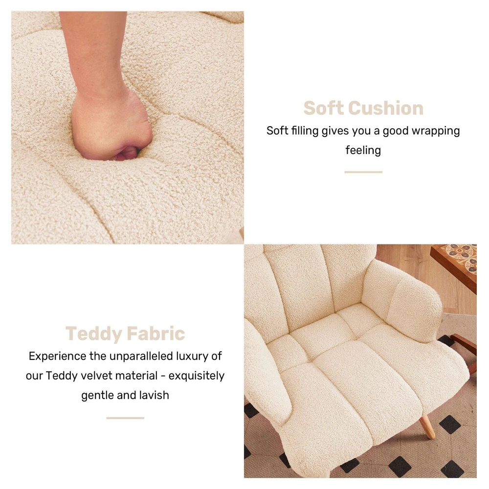 Introducing the Teddy Velvet Rocking Accent Chair, a magnificent fusion of comfort and style. This exceptional chair effortlessly brings an air of luxury to your living space, while also providing a unique rocking motion for unparalleled relaxation.Carefully constructed with a sturdy wooden frame, this accent chair is engineered to withstand the rigors of everyday use. The plush teddy velvet upholstery establishes a warm and inviting ambiance, making it the ideal sanctuary to curl up with a captivating book or unwind after a tiring day. The rocking feature of this chair introduces an additional layer of comfort and tranquility. It gently sways back and forth, allowing you to discover your perfect rhythm and effortlessly dissolve any accumulated stress or tension.Features: Composition: Free Shipping Over $49.99* Details FERPIT Rocking Accent Chair Teddy Upholstered Glider Nursery Accent Chair Padded Product Description: Introducing the Teddy Velvet Rocking Accent Chair, a magnificent fusion of comfort and style. This exceptional chair effortlessly brings an air of luxury to your living space, while also providing a unique rocking motion for unparalleled relaxation.Carefully constructed with a sturdy wooden frame, this accent chair is engineered to withstand the rigors of everyday use. The plush teddy velvet upholstery establishes a warm and inviting ambiance, making it the ideal sanctuary to curl up with a captivating book or unwind after a tiring day. The rocking feature of this chair introduces an additional layer of comfort and tranquility. It gently sways back and forth, allowing you to discover your perfect rhythm and effortlessly dissolve any accumulated stress or tension. Features: Composition 100% Polyurethane Foam filling for superior comfort and support Plush teddy velvet upholstery for a luxurious and cozy feel Durable wooden frame for long-lasting stability Gentle rocking motion for added relaxation Biscuit backrest and padded seat for excellent comfort and support Available in a variety of styles Colored Patchwork, Gray Patchwork, White/Pale Brown/Light Gray Teddy, Grey/Brown/White Rocking Chair to match your personal style Assembly Required Tool Included Notice: Product dimensions are measured manually and may differ slightly from the actual product. Maximum weight capacity : 330lbs