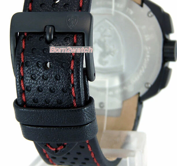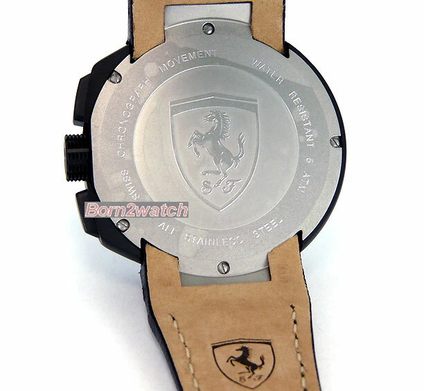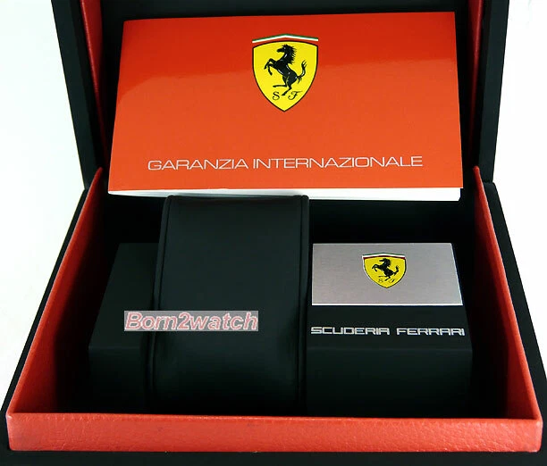 WE DO NOT SELL REPLICAS! 100% BRAND NEW AND AUTHENTIC! *SELLER RETIRING*SUPER CLEARANCE* FERRARI FE-10-IBP-CP-FC PRECISION SWISS MADE QUARTZ MOVEMENT RONDA 5030 D http://www.ronda.ch/fileadmin/user_upload/Products/TA_BA/ba/BA_5021D.5030D_en.pdf ACCURACY +20 / -10 SECONDS PER MONTH BATTERY TYPE 395 / SR 927 SW 60 MINUTE STOPWATCH SUB-DIAL AT 9 O'CLOCK POSITION 12 HOUR STOPWATCH SUB-DIAL AT 6 O'CLOCK POSITION SMALLER SECOND HAND SUB-DIAL AT 3 O'CLOCK POSITION BLACK CARBON FIBER DIAL WITH YELLOW/RED ACCENTS DATE CALENDAR BLACK ION COATED SOLID STEEL CASE AND BUCKLE IN MATTE FINISH MINERAL CRYSTAL GENUINE PERFORATED BLACK LEATHER STRAP WITH CONTRASTING RED STITCHING 50M WATER RESISTANT CASE MEASURES 45mm ACROSS EXCLUDING CROWN CASE IS 11mm HIGH WEIGHS 3.5oz (98g) MAXIMUM WRIST SIZE 8-1/2" COMES IN FERRARI PRESENTATION GIFT BOX FERRARI 2-YEAR INTERNATIONAL MANUFACTURER WARRANTY RETAIL $815