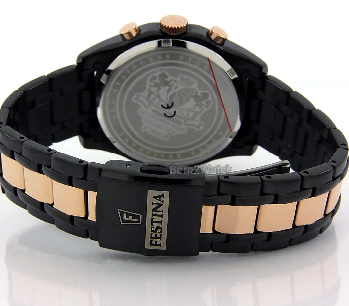 WE DO NOT SELL REPLICAS! 100% BRAND NEW AND AUTHENTIC! *SELLER RETIRING*SUPER CLEARANCE* MEN'S FESTINA F16856/1 FESTINA IS THE OFFICIAL SPONSOR OF "TOUR DE FRANCE" PRECISION CITIZEN JAPAN QUARTZ MOVEMENT 30 MINUTE STOPWATCH SUB-DIAL AT 10 O'CLOCK POSITION CHRONOGRAPH SECOND HAND COUNTER SUB-DIAL AT 6 O'CLOCK POSITION AM-PM 24 HOUR SUB-DIAL AT 2 O'CLOCK POSITION SILVER PATTERNED DIAL WITH ROSE GOLD ACCENTS LUMINESCENT HANDS AND HOUR INDICES MINERAL CRYSTAL SOLID STAINLESS STEEL BLACK PVD COATED STEEL IN POLISHED AND BRUSHED SATIN FINISH ROSE GOLD LAYERED STEEL BEZEL, CROWN, PUSHERS AND CENTER LINKS IN POLISHED FINISH SQUEEZE-RELEASE SAFETY DEPLOYMENT CLASP 100atm / 100m WATER RESISTANT CASE DIAMETER IS 43mm EXCLUDING CROWN CASE IS 11.6mm HIGH LUG SIZE IS 21mm WEIGHS 4.8oz (136g) MAXIMUM WRIST SIZE 8-1/4" FOR INSTRUCTIONS DOWNLOAD GO TO http://www.festina.com/en/manuals/ COMES IN FESTINA PRESENTATION GIFT BOX MSRP $315