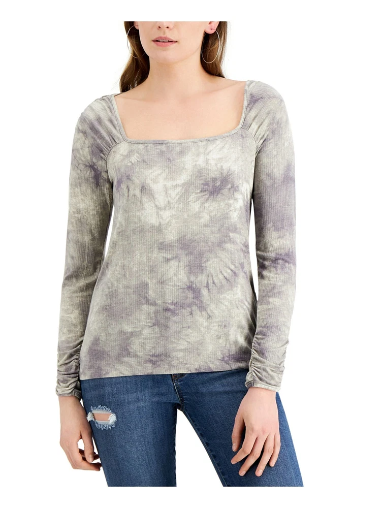 FEVER Womens Gray Ribbed Tie Dye Long Sleeve Square Neck Top Size: M
