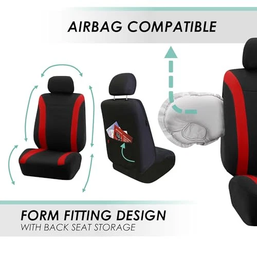 FH Group Automotive Car Seat Covers Cosmopolitan Flat Cloth Full FULLSET, RED Product Details Manufacturer: FH Group Brand: FH Group Item Weight: 2.72 pounds Package Dimensions: 13.11 x 12.36 x 7.2 inches Country of Origin: China Item model number: FB054115RED-AMZ Is Discontinued By Manufacturer: No Manufacturer Part Number: FB054102RED-WOO Fit Type: Universal Fit Brand: FH Group Color: RED Manufacturer: FH Group MaterialAuto Part Position: PolyesterRear [PACKAGE INCLUDES] One Rear Backrest Split Bench Seat Cover, One Rear Bottom Bench Split Bench Seat Cover, Three Separate Headrest Covers, Hardware to Install Car Seat Cover,1 mesh piece for rear split bench backrest (also available for individual purchase),. [OUTSTANDING CUSTOMER SERVICE] Purchase our products with peace of mind. Our team will assist you throughout the entire process and will help you choose the right product for you. If a return is needed, we will also be there to help! [FITS ALL SPLIT REAR BENCHES] Our rear seat covers are fully compatible with 5/5, 4/6, or 6/4 split rear benches or longer benches. The cover features 3 zippers in the backrest AND bottom, and extra mesh pieces so you can move the rear seat freely or use the middle arm rests and get full protection. [HIGH-QUALITY MATERIAL] These covers for car seats are made to last and provide the best protection to your car’s interior thanks to the premium cloth fabric [EASY INSTALLATION] Our seat covers are easy to install thanks to the concealed hook and loop openings, adjustable straps and zippers. Follow our instructions manuals and videos for a smooth installation! [MACHINE WASHABLE] Don’t worry about spills or stains on your rear car seat cover because they are machine washable! Simply machine wash, and air dry [STUNNING DESIGN] Enhance the look of your car interior with the classic yet stylish designs of FH Group's cloth car seat covers. We offer car seat covers for women, for men, and all! [CUSTOMIZABLE REAR COVER] This cover is compatible with any split bench and becomes 2 individual covers with the extra mesh piece. This cover features zippers providing full access to the middle armrest. Elongate cover by adding an extra piece. [COMPATIBLE WITH HEATED SEATS] Our front car seat covers are engineered to accommodate traditional and heated seats so that you can obtain the best comfort during cold winter days. [UNIVERSAL FIT] Our semi-customized car seat cover fits most vehicles better than other universal covers in the market. Our design has hook-and-loop attachments for a snug fit, straps in the bottom seat, and more, for an almost-customized look Protect the back seat of your car with this high-quality car seat cover. FH Group created the most versatile and useful back seat cover that will be the best car seat protector for your rear bench, no matter how it's designed. Our Universal fit car seat covers will fit most car back seats because they feature zippers in the backrest and the bottom seat. These zippers, along with the mesh pieces, will allow the cover to fully protect the rear seat, even if it is a 50/50, 40/60, or 60/40 split rear bench. Does your car have a longer back seat? No problem, our car seat cover will fit most rear seats since the zipper allows the addition of an extra piece to elongate the cover to protect longer seats. Our zipper design also allows full access to the middle console or arm rest on the back seat. We design our car seat covers with high-quality materials that are meant to last and protect your seats from any spills, stains and dirt. Our durable car seat protectors are great car interior accessories. Sit back and relax because FH Group got you covered! Protect your car seats and preserve their lifespan with these beautifully designed covers. Striped panels frame the center of our super soft fabric to upgrade the look of your interior while keeping things simple and uncluttered.