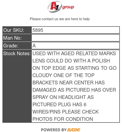 FIAT 500 3DR O/S DRIVERS RIGHT SIDE HEADLIGHT 2007-2012 Mon-Fri: 8am-5pm | Sat: 8am-4pm | Sun: Closed STORE ABOUT CONTACT FEEDBACK FIAT 500 3DR O/S DRIVERS RIGHT SIDE HEADLIGHT 2007-2012 Manufacturer Part Number: Not Available SKU Code: 5895 Part Number: 5733 Grade: A Stock Notes: USED WITH AGED RELATED MARKS LENS COULD DO WITH A POLISH ON TOP EDGE AS STARTING TO GO CLOUDY ONE OF THE TOP BRACKETS NEAR CENTER HAS DAMAGED AS PICTURED HAS OVER SPRAY ON HEADLIGHT AS PICTURED PLUG HAS 6 WIRES/PINS PLEASE CHECK PHOTOS FOR CONDITION Please note that goods CANNOT be held; goods aren't confirmed until payment has been completed This Part's Donor Vehicle Vehicle/Model: Stock Bodywork Colour: Not Available Interior Trim Colour: Not Available Interior Fabric Colour: Not Available Manufactured Year: 2023 More From This Vehicle DonorVehicle:43ID More From Similar Vehicles SimilarVehicle:25207NUM Compatability Compatibility is provided on listings to give an indication of some of the cars this part will fit. However, it may not fit your car due to the many differences with specification and changes on model years. Please take ebays compatibility as a guide. The best and the easiest way to quickly check if the part is right for you is to compare part numbers. We are experts; so, if in doubt please call or message us and our technical team will be happy to advise. Terms And Conditions Items above £500 are not included in the global accounting scheme. Items below £500 where the VAT amount is clearly shown separately and the other conditions of a valid VAT invoice are met, normal VAT rules apply. Where VAT is NOT shown separately, this is a global accounting invoice. That means that it is not a valid VAT invoice, and no claim for input VAT may be made in respect of the purchase. Postage DELIVERY FOR PANELS WILL BE BY PALLET, THIS WILL BE SENT ON A 2-3 DAY SERVICE. ANY DELIVERIES ABOVE THE NORTHERN BELT AND ANY BRITISH ISLANDS ARE NOT INCLUDED IN THE DELIVERY PRICE, PLEASE CONTACT US WITH YOUR POSTCODE BEFORE PURCHASE FOR AN ACCURATE DELIVERY QUOTE. If you require delivery outside the UK mainland please ask for a shipping quote. We can delivery almost any part to any country. We export parts daily and can handle all aspects of freight. Our standard eBay postage cut off is 12 noon. If you need the parts urgently please call us and we will do our best to get it out the same day for you. IMPORTANT INFORMATION Please ensure there is a current contact number provided on checkout as this avoids failed deliveries. Please check goods on delivery and if Damaged in any way please sign for as DAMAGED or REFUSE the item and let us know immediately For any help or advice with this part please get in touch. A1 Group Wokingham A1 Group holds both waste carrier and waste management licences, and we are an Authorised Treatment Facility (ATF) based in Wokingham, Berkshire. We recycle end-of-life vehicles with direct links to the DVLA , meaning the Environment Agency authorises us to recycle UK vehicles in line with current legislation. A1 Group is a reliable scrap car and metal recycling business with great customer reviews Greate Customer Service We are here to help. Please get in touch if you have any enquiries. After Sale Support We pride ourselves on our aftercare; just contact us for help. Massive Range of Stock We keep a huge range of stock in our purpose built facility. Money Back Guarantee You can get a full refund if you return the goods within 30 days. CONTACT DETAILS Address: A1 Wokingham Car Spares, Silver Birches, Highland Avenue, Wokingham, Berkshire, RG41 4SP UK Phone: 0118 989 4652 International Phone: +44 0118 989 4652 QUICK LINKS Our Store About Us Contact Us Feedback A1 CAR SPARES We have thousands of parts in stock, with new items arriving weekly. Everything you see on our website is in stock ready for immediate dispatch. © Copyright 2024. A1 Car Spares. All Rights Reserved. Powered By Eladene Systems