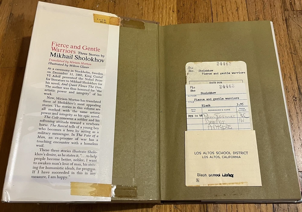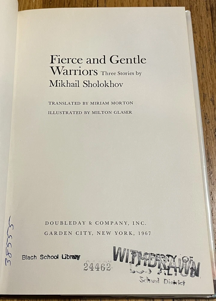 Fierce and Gentle Warriors: Three Stories by Mikhail Sholokhov - illus Milton Glaser Hardcover, with dust jacket, 1967, ex-library with pocket, stamps, stickers