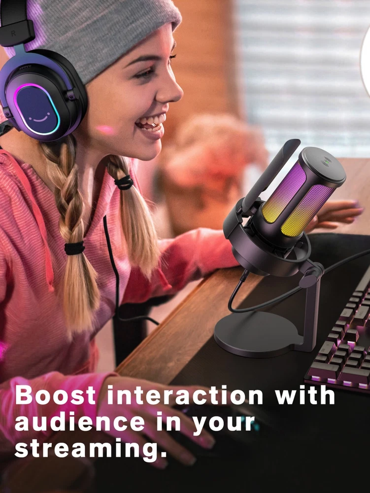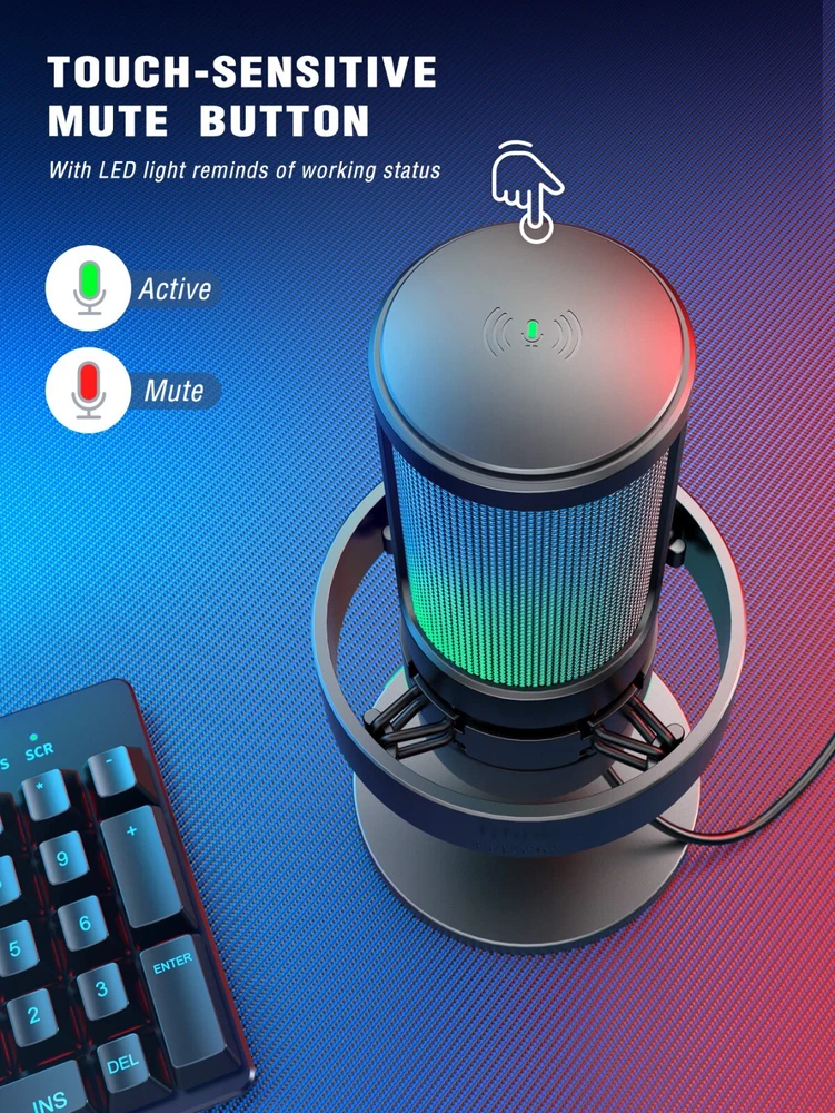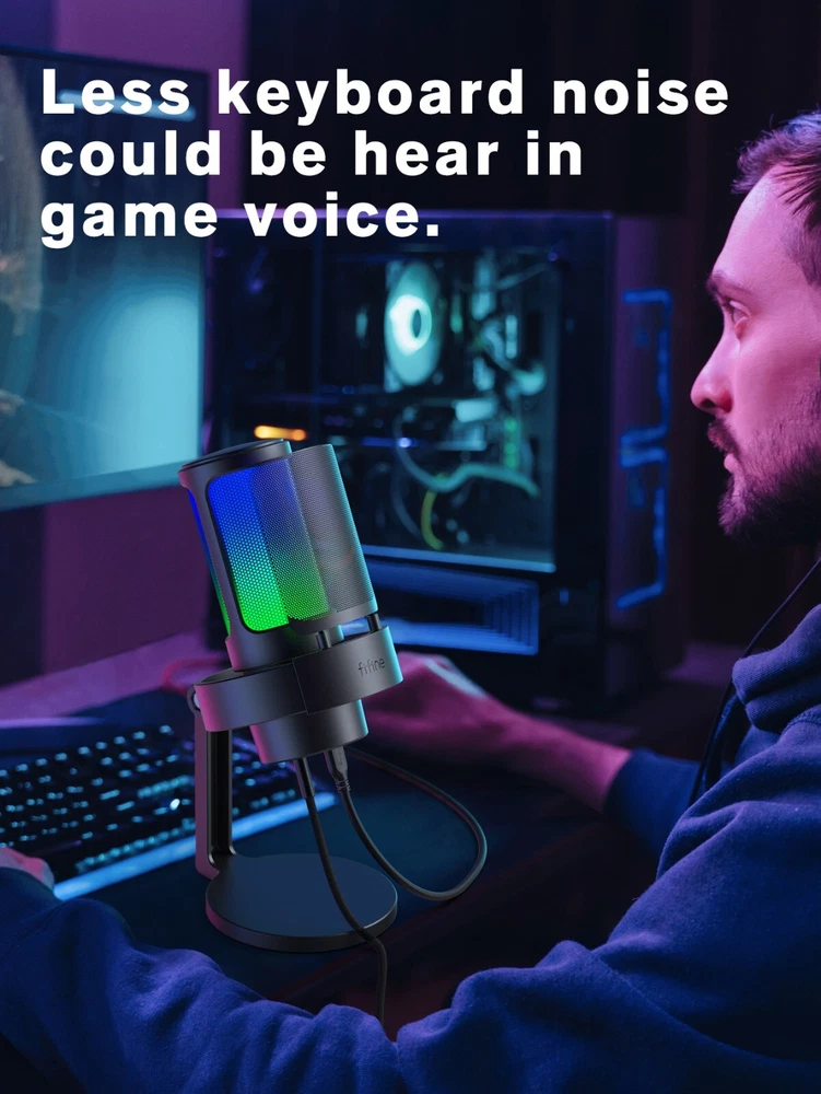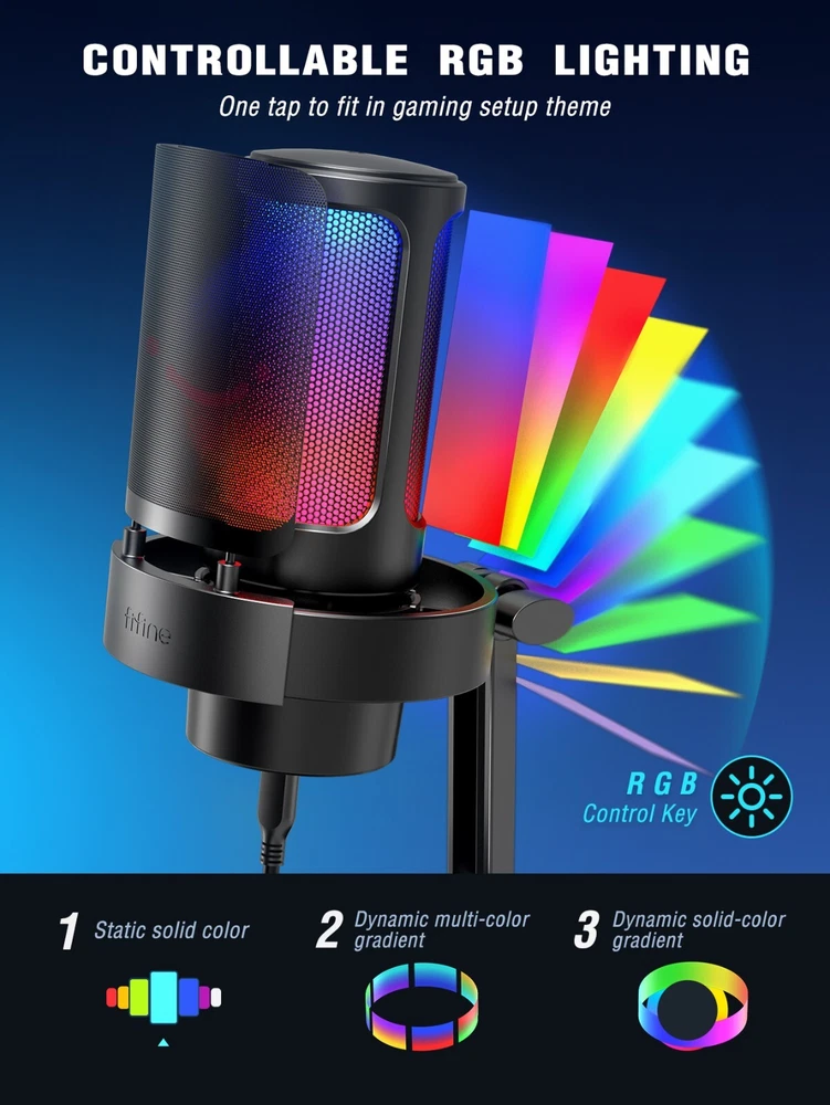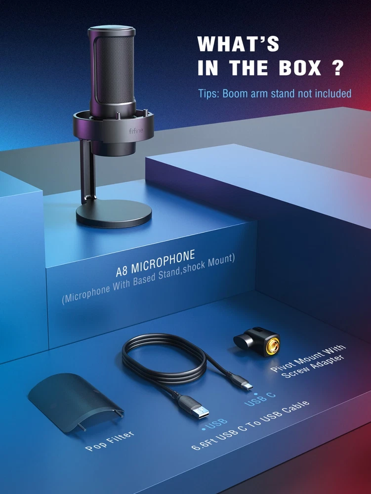 Features: [ Perfect Recording Performance ] The A8 featured with professional cardioid polar patternthat captureing your voice perfectly and accurately,focusing on optimizing the sound output and deliveringexceptional sound quality. With a powerful compatibilitymode,whether you connect this mic with your desktopcomputer or laptop, it works smoothly. [ Epic Level of RGB Ambience ] The dynamic RGB of the A8 microphone works well toyour gaming setup to present the ambience of the gameand visually pleasing. Featuring RGB lighting and a light-touch RGB button, the A8 allows you to customise andtoggle the colours according to your preference. [ Experience Visual Volume Control ] Mute the microphone instantly with a single touch thatexperience hassle-free operation with the touch-sensitive mute key, The LED indicators are designed tohelp you quickly determine if the microphone is on the airor not. Plug in your headphones and listen to yourrecordings without latency. It also offers convenientcontrol over sound levels, thanks to its mic volume knoband monitor headphone volume knob. [ Clever Design for Better Recording ] The pop filter of A8 mainly made of metal and its double-layered anti-spray design minimizes environmental noise,ensuring more delicate and clear audio recording.Additionally, it is equipped with anti-vibration mounts forenhanced stability during use and reduces noise fromequipment vibration. [ Multi-device Compatibility for Easier Use ] Plug and play, providing user-friendly design,thismicrophone is compatible with PC, laptop, PS4, and PS5making it suitable for a wide range of devices. Whetheryou're gaming or live streaming, the FlFINE A8 is theperfect choice to enhance your audio and take yourgaming experience to the next level. Warm Tips: 1. Plug and play gaming USB microphone for PC/Macbook/laptop and it works well with PS4/PS5. (Incompatible with Xbox). 2. This USB gaming microphone can work with Macbook, you can plug the mic in Macbook and go to "system preference"-"Sound"-click "Input" and set "Fifine Microphone" as default input device. 3. You can tap the RGB button to change the RGB light color, and you can long press the RGB button for 3 seconds to turn on/off the RGB light. Specifications: Type: Condenser Polar Pattern: Cardioid Output Connection: USB Frequency Response: 50-20kHz Audio Sensitivity: -40±3dB Power Supply: 5V Operating Current: 200mA Package included: 1X Microphone with Based Stand, Shock Mount and Pop Filter 1X Pivot Mount with Screw Adapter 1X 6.5ft(2m) USB C to USB Cable 1X User Manual Contact us : 1. If you have any questions please contact us by email, most emails are responded within 24 business hours. 2. Please send email directly or try send email by other account. The feedback forum is not the place to leave us a message. If you never hear from us please go to your "Inbox" under eBay "My Messages" section to look for our messages as we always send our messages directly through eBay to your email account and you can always find our messages there regardless of what email problems you may experience.