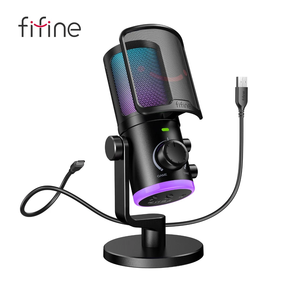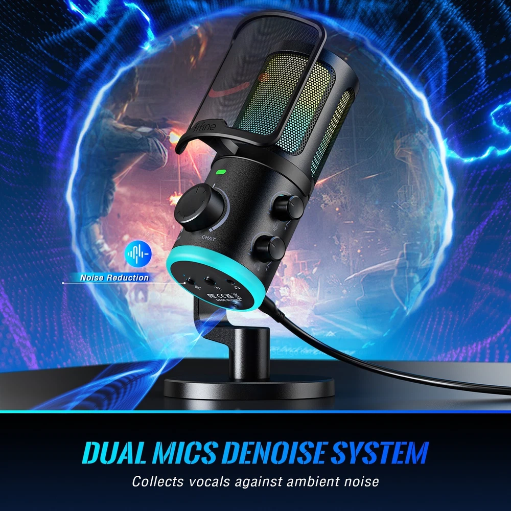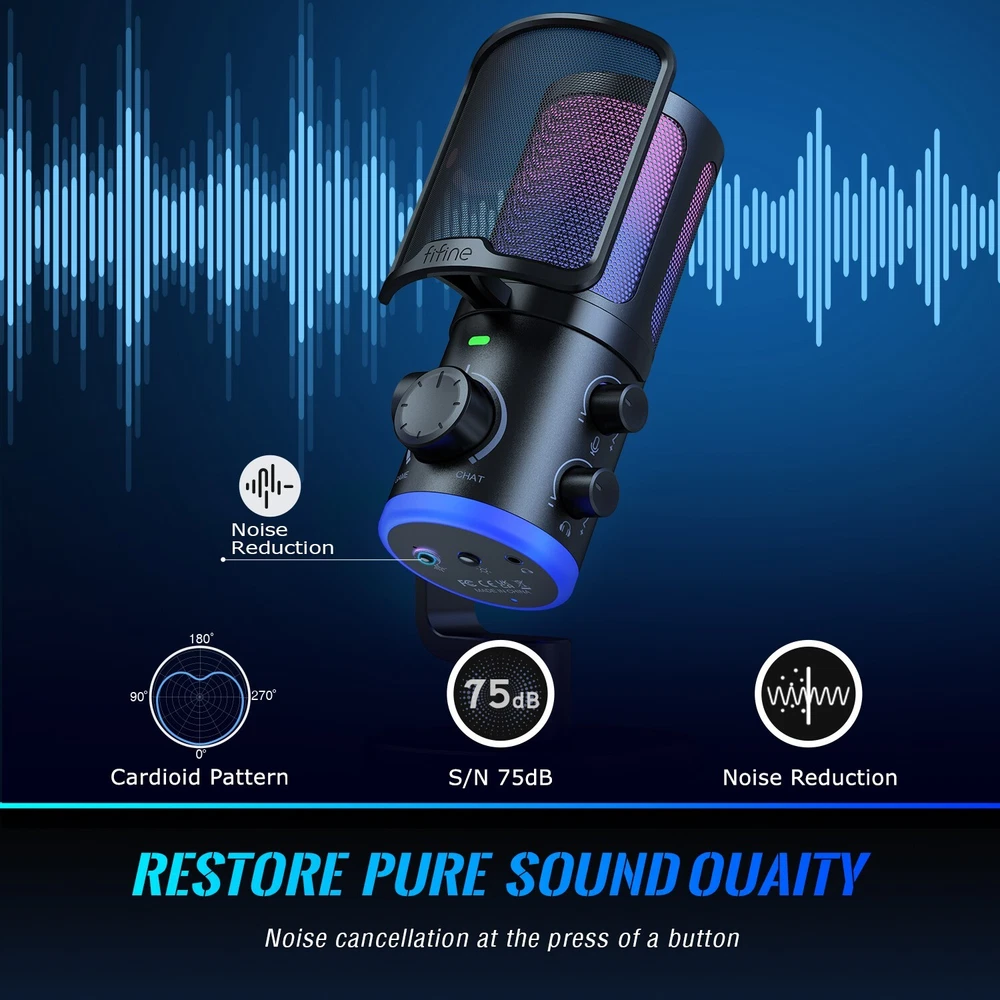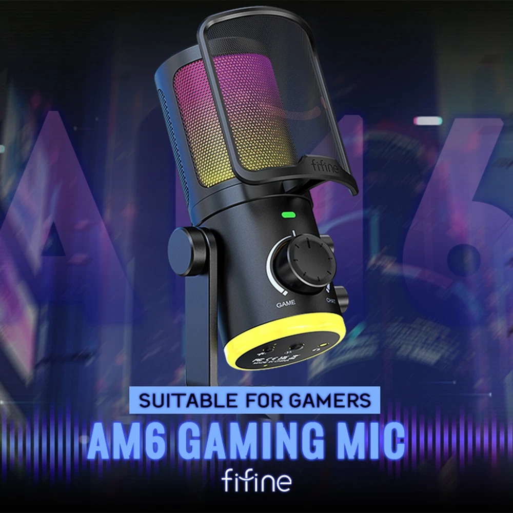 Features: [ Noise-Cancelling for Pure Sound ] Experience pristine audio with our advanced noise.cancelling technology. The condenser mic capsulecombined with a cardioid pickup pattern, deliverssmooth,high-sensitivity sound, capturing vocal nuanceswith remarkable clarity-even the softest whispers.Equipped with one-touch noise reduction technology, theFlFINE AM6 minimizes environmental noise,ensuring amore refined and detailed recording experience. [ Seamlessly Balance Game and Chat Volume ] Finding the perfect balance between game immersionand team communication has never been easier. Tired ofgame sound effects drowning out your teammatesvoices? With AM6, you're in control. Simply adjust theknob to GAME for full immersion in the captivating worldof game sound effects. Need to focus on teamwork? Switch it to CHAT, and your teammates' voices will comethrough crystal clear. [ Total Function Control with AM6 ] Equipped with a 3.5mm headphone jack, you can monitoryour audio in real-time, effortlessly adjusting mic andmonitor volumes with intuitive knobs. Plus, enjoy theconvenience of a touch-sensitive mute button located ontop, complete with an LED indicator for seamless controlover your audio experience. [ llluminate Your Gaming Space with Dazzling RGB Lighting ] The AM6 USB microphone boasts dual light effects withtop and bottom lighting design, adding an electrifyingambiance to your gaming setup. Control the vibrant RGBlights to elevate your gaming experience. The RGBlighting on the streaming mic complements your LED walllights and PC's dynamic colors, while the subtle RGBunderneath the mic harmonizes with your glowing mouseand keyboard. Transform your computer setup into avivid light show with AM6 microphone. You can long press and hold for 3 seconds to turn on or off RGB lighting without affecting the work of the mic. And short press to select 4 kinds of RGB mode and over 10 colors of RGB light. [ More Device Compatibility ] This USB microphone is compatible with Windows PCcomputer laptop, Mac, and PS4/5 that whether you'regaming or streaming, this microphone is the perfectcompanion. Warm Tips: 1. T his PC USB microphone is not compatible with Xbox, but works with desktop, laptop, PS4/PS5. Game/Chat balanced knob function is onlyapplicable to desktop, laptop or Mac, but unavailable for PS4/PS5. 2. Real-time monitoring is not activated by default on PC setup. Follow steps to activate real-time monitoring on PC. Click “Playback” tab from the Sound Panel-Double click “fifine Chat”-Levels-Click the speaker icon of microphone level to activate. 3. It is recommended to keep speaking to the top of this computer gaming microphone within 2-6 inches(5-15cm) to capture loud and clear sound quality, you have to turn the gain knob to a proper level before you use it. Specifications: Type: Condenser Polar Pattern: Cardioid Output Connection: USB Frequency Response: 70 -20 kHz Sensitivity: -42dB±3dB S/N Ratio: 75dB A+ Package included : 1 * Condenser Microphone with Pop Filter and Mic Based Stand 1* 6.5ft (2m) USB C to USB Cable 1* User's Manual Contact us : 1. If you have any questions please contact us by email, most emails are responded within 24 business hours. 2. Please send email directly or try send email by other account. The feedback forum is not the place to leave us a message. If you never hear from us please go to your "Inbox" under eBay "My Messages" section to look for our messages as we always send our messages directly through eBay to your email account and you can always find our messages there regardless of what email problems you may experience.