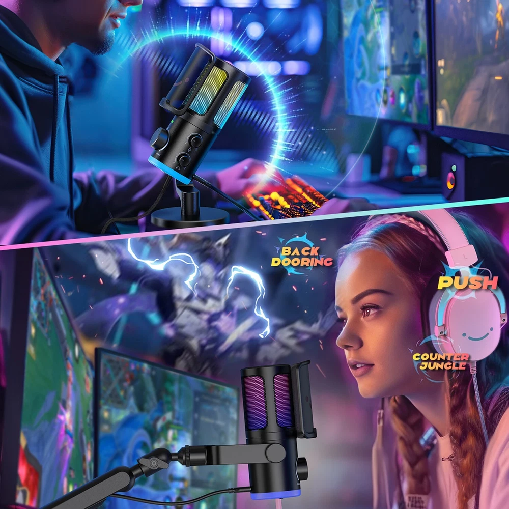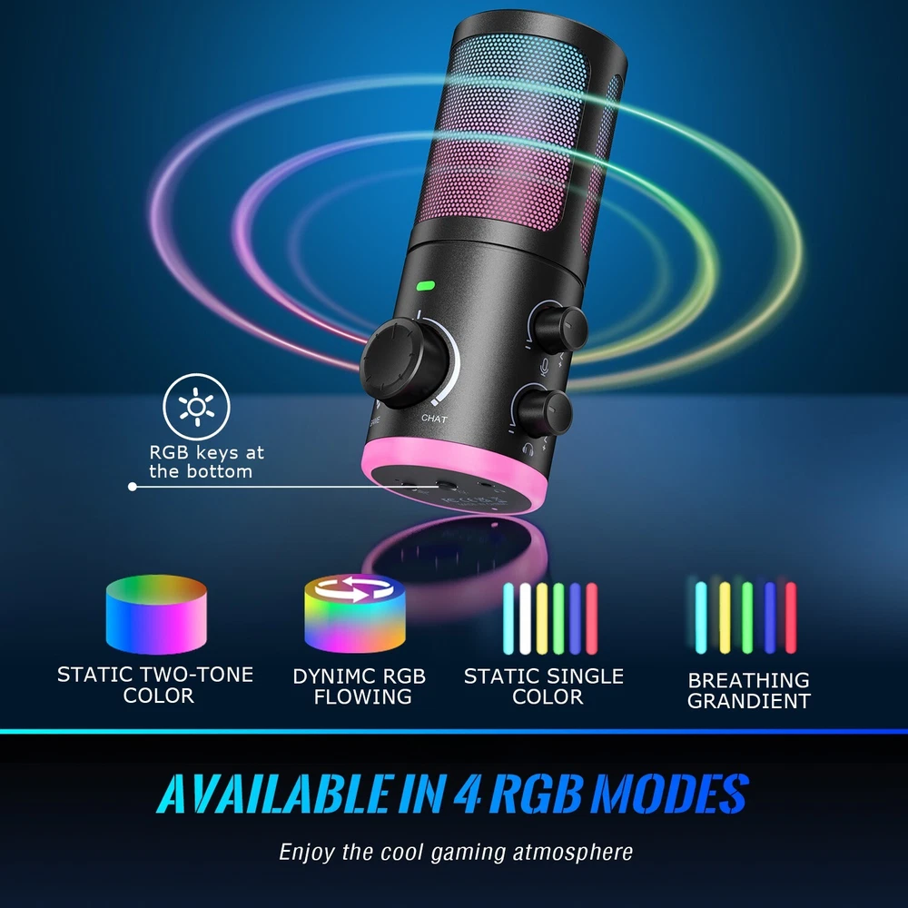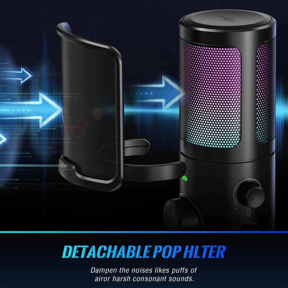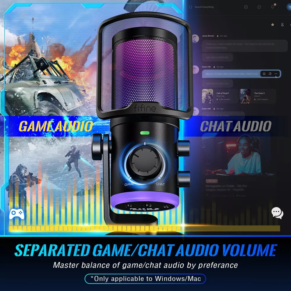 Features: [ Noise-Cancelling for Pure Sound ] Experience pristine audio with our advanced noise.cancelling technology. The condenser mic capsulecombined with a cardioid pickup pattern, deliverssmooth,high-sensitivity sound, capturing vocal nuanceswith remarkable clarity-even the softest whispers.Equipped with one-touch noise reduction technology, theFlFINE AM6 minimizes environmental noise,ensuring amore refined and detailed recording experience. [ Seamlessly Balance Game and Chat Volume ] Finding the perfect balance between game immersionand team communication has never been easier. Tired ofgame sound effects drowning out your teammatesvoices? With AM6, you're in control. Simply adjust theknob to GAME for full immersion in the captivating worldof game sound effects. Need to focus on teamwork? Switch it to CHAT, and your teammates' voices will comethrough crystal clear. [ Total Function Control with AM6 ] Equipped with a 3.5mm headphone jack, you can monitoryour audio in real-time, effortlessly adjusting mic andmonitor volumes with intuitive knobs. Plus, enjoy theconvenience of a touch-sensitive mute button located ontop, complete with an LED indicator for seamless controlover your audio experience. [ llluminate Your Gaming Space with Dazzling RGB Lighting ] The AM6 USB microphone boasts dual light effects withtop and bottom lighting design, adding an electrifyingambiance to your gaming setup. Control the vibrant RGBlights to elevate your gaming experience. The RGBlighting on the streaming mic complements your LED walllights and PC's dynamic colors, while the subtle RGBunderneath the mic harmonizes with your glowing mouseand keyboard. Transform your computer setup into avivid light show with AM6 microphone. You can long press and hold for 3 seconds to turn on or off RGB lighting without affecting the work of the mic. And short press to select 4 kinds of RGB mode and over 10 colors of RGB light. [ More Device Compatibility ] This USB microphone is compatible with Windows PCcomputer laptop, Mac, and PS4/5 that whether you'regaming or streaming, this microphone is the perfectcompanion. Warm Tips: 1. T his PC USB microphone is not compatible with Xbox, but works with desktop, laptop, PS4/PS5. Game/Chat balanced knob function is onlyapplicable to desktop, laptop or Mac, but unavailable for PS4/PS5. 2. Real-time monitoring is not activated by default on PC setup. Follow steps to activate real-time monitoring on PC. Click “Playback” tab from the Sound Panel-Double click “fifine Chat”-Levels-Click the speaker icon of microphone level to activate. 3. It is recommended to keep speaking to the top of this computer gaming microphone within 2-6 inches(5-15cm) to capture loud and clear sound quality, you have to turn the gain knob to a proper level before you use it. Specifications: Type: Condenser Polar Pattern: Cardioid Output Connection: USB Frequency Response: 70 -20 kHz Sensitivity: -42dB±3dB S/N Ratio: 75dB A+ Package included : 1 * Condenser Microphone with Pop Filter and Mic Based Stand 1* 6.5ft (2m) USB C to USB Cable 1* User's Manual Contact us : 1. If you have any questions please contact us by email, most emails are responded within 24 business hours. 2. Please send email directly or try send email by other account. The feedback forum is not the place to leave us a message. If you never hear from us please go to your "Inbox" under eBay "My Messages" section to look for our messages as we always send our messages directly through eBay to your email account and you can always find our messages there regardless of what email problems you may experience.