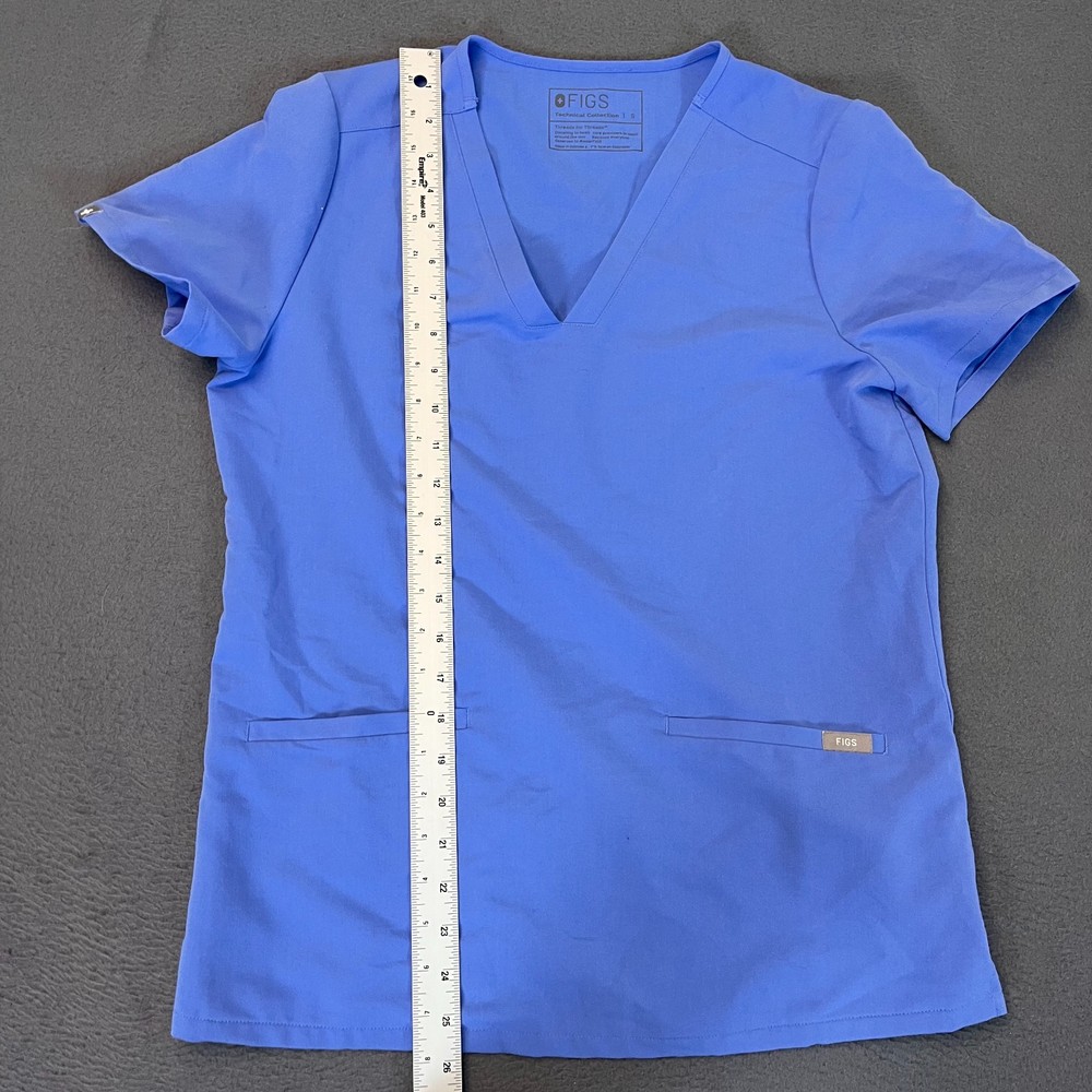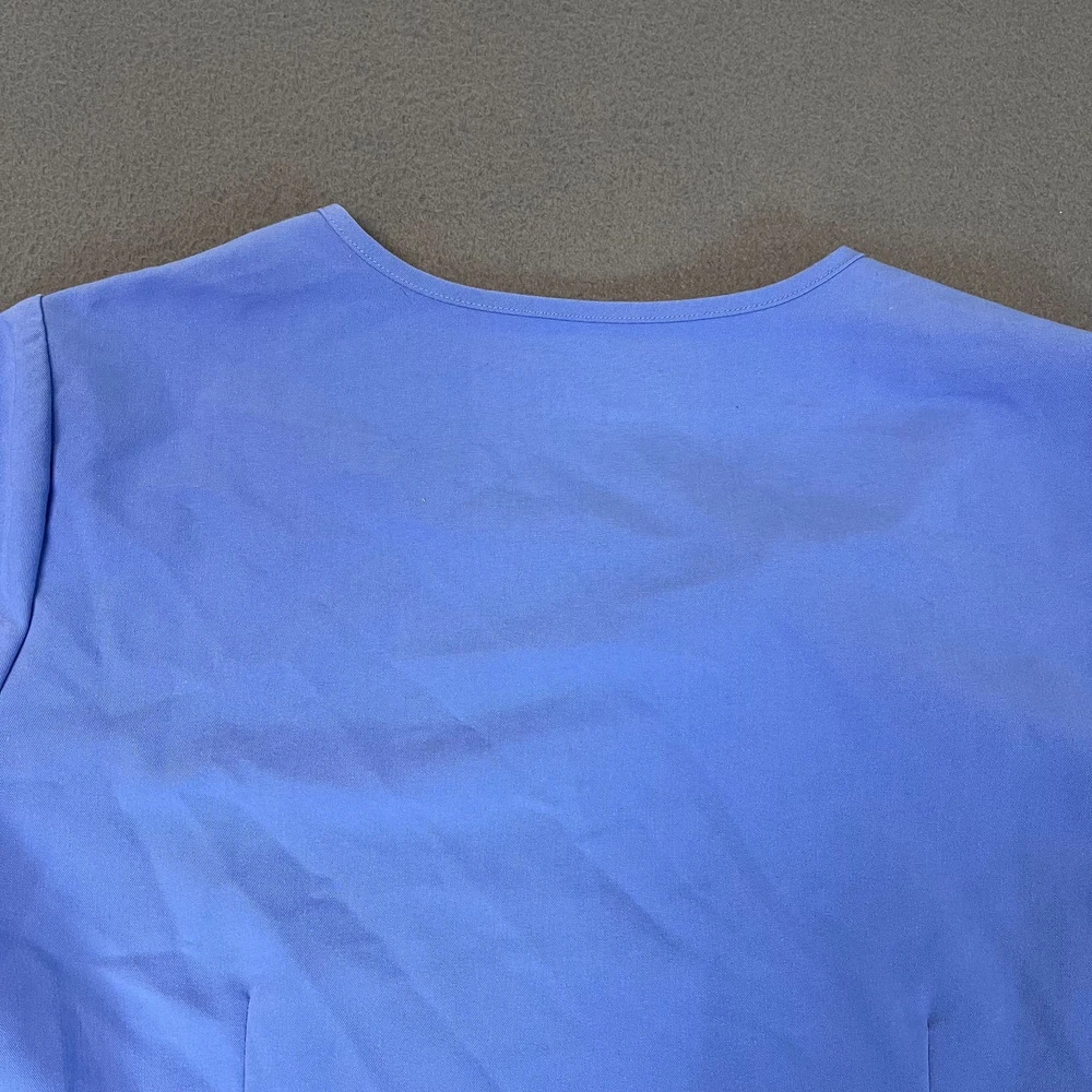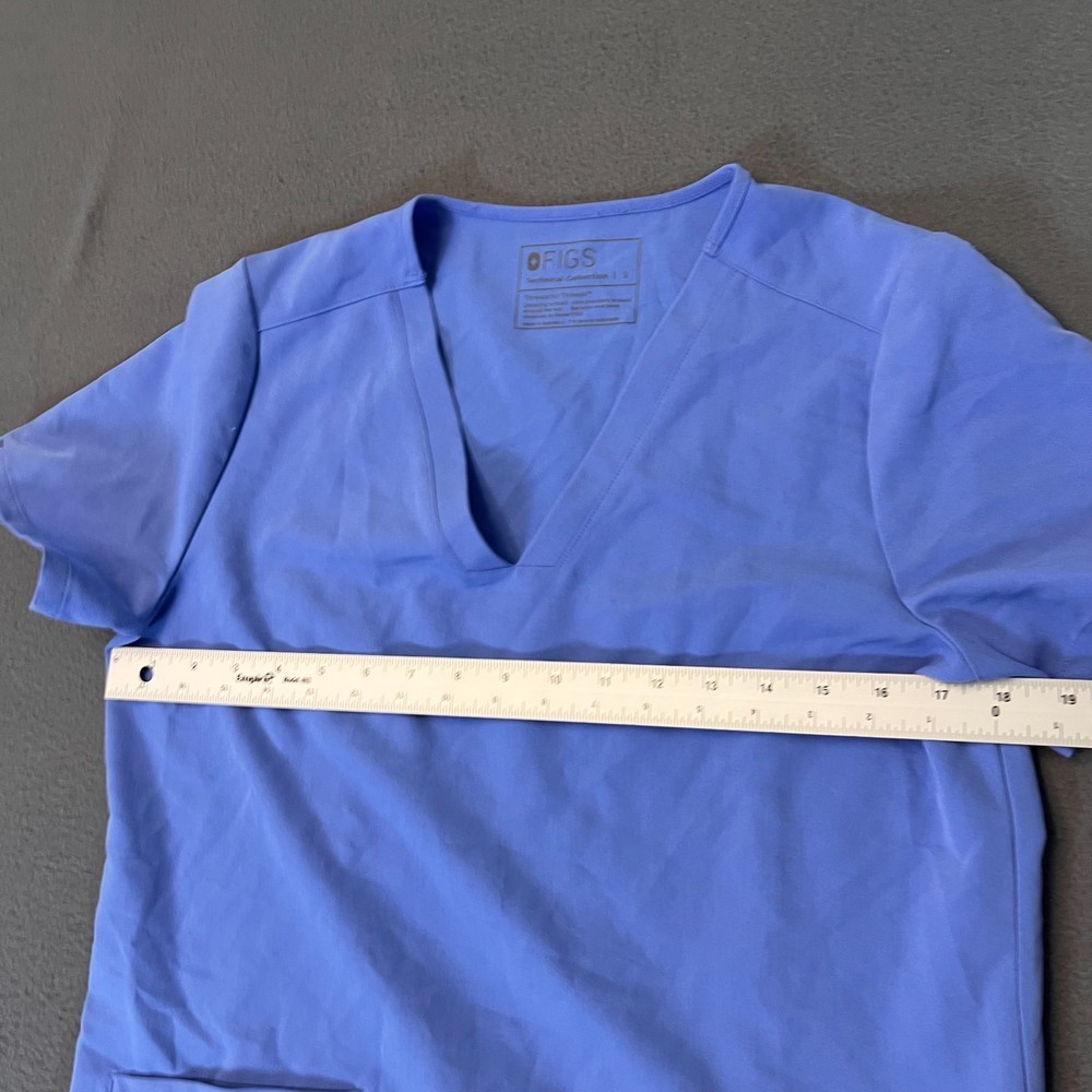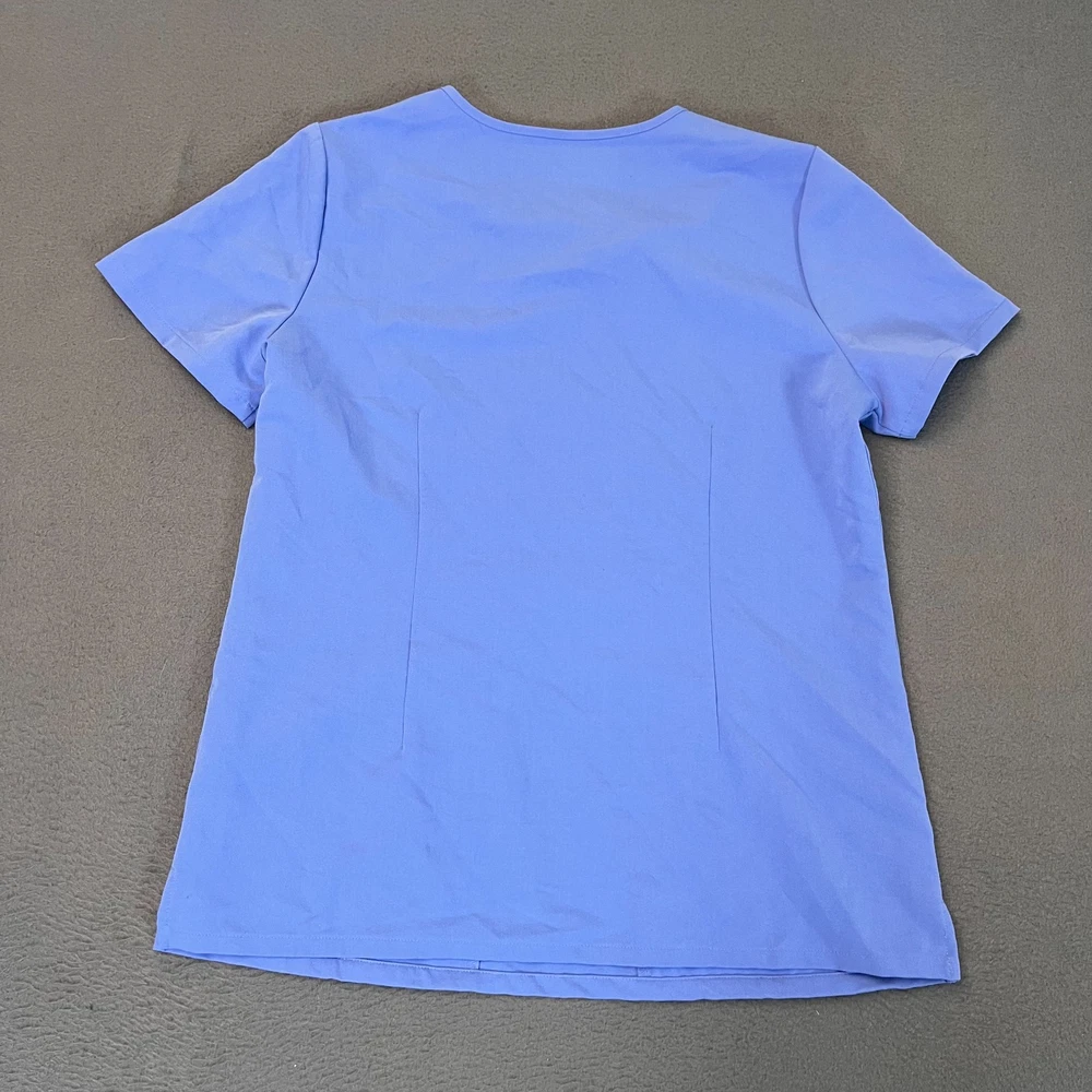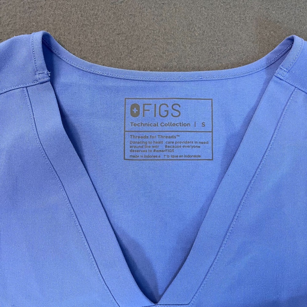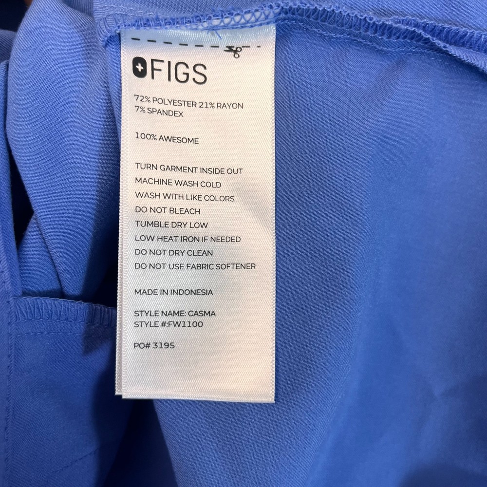 The FIGS Casma Scrub Top in Women's Small, designed for the medical industry, offers a stylish and functional option for nursing professionals. Made from durable polyester material, this solid blue top features front pockets for added convenience. With its high-quality construction and brand reputation, this FIGS scrub top provides both comfort and practicality for those in the healthcare field. Made in Indonesia, this top is a reliable choice for those looking for a dependable and comfortable option for their work.