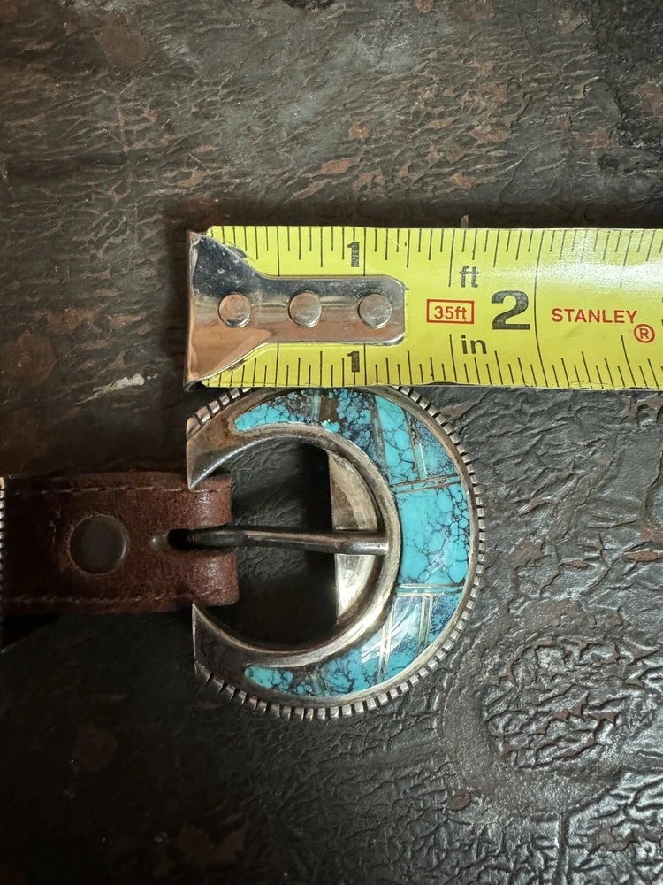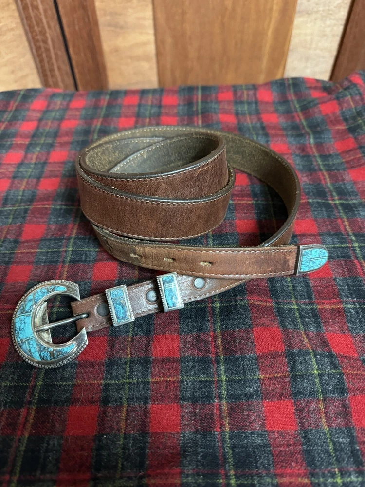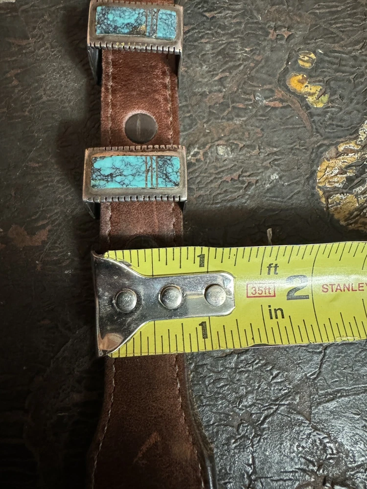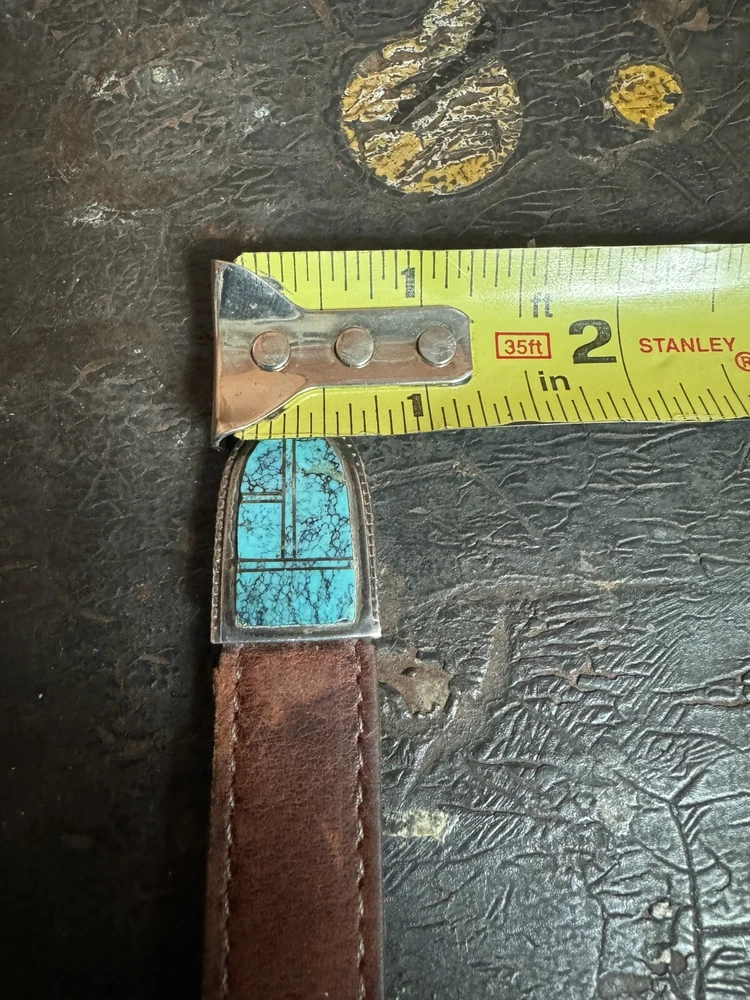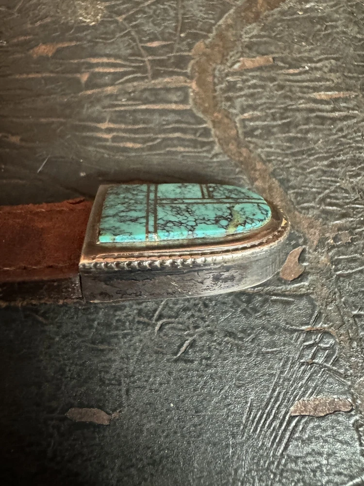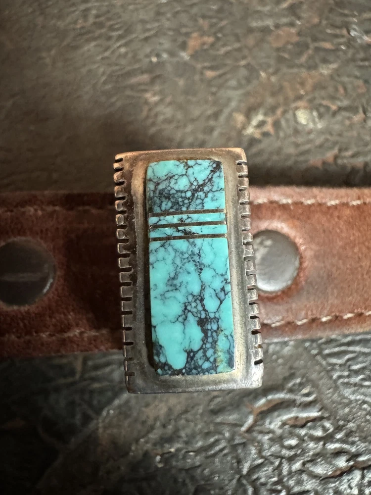 Signed FIJ 925 Sterling Silver Turquoise Inlay 4 Piece Belt Buckle Set. Buckle, 2 keepers and tip. Measurements provided in photos which act as description. Fits 3/4” belt. Very good condition. I don’t know if the tip was manufactured to open for removal but one end of the back strap is disconnected(photos provided). May have been constructed as such. I don’t know. I don’t see how it could have been removed from a belt had this not been done. At any rate, full disclosure. Hardware is currently installed on an Oil Tanned Harness Leather Belt, size 42. The ends are 3/4” wide and the body is 1.25”. The belt is 48” long. Very few pictures of the belt because I wanted to highlight the buckle set. The belt is in very good condition, solid brown. We aim to please! Thanks for looking!