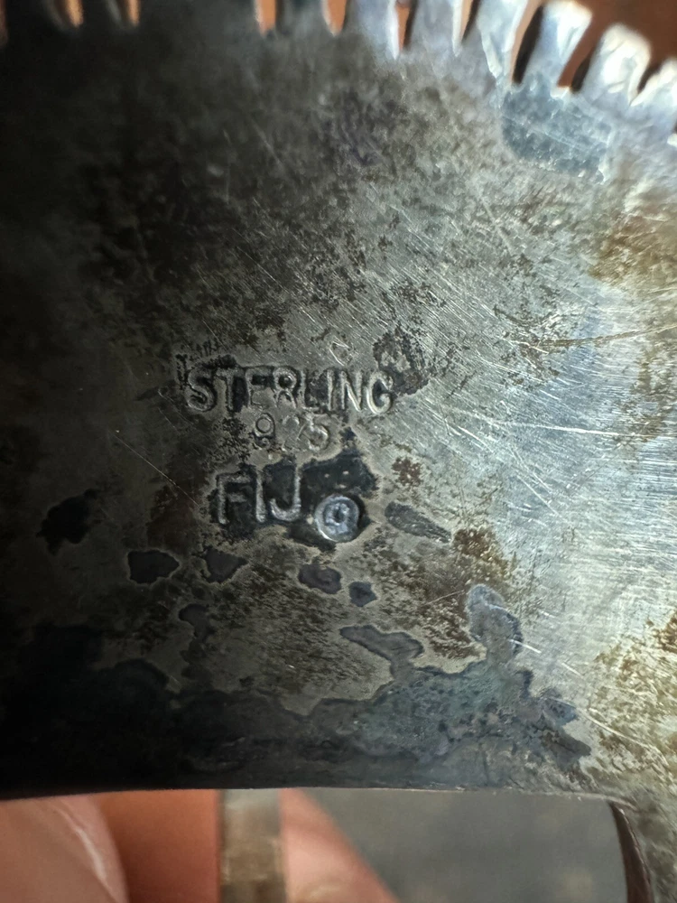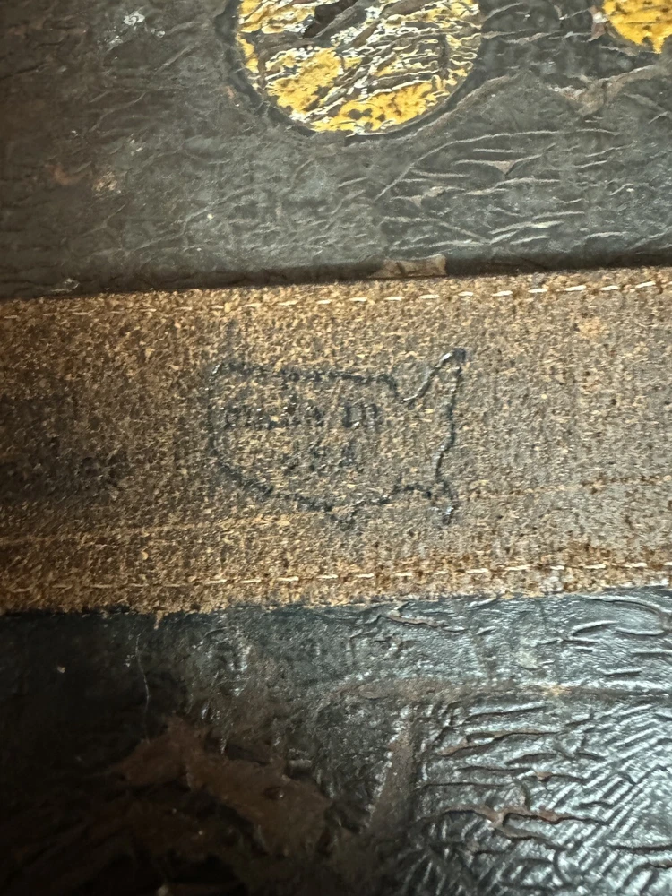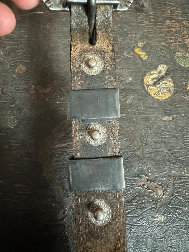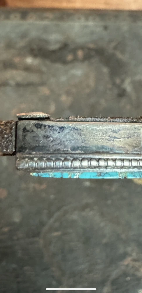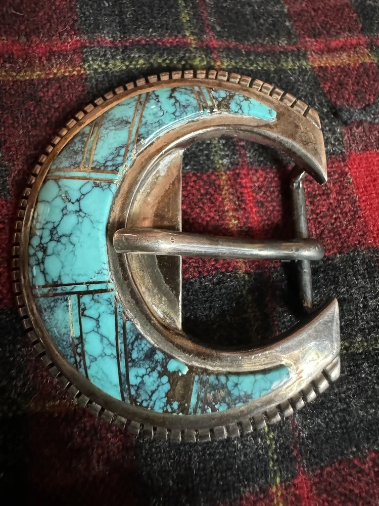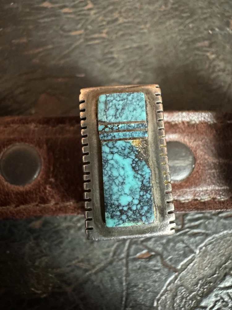 Signed FIJ 925 Sterling Silver Turquoise Inlay 4 Piece Belt Buckle Set. Buckle, 2 keepers and tip. Measurements provided in photos which act as description. Fits 3/4” belt. Very good condition. I don’t know if the tip was manufactured to open for removal but one end of the back strap is disconnected(photos provided). May have been constructed as such. I don’t know. I don’t see how it could have been removed from a belt had this not been done. At any rate, full disclosure. Hardware is currently installed on an Oil Tanned Harness Leather Belt, size 42. The ends are 3/4” wide and the body is 1.25”. The belt is 48” long. Very few pictures of the belt because I wanted to highlight the buckle set. The belt is in very good condition, solid brown. We aim to please! Thanks for looking!