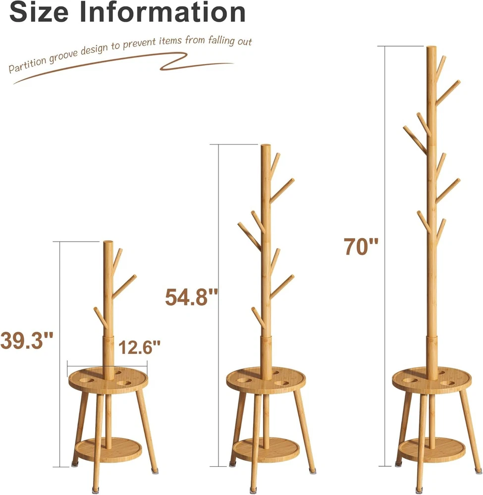 【Quality Material】Made of high quality material through cold pressing, high temperature hot pressing and 3 times polishing process to bring you a sturdy and stable coat rack 【Heavy Duty Construction Strong And Stable】Sturdy material keeps the coat rack balanced and won't topple over, allowing you to hang handbags, briefcases, laptop bags, hats, purses, backpacks, silk scarves, ties, umbrellas 【Multi-Functional Coat Rack With Tray For Umbrella Storage】The tray can also hold bags, decorations, plants, photo frames, trophies, books and other items. Multiple colors can match the room freel 【Easy To Install】Easily free your hands, the branch hooks of the coat rack are equipped with metal screw holes, the bracket can be easily assembled without tools. Only one screw is needed at the bottom Color Nature Material Bamboo Recommended Uses For Product Coats Product Dimensions 12.6"D x 12.6"W x 70"H On Dec 20, 2024 at 23:48:40 PST, seller added the following information: On Feb 21, 2025 at 00:44:06 PST, seller added the following information: