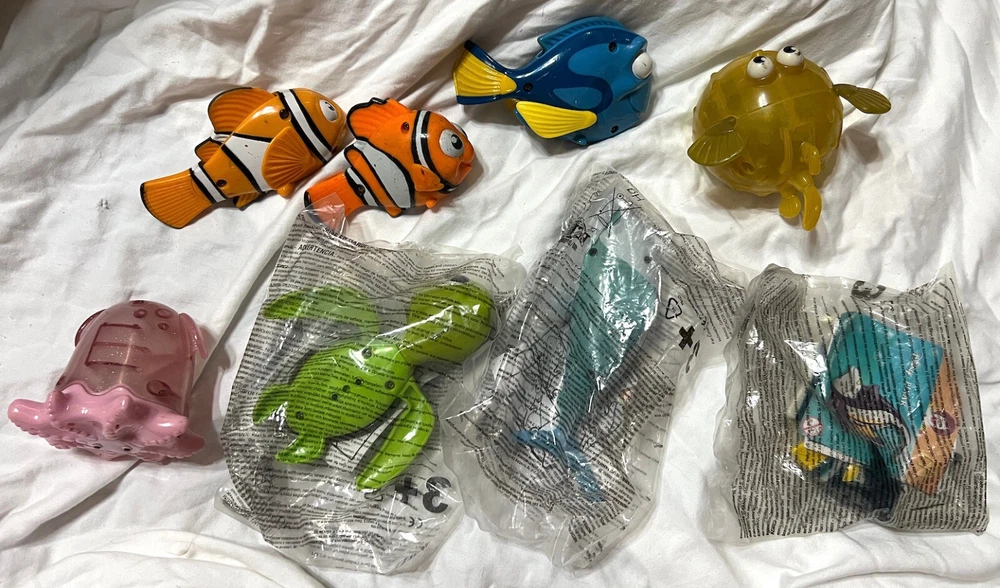 HEY YOU GUYS!!! from McDonald’s 2003 promotion for Disney Pixar’s FINDING NEMO , It's a COMPLETE Mixed set of 8 , (5 loose & 3 new) Happy Meal toys. This vintage set of hard plastic collectables is great for appreciating, being nostalgic, collecting, displaying, investing in, playing with and can even be used as 🎂 Cake Toppers, Decorations or Ornaments . 3 of the 8 are still in their ORIGINAL UNOPENED PLASTIC BAGs. (Better buy them quick before they suffocate in there!) 😆 This set of 8 includes 1 of each of the following: MARLIN NEMO DORY BLOAT PEARL SQUIRT BRUCE G I L L ***Please note: Toys & original unopened 21 year old plastic bags do show some signs of wear; Please review all the photos carefully for condition before purchasing. *** ***Also note: Due to the length of time these items have been sealed in there original unopened plastic bags, I CAN NOT guarantee any included batteries will still be operational*** e b a y may add state sales tax to your final total depending on your location. Orders are sent well padded, tracked & delivery confirmed via USPS shipping & handling. Combined item $ hipping is your best value and $ave$ money on multiple item purchases! To take full advantage of combined / discounted shipping for multiple item purchases, please add each item to your shopping cart before checking out. Click here to see all the Toys, Comics, Cards & other cool vintage stuff in my thomaszr e b a y store. Can’t find what you are looking for? Send me a message and if I have it I will list it for you. Thanks for l 👀 king; ENJOY! 😁