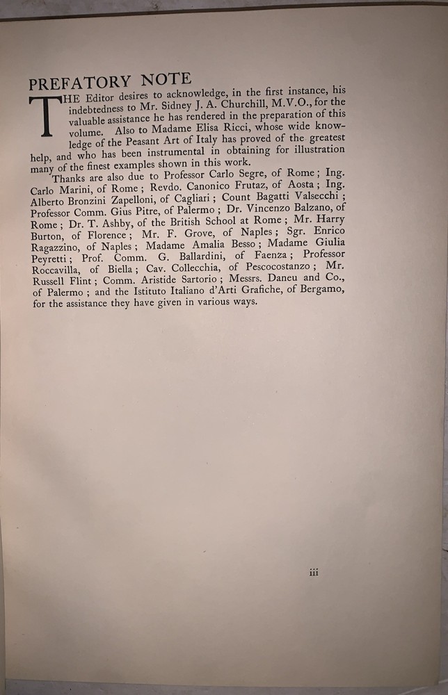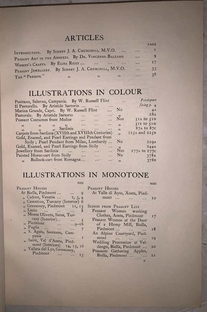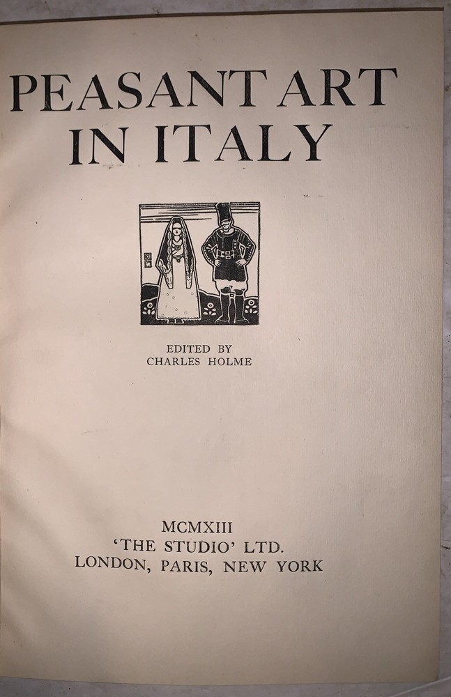 Peasant Art in Italy Edited by Charles Holme London, Paris, New York: The Studio Ltd 1913 First Edition Quarto, finely bound in half leather over green cloth covered boards, signed by the binder "Bound by Oldach Co. / Philadelphia." Small raised bands and gilt lettering and decoration to spine. Top edge gilt. Profusely illustrated throughout. Some slight rubbing and wear, spine slightly sunned, some occasional light scattered foxing, else in very good condition. Peasant Art in Italy, edited by Charles Holme and published in 1913, is an important early 20th-century study of Italian vernacular and folk design, documenting traditional textiles, ceramics, woodcarving, metalwork, and domestic decorative arts at a moment when such material was being newly appreciated by artists, designers, and scholars. Issued under the direction of Holme—best known for his work with The Studio—the volume reflects contemporary Arts and Crafts–era interest in regional craftsmanship and indigenous aesthetic traditions. This copy has been attractively rebound in signed half leather by Oldach & Co., an American fine-binding firm active in the early 1900s, adding both visual appeal and collectible significance. The combination of authoritative content and a documented period binding make this an especially desirable example for collectors of design history, folk art, and fine bindings. If you have any questions, feel free to ask, and don't forget to check out my other listings.