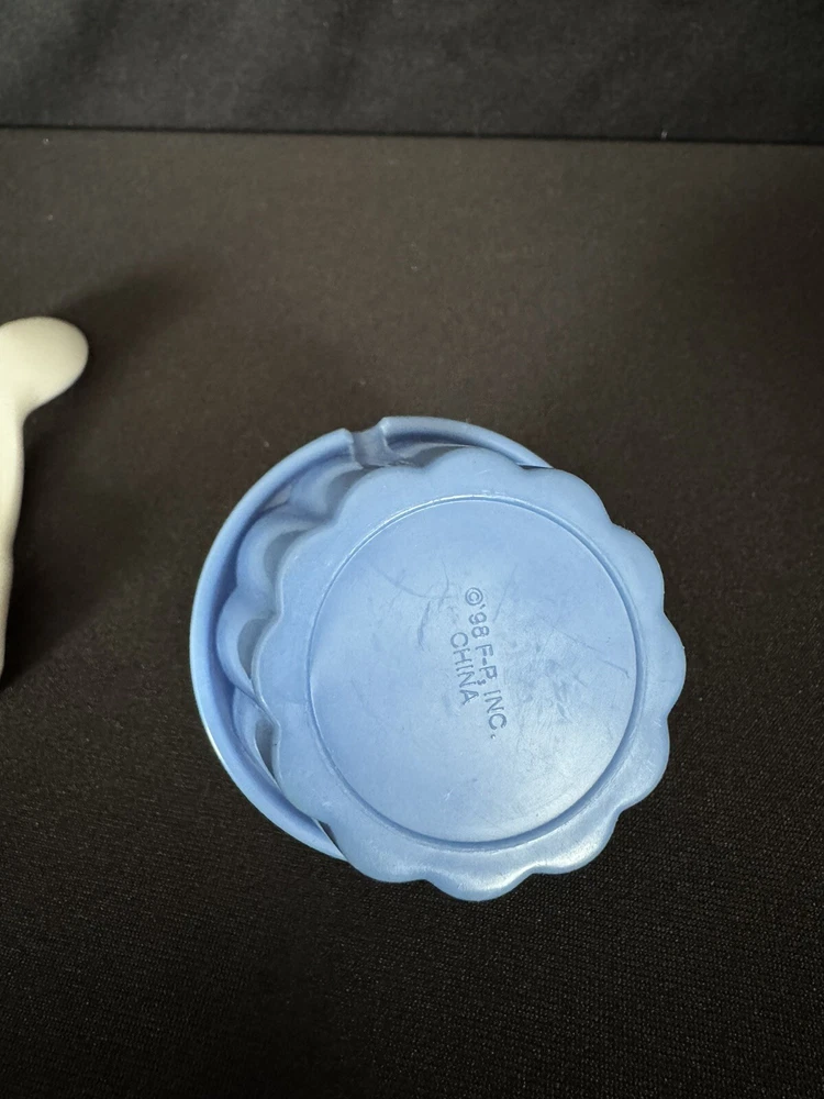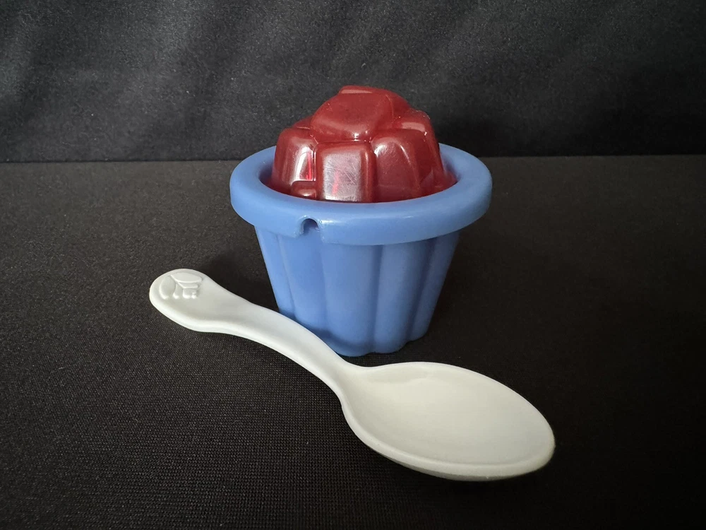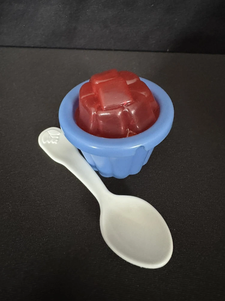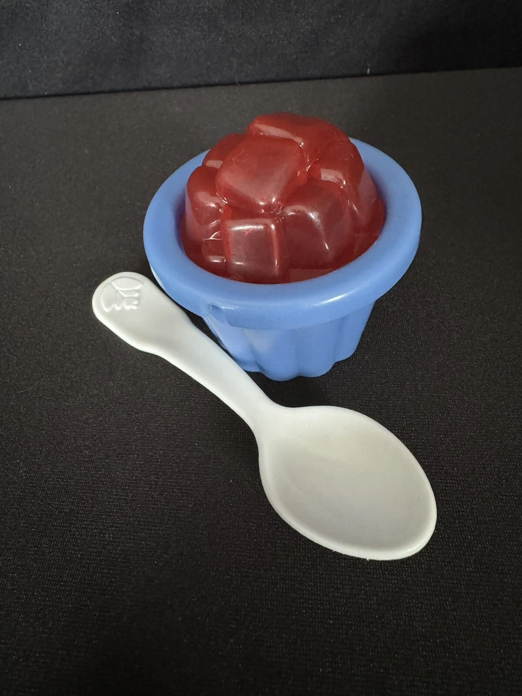 The Fisher-Price Fun Food Jello Squares Cup Dessert set from 1998 features a hard-to-find white flower spoon. This vintage Fisher-Price toy is part of the Fun Food collection and is a sought-after item for collectors. The set includes Jello squares in a cup, providing a fun and imaginative play experience for children interested in pretend play with food items. EUC