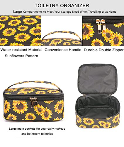 30 Days Return Policy Fast Delivery Trusted seller FITINI Sunflower Makeup Bag 3 Pack Travel Toiletry Bag Portable Cosmetic Pouch Organizer with Small Brush Holders Gold Zipper Waterproof Storage Case for Women and Girls Product Description 3 Pieces Travel Makeup Bag:Including 3 different cosmetic bags allowing you to decide the size of the makeup bag depending on the duration of the trip or size of items;If you need more makeup tools or cosmetics but one bag is overflowing,just take them both on the go which saves your time and space in organizing and packing perfectly Quality Material:Scratch resistant,and water resistant thick soft PU leather and polyester material,easy to clean,nice lining,completed with a sturdy zipper to keep full bag's shape and provide good protection,which ensures your toiletry kit inside stays clean and dry from accidental splashes of water Large Capacity Toiletry Bag:Separate compartments with double zipper design for great organization;Our cosmetic bag is lightweight but has a perfect size,which is enough to carry your makeup accessories;Easily fit into backpack,or carry on crowded suitcase Multifunction:It is a cosmetic bag,travel organizer bag,wash bag,beach bag,toiletry bag,office organizer,travel bag or daily use.Ideal for travel,business trip,vacation,gym,camping,and outdoor activity;Suitable for your family trip to pack all toiletry kits;Wide handle for easy carrying,sturdy stitching and heavy duty material and it can stand up many items Perfect Gift Sets:With sense of design,adorable colors,decent size,which can hold skin care products and various cosmetics;It can be used in daily life or travel;The perfect holiday gift for your family members and friends Shipping Returns Payment Shipping Shipping is FREE to all addresses other than APO/PO boxes in the lower 48 states. All our stock ships from US-based warehouses. Shipped via USPS or UPS (depending on location and package weight) Unless stated otherwise, all orders will ship within 24-72 hours of your payment being processed. Check our feedback to see the great reviews of FAST shipping we offer. Returns As our valued customer, we will do our best to make sure the product you receive arrives to you on time and as expected. If you are not satisfied with your purchase, please contact us within 30 days of receiving your order to process a return. Payment We currently accept payment via eBay managed payments only. Once payment is cleared, we will dispatch your shipment within 1-3 business days. Please refer to the "Shipping" tab for more information regarding shipping speed to your destination.