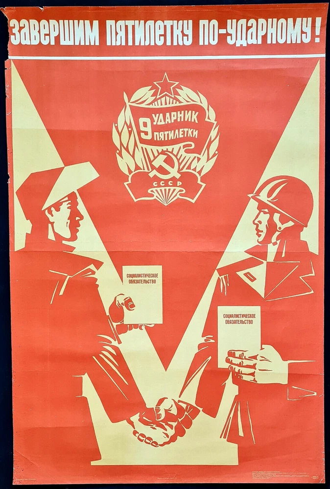 Original slogan on the poster: ЗАВЕРШИМ ПЯТИЛЕТКУ ПО УДАРНОМУ! Literally English translation: LET'S FINISH THE FIVE-YEAR PLANS WITH SHOCK WORK! Inscription on the badge: THE SHOCK WORKER OF THE 9TH FIVE-YEAR PLAN Inscriptions on the books: SOCIALIST OBLIGATIONS POSTER ARTIST: BABIN N. & OVASAPOV I. PRINT YEAR: 1975 SUBJECT: WORKERS OBLIGATIONS LANGUAGE: RUSSIAN PRINT RUN: 95.000 PUBLISHED BY: "PLAKAT", MOSCOW SIZE: IN: 27 ¼ x 40 ¼ = CM: 69 x 102 CONDITION: ROLLED, GOOD The poster was folded one time in the middle, there is creases and paper loses at upper left corner, some tape repairs on the revers, however the poster is in a good overall condition. Before your bid please consider the poster condition from attached pictures and text description, if you still need more information please feel free to require additional pictures or video, it would be my pleasure to assist you with any questions regarding this auction. Shipping folded in a good packed envelope. Please Note: The poster is personally hand signed by three artists - one of the signatures is by Surikov - But can't exactly understand what Surikov, both of famous Soviet artist Pavel Surikov and Alexander Surikov died at 1940s. www.facebook.com/sovietartposters Listing and template services provided by inkFrog