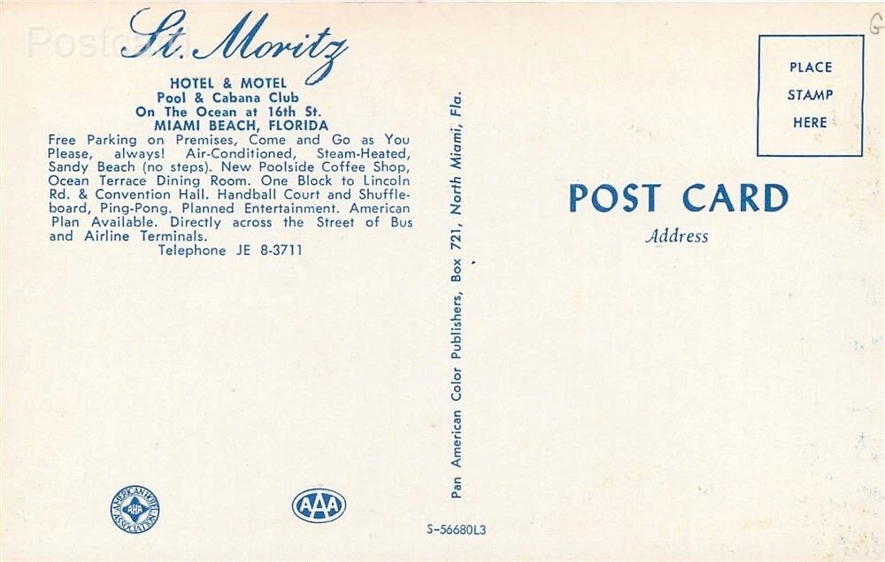 Chrome Postcard Miami Beach, Florida, St. Moritz Hotel Motel Publisher/Printer: Pan American Color No. S-56680L3 Postmark: None Image: Bright and clean Corners: Light wear Faults/Other: SKU: 60934N Powered by SixBit's eCommerce Solution