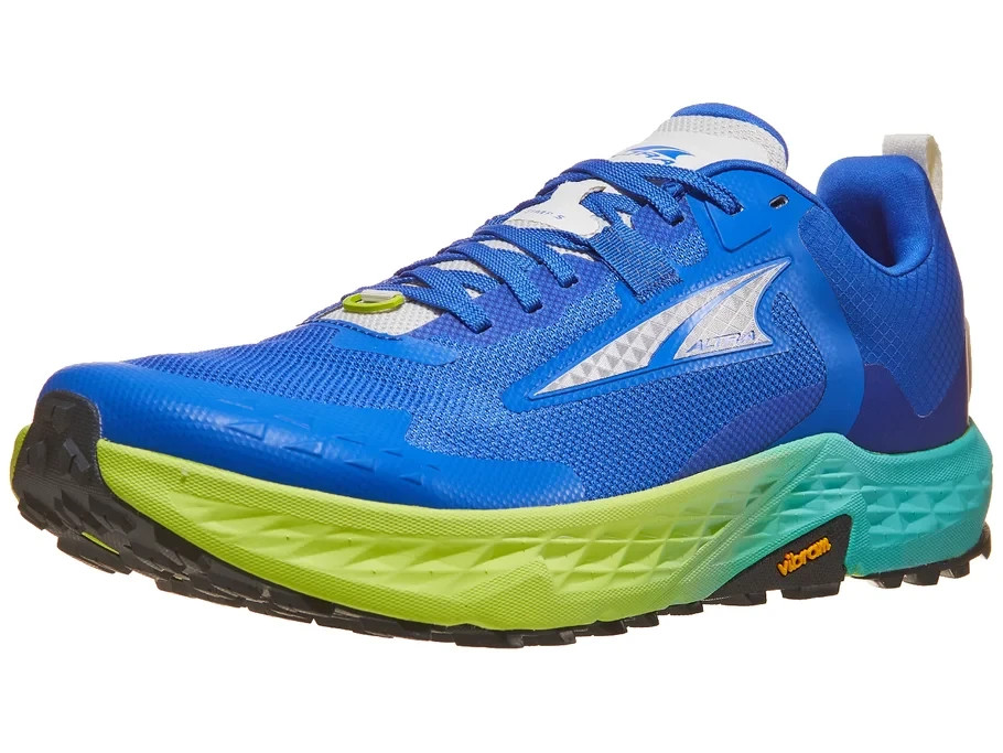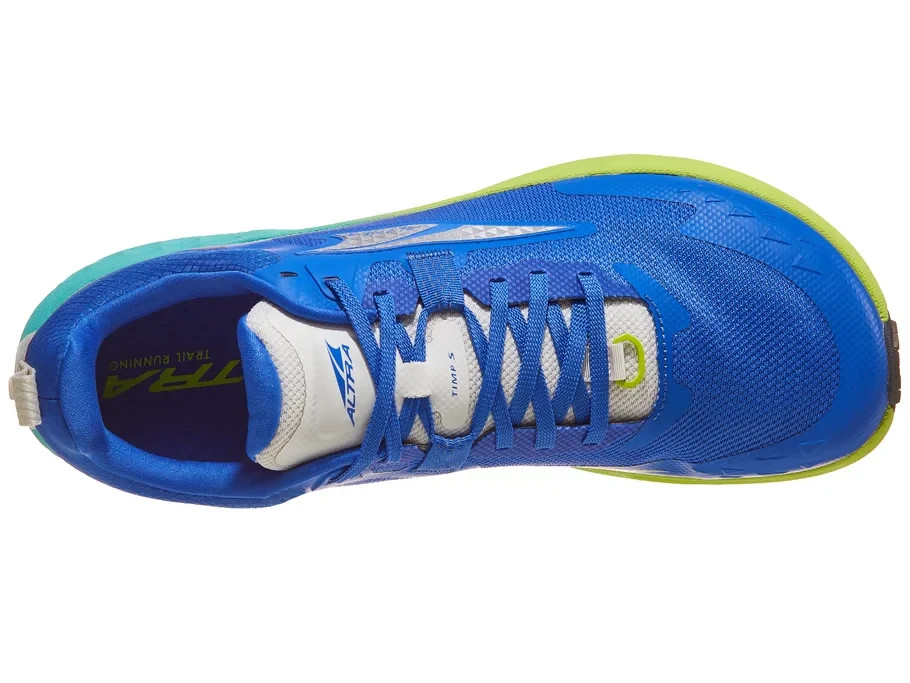 Altra Timp 5 Men's Shoes - Blue/Lime The Altra Timp 5 offers a balance of soft and responsive cushioning that allows it to excel for both long days and daily runs on the trails. The Altra EGO MAX midsole compound has been updated for a more cushioned ride that not only shields the legs from the rugged terrain but also propels runners effortlessly through diverse trails. A key feature of the Timp 5 is its new Vibram outsole that provides unmatched grip on a variety of surfaces and conditions. The strategically carved flex grooves in the rubber further contribute to the shoe's adaptability to ensure a smooth ride on everything from rocky trails to rolling fire roads. The breathable knit upper adds another layer of comfort, while the "Standard" foot shape strikes the perfect balance between the "Original" and "Slim" options that delivers a secure midfoot fit with a slightly roomier toe box. Overall, the Timp 5, with its soft and bouncy ride, will be a great option for casual trail runs, long mountain adventures, and everything in between. What's New: Updated EGO MAX compound Vibram Megagrip outsole