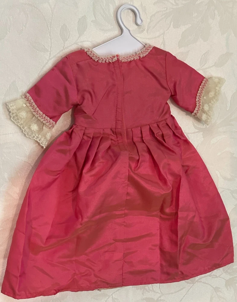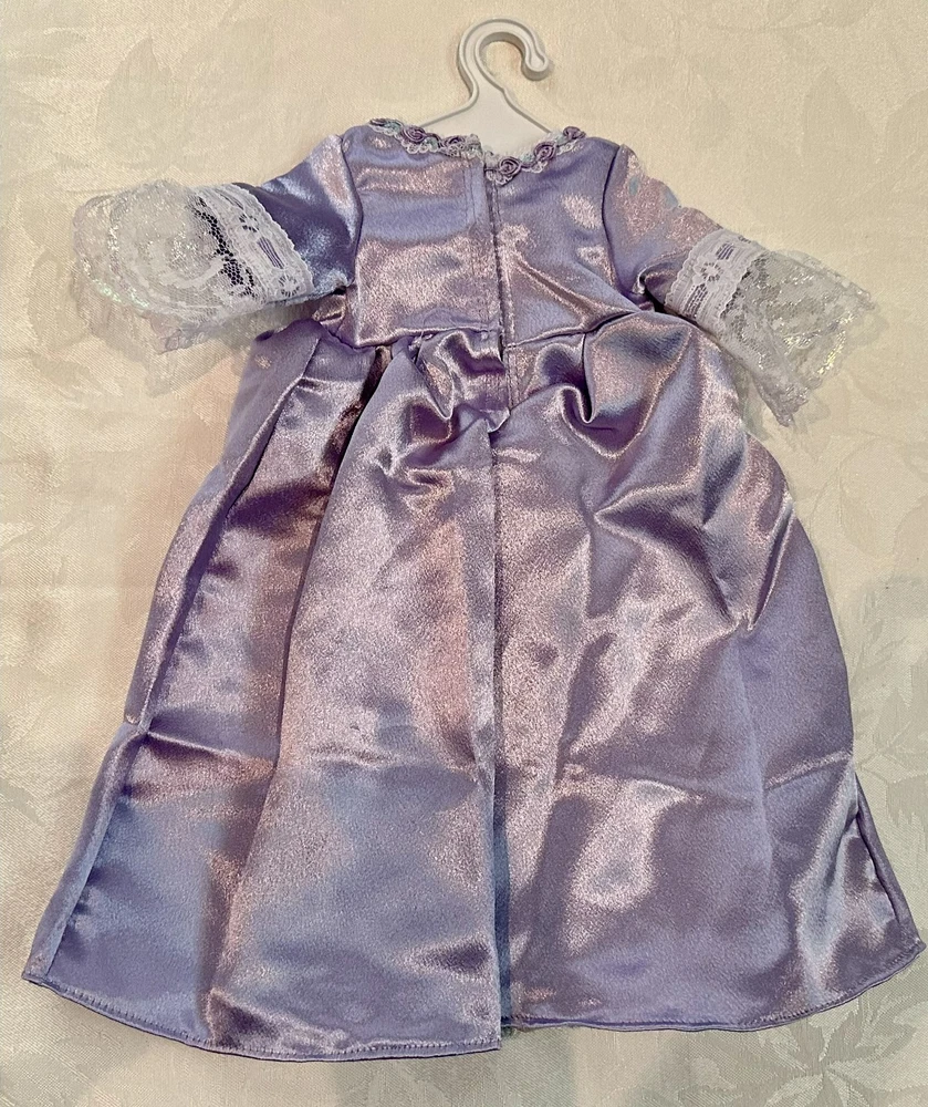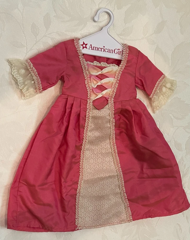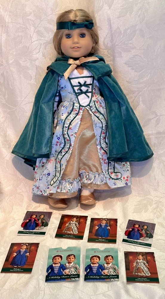 Celebrate the elegance of colonial America with this stunning Elizabeth Cole doll from the American Girl historical collection. She arrives dressed in her breathtaking Holiday Gown ensemble — a rich floral brocade layered over a peach satin underskirt, trimmed in lace and ribbon, and topped with her signature teal velvet cape . Every detail evokes the refinement of 1770s Williamsburg, from the puffed sleeves to the delicate ribbon ties at her neckline. Her long blonde curls are perfectly styled, and her lifelike blue eyes sparkle with the grace and poise that made Elizabeth a fan favorite. This doll has been carefully stored, preserving her pristine condition. Though she comes without her original box, she includes a curated set of extras that elevate her display and collector value: Original “Meet” outfit – pale pink gown with lace trim and matching shoes, as issued with her debut. Original “Very Funny, Elizabeth!” book — a charming companion story full of wit and warmth. 2 sets of Felicity Merriman collector cards – featuring artwork, facts, and character details from the colonial era collection. Additional historical dress — a gorgeous lavender dress (see photos). 2 American Girl original hangers Elizabeth is more than a doll — she’s a character with heart, history, and timeless style. Whether you’re expanding a collection or gifting a piece of American Girl magic, this ensemble offers beauty, storytelling, and rare craftsmanship in one unforgettable package. Whether you're a collector or gifting to someone special, this set brings beauty, story, and savings all in one.