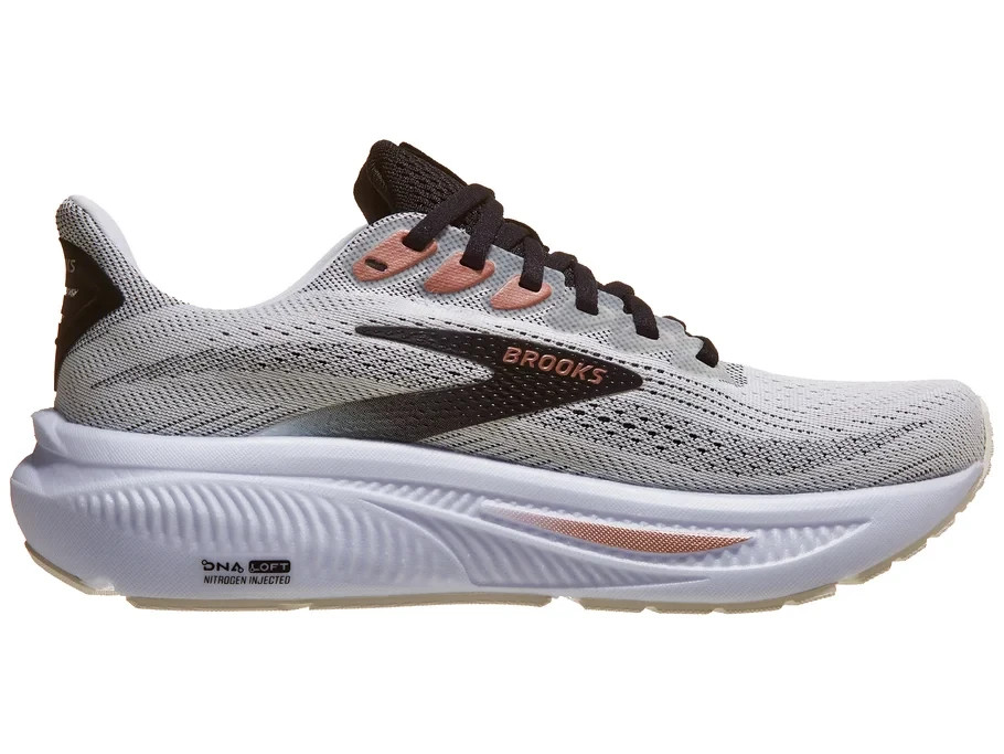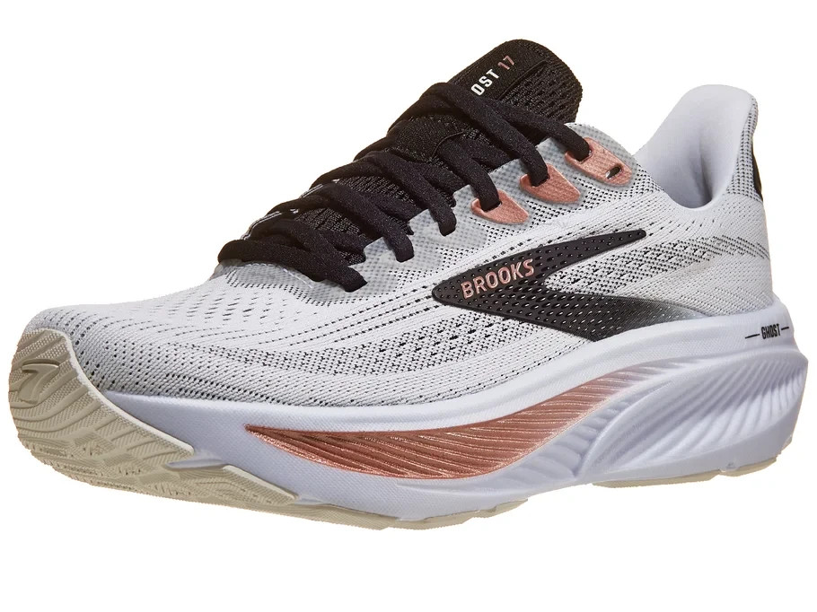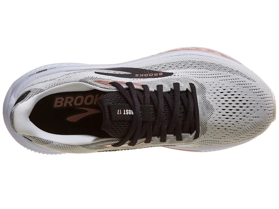 Brooks Ghost 17 Women's Shoes - White/Black/Rose Gold The Brooks Ghost 17 is built for those who seek a smooth and cushioned experience during daily runs, walks, or casual wear. At the heart of this shoe is the nitrogen-infused DNA LOFT v3 midsole, which provides soft lightweight cushioning that lasts mile after mile. With the addition of a little extra cushioning, especially under your forefoot, you'll experience superior comfort whether you're hitting longer miles on the pavement or taking it easy. The shoe's updated 10 mm offset ensures a balanced feel, while the carefully engineered flex grooves align with the natural motion of your foot, promoting smooth transitions from heel strike to toe-off. The wider base of support in both the forefoot and heel offers inherent stability to ensure you feel secure during every run or walk. The upper construction features a double jacquard air mesh that provides breathability, while the kickback collar adds a layer of comfort and structure, hugging your foot securely. From top to bottom, the Brooks Ghost 17 is a can't-go-wrong choice for anyone seeking a comfortable, reliable, and versatile daily trainer. What You'll Love: Extra cushioning for improved shock absorption Newly designed midsole flex grooves allow a natural flow with every step Wider supportive base keeps you sure-footed and steady on every stride MIDSOLE DNA LOFT v3 employs a large cell foaming process for nitrogen-injected cushioning with increased softness and lighter weight. OUTSOLE RoadTack rubber enhances durability while maintaining a lightweight construction. UPPER Double jacquard air mesh blends comfort and structure while ensuring a secure fit.