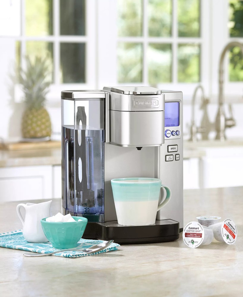 Fully programmable with adjustable brew strength and temperature, this Cuisinart coffee maker gives you single-serve convenience. The K-Cup compatible system has a choice of five cup sizes, from a 4-oz. espresso to a travel-mug-ready 12 oz. A HomeBarista re-usable filter cup is included to let you create custom blends. Model SS-10 Features Approx. dimensions: 11.03"L x 9.33"W x 12.13"H Weight: 15.71 lbs. Includes Home Barista Re-usable Filter Cup K-Cup compatible Five brew sizes, from 4 to 12 ounces Hot water and rinse features Adjustable brew temperature Programmable auto on/off Removable 72-oz. water tank Removable drip tray This product contains aluminum, nickel, chromium, manganese, iron and phosphorus and zinc Dishwasher safe