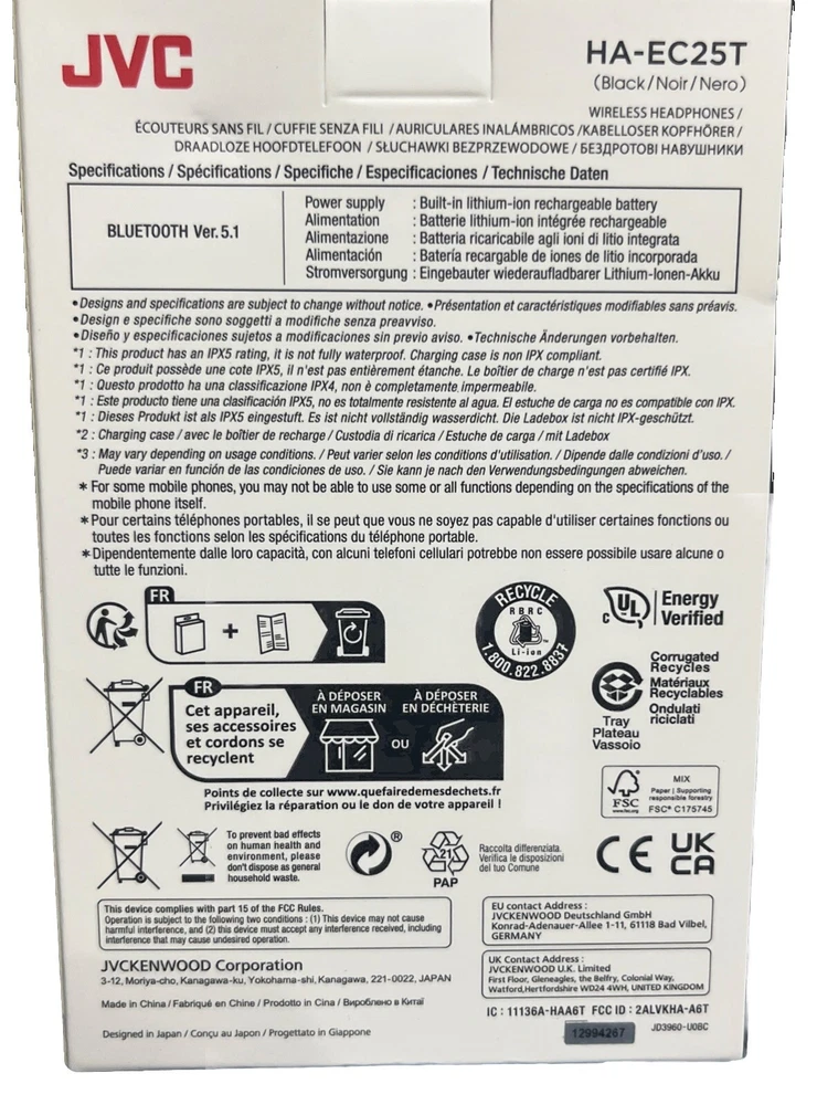 The JVC True Wireless Fitness Series HA-EC25T Bluetooth Headphones are double earpiece earbuds with an ear-hook form factor. They feature a built-in microphone, black color, and offer wireless connectivity through Bluetooth technology. These headphones are part of the Consumer Electronics and Portable Audio & Headphones categories, making them a great gift for fitness enthusiasts.