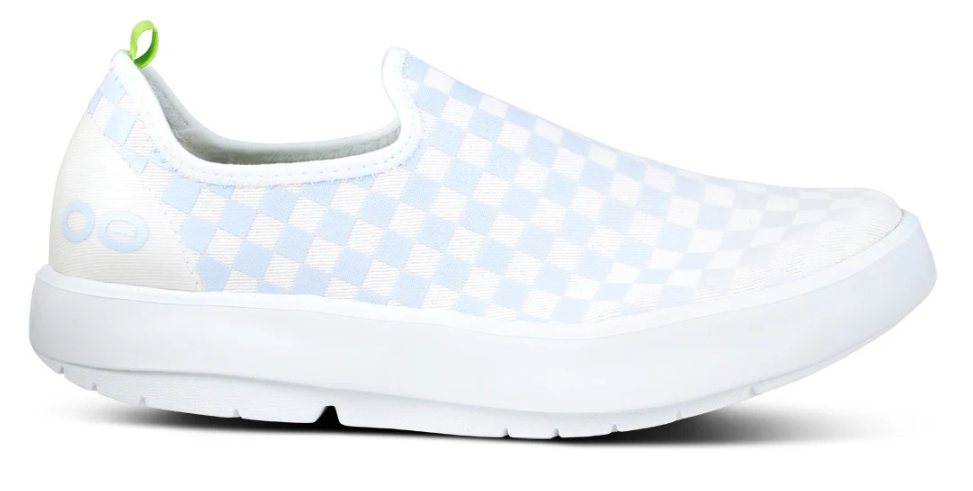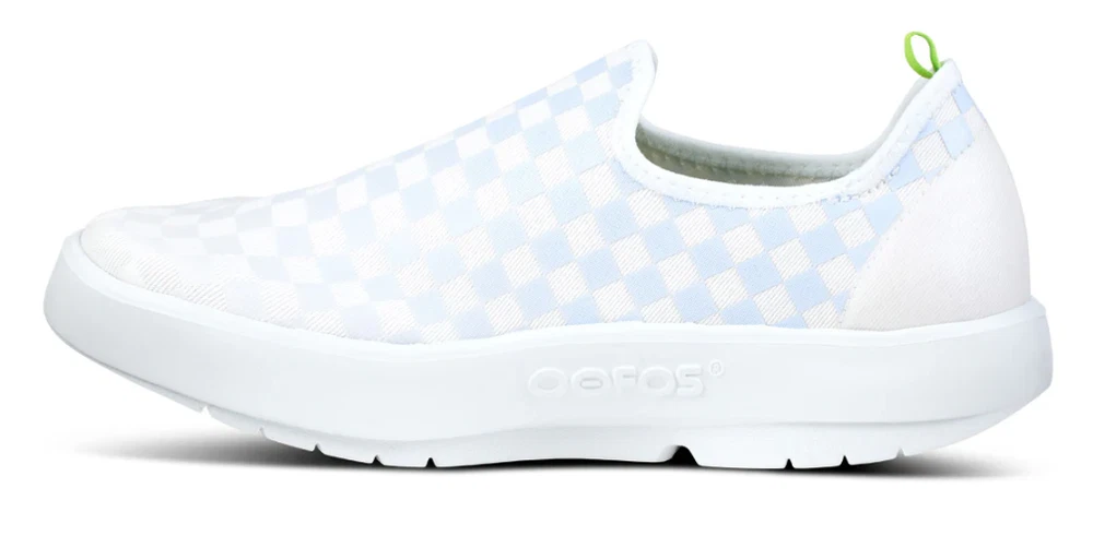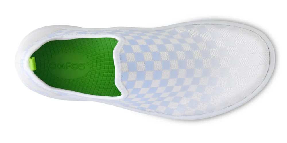 FLASH SALE OOFOS Women's OOmg eeZee Low Shoe - Purple Jade Checker (Authentic) Please note: OOFOS recommends buying half a size up in this style. A different take on the classic, made with a unique 4-way stretch woven canvas-like material, these shoes contour the entire foot. OOfoam™ Technology Revolutionary OOfoam™ technology absorbs 37% more impact than traditional footwear foam materials to reduce the stress on your feet and joints. Superior Quality OOfoam™ technology absorbs 37% more impact than traditional footwear. Patented footbed design reduces stress on knees, ankles and other joints. Closed-cell foam is machine washable and designed to minimize odor. Feel the OO Promise Try any pair for 30 days risk free. If you`re not 100% satisfied, you can send them back at no cost.