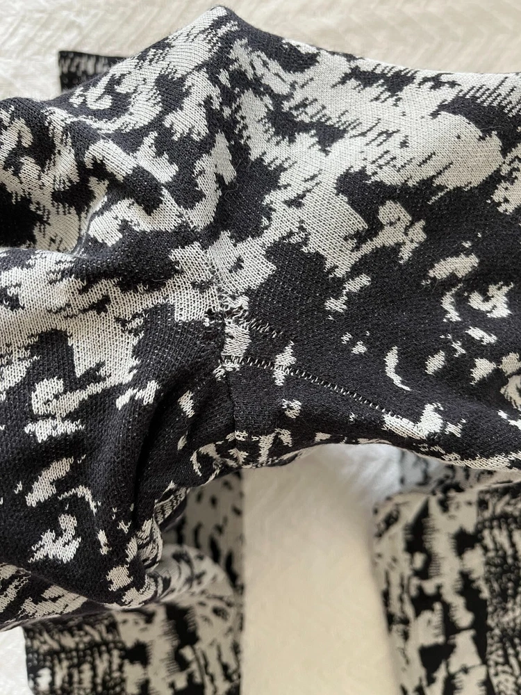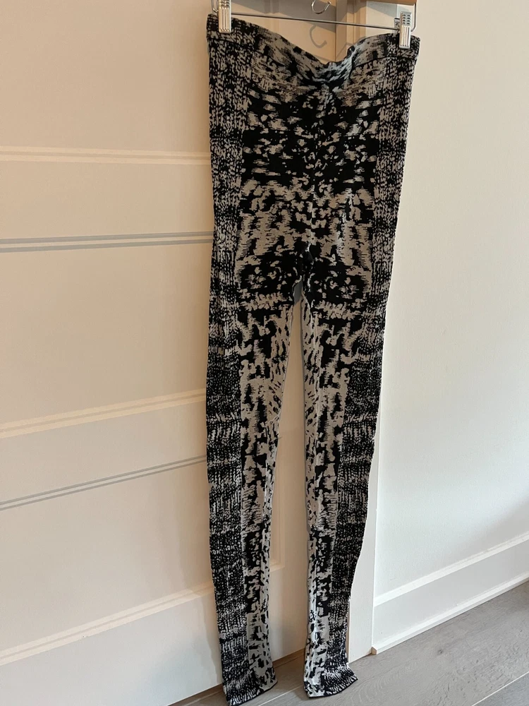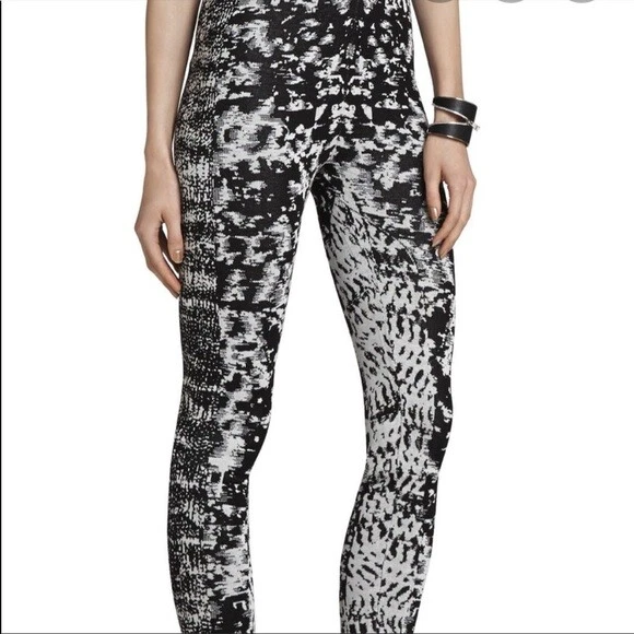 BCBGMAXAZRIA Pre-Owned | Mara Jacquard Leggings Black/Comb Edition The leggings have been bought a few years ago. They have been worn on a few occasions. They are g ently used and in great condition. A sewing alteration was made by a professional seamstress at the crotch area. There is no other alteration nor apparent defects. They have been handled with care and stored safely. Original retail value: $158.00 CAD