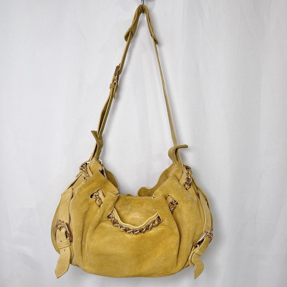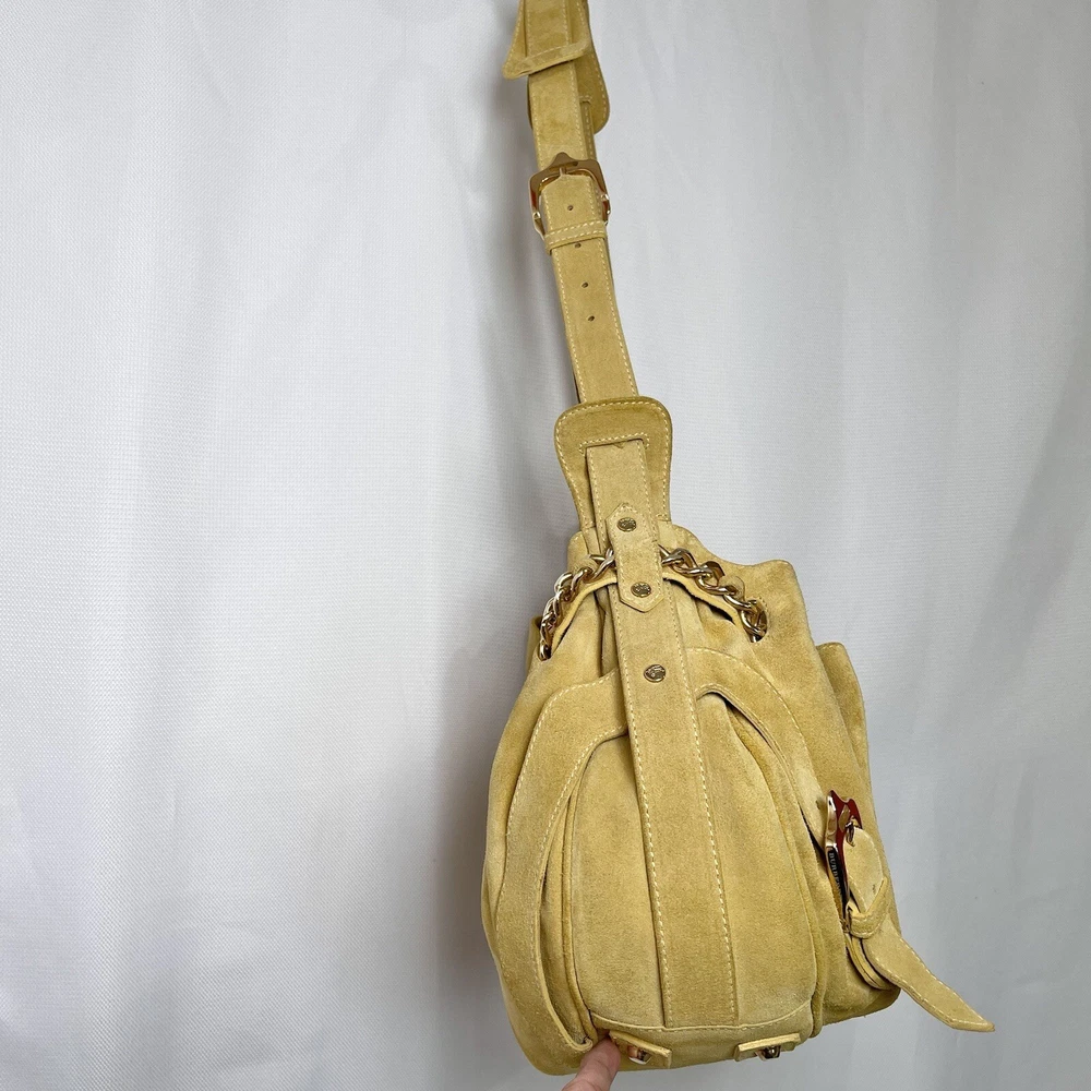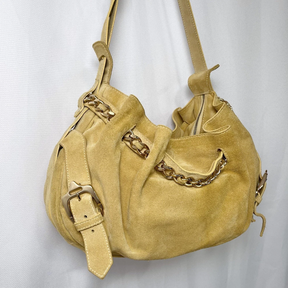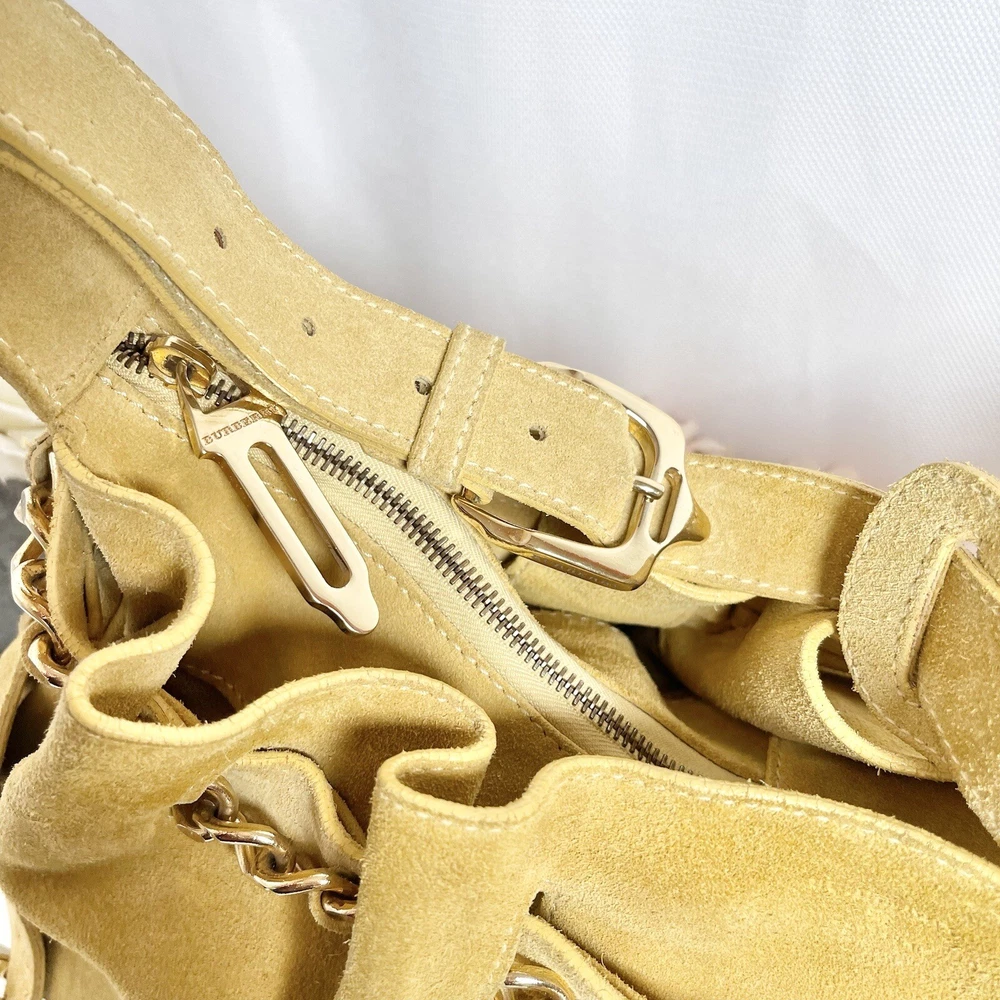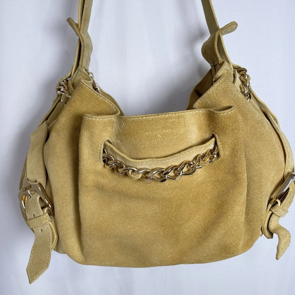 Gorgeous Burberry Suede leather shoulder bag Vintage & Rare hard to find bag! I personally could not find another one of these online. She has Straps & Buckle details Chain weaving in rouched trim Gold hardware with little to no wear or scratches Burberry logo etched on buckles Equestrian Knight logo on the studs 3 compartments: 1 Lg main + 2 on its sides 2 pocket slots on one side Zip closure to the main compartment Magnetic closure for the sides & main Adjustable strap w extra leather strap for comfort Great condition Flawless & Clean interior Exterior is soft suede, no matting, could use a light cleaning in some spots, shows very light wear for its age 18yrs vintage. She has a couple of scratches that are not that noticeable seen in close up pic. To make the flaw stand out more, I tried to show the color and suede changes given different lighting and a brushing of the leather. On camera, the color is a stronger/deeper yellow orange tan, but I’d say the pic closest to actual color is the second pic where the bag is laid flat 17” 6” 12” 14” shortest drop; adjustable length Accepting offers Bundle discounts Elevate your wardrobe with this rare Burberry Prorsum Runway Collection hobo bag. The exterior is crafted from luxurious suede and complemented by leather details. The spacious interior is lined with premium leather and perfect for carrying all your essentials. The chic design features a single strap for comfortable carrying, making it the ideal choice for busy women on the go. This bag is a must-have for any fashion-forward individual looking to add a touch of sophistication to their collection.