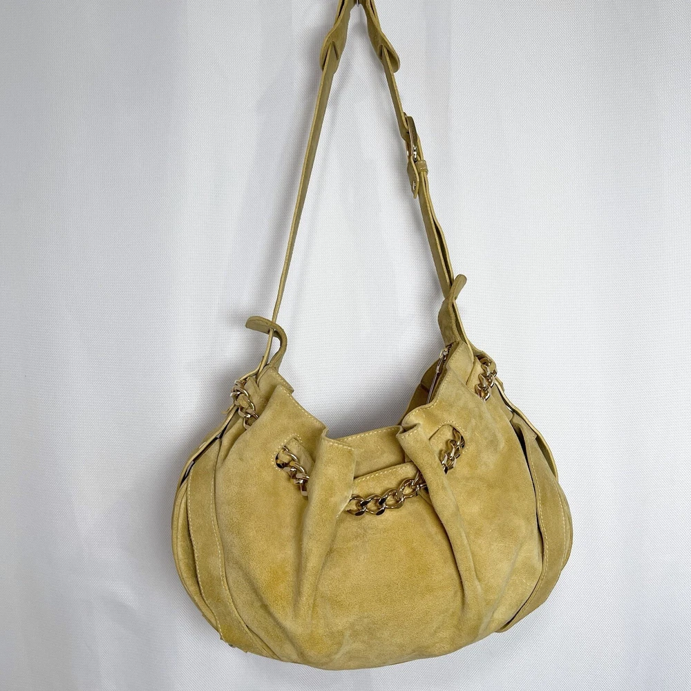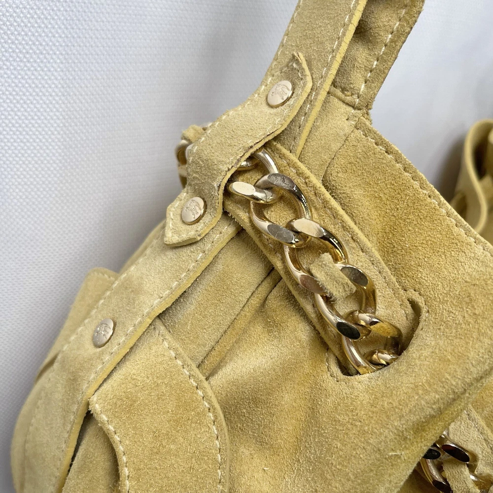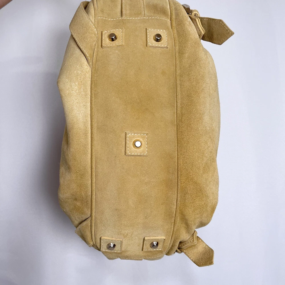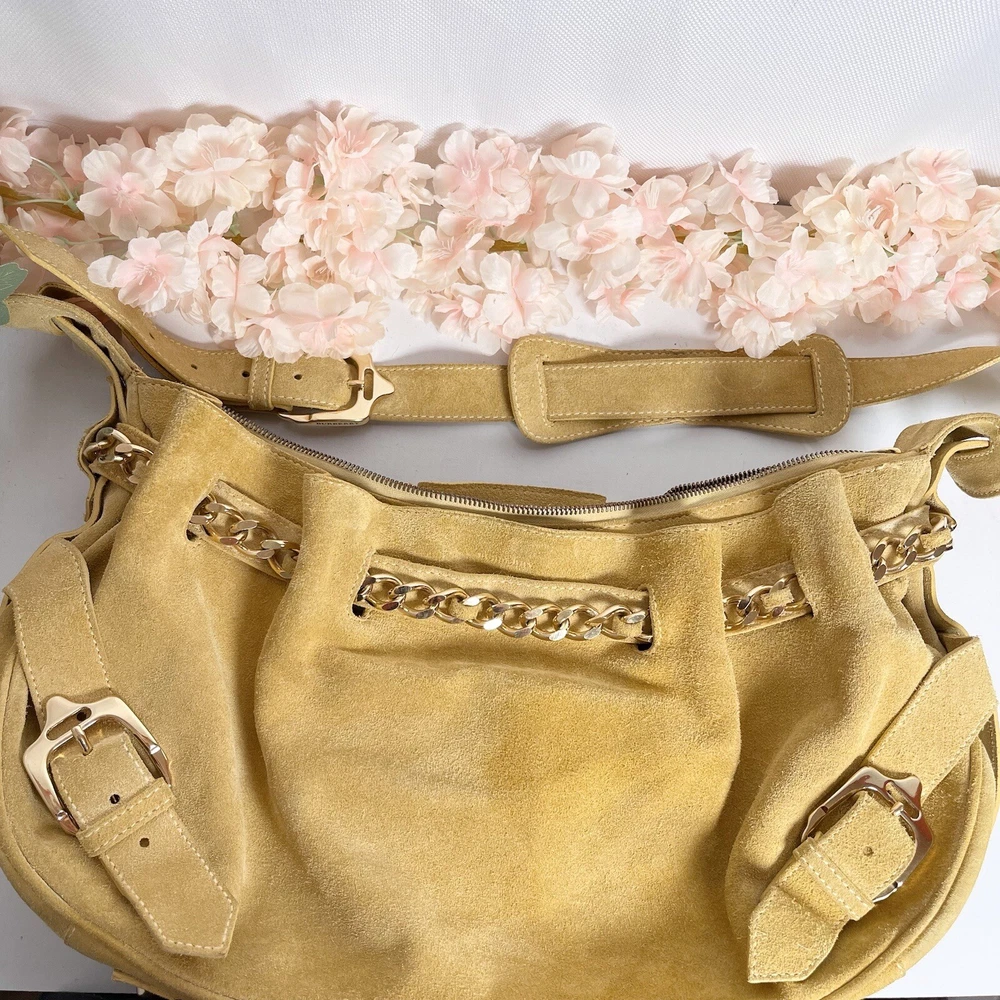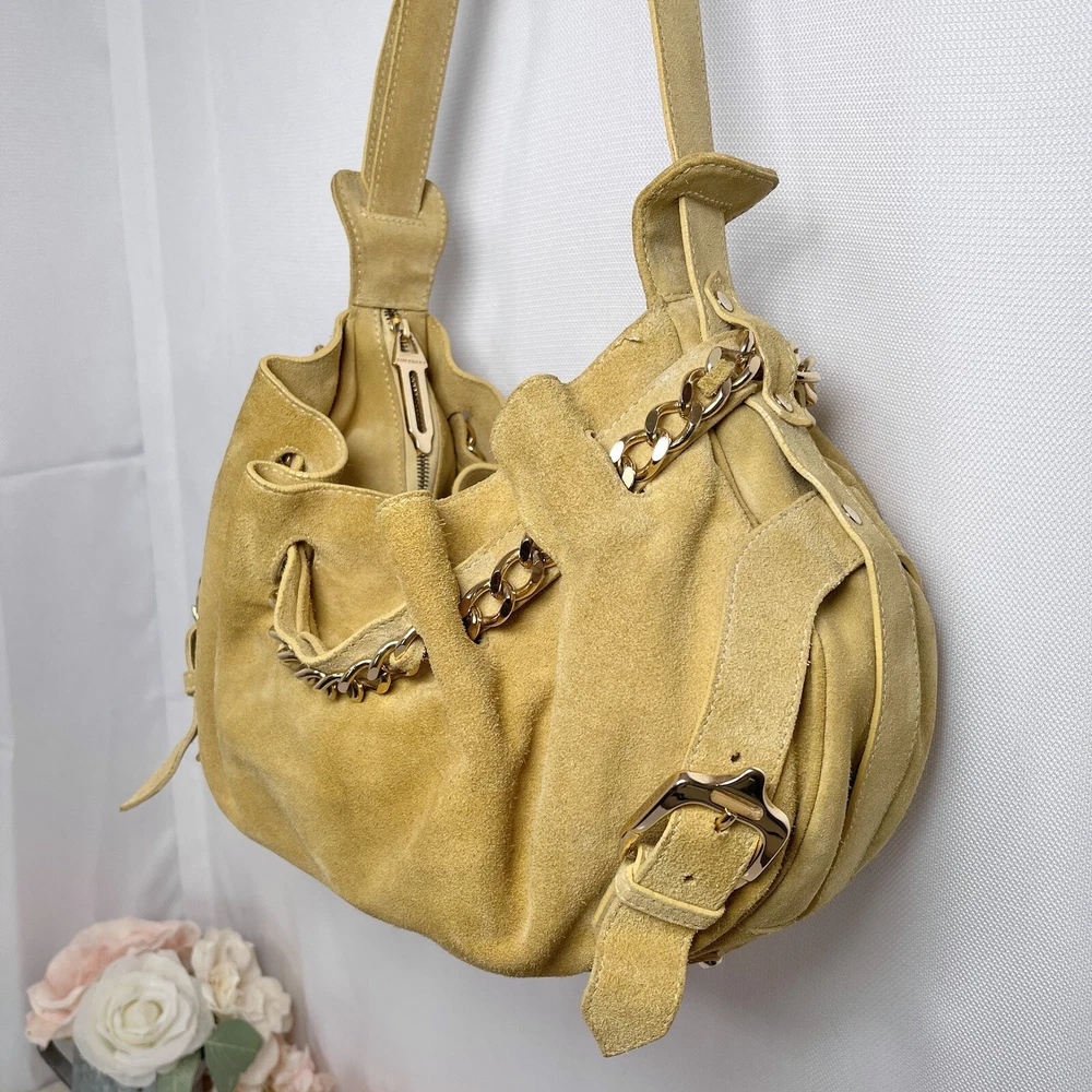 Gorgeous Burberry Suede leather shoulder bag Vintage & Rare hard to find bag! I personally could not find another one of these online. She has Straps & Buckle details Chain weaving in rouched trim Gold hardware with little to no wear or scratches Burberry logo etched on buckles Equestrian Knight logo on the studs 3 compartments: 1 Lg main + 2 on its sides 2 pocket slots on one side Zip closure to the main compartment Magnetic closure for the sides & main Adjustable strap w extra leather strap for comfort Great condition Flawless & Clean interior Exterior is soft suede, no matting, could use a light cleaning in some spots, shows very light wear for its age 18yrs vintage. She has a couple of scratches that are not that noticeable seen in close up pic. To make the flaw stand out more, I tried to show the color and suede changes given different lighting and a brushing of the leather. On camera, the color is a stronger/deeper yellow orange tan, but I’d say the pic closest to actual color is the second pic where the bag is laid flat 17” 6” 12” 14” shortest drop; adjustable length Accepting offers Bundle discounts Elevate your wardrobe with this rare Burberry Prorsum Runway Collection hobo bag. The exterior is crafted from luxurious suede and complemented by leather details. The spacious interior is lined with premium leather and perfect for carrying all your essentials. The chic design features a single strap for comfortable carrying, making it the ideal choice for busy women on the go. This bag is a must-have for any fashion-forward individual looking to add a touch of sophistication to their collection.