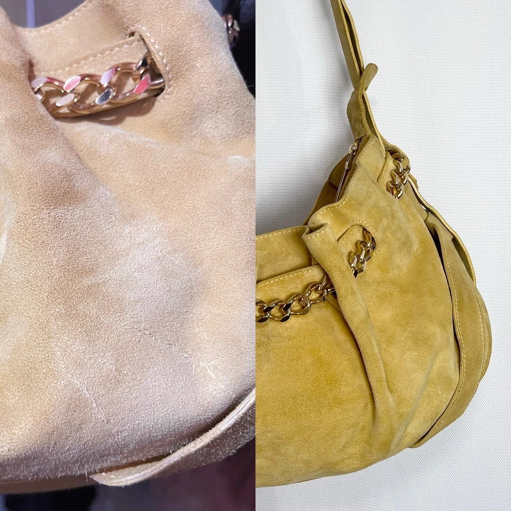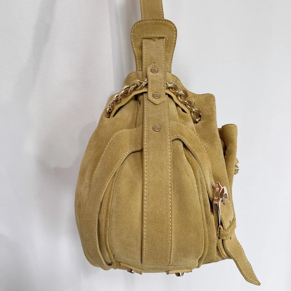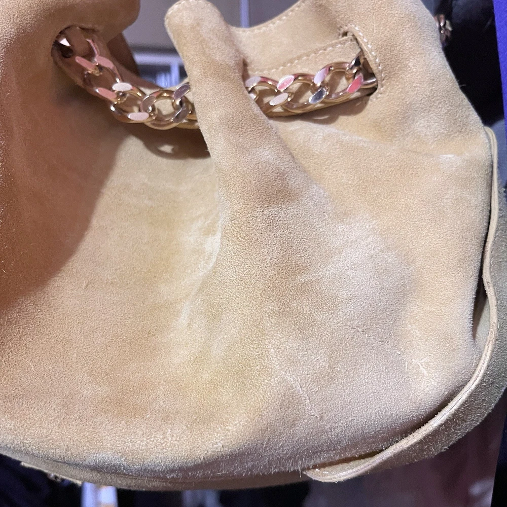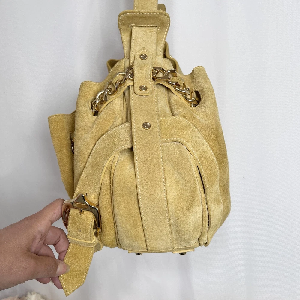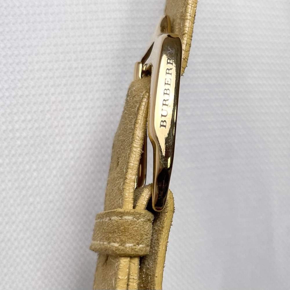 Gorgeous Burberry Suede leather shoulder bag Vintage & Rare hard to find bag! I personally could not find another one of these online. She has Straps & Buckle details Chain weaving in rouched trim Gold hardware with little to no wear or scratches Burberry logo etched on buckles Equestrian Knight logo on the studs 3 compartments: 1 Lg main + 2 on its sides 2 pocket slots on one side Zip closure to the main compartment Magnetic closure for the sides & main Adjustable strap w extra leather strap for comfort Great condition Flawless & Clean interior Exterior is soft suede, no matting, could use a light cleaning in some spots, shows very light wear for its age 18yrs vintage. She has a couple of scratches that are not that noticeable seen in close up pic. To make the flaw stand out more, I tried to show the color and suede changes given different lighting and a brushing of the leather. On camera, the color is a stronger/deeper yellow orange tan, but I’d say the pic closest to actual color is the second pic where the bag is laid flat 17” 6” 12” 14” shortest drop; adjustable length Accepting offers Bundle discounts Elevate your wardrobe with this rare Burberry Prorsum Runway Collection hobo bag. The exterior is crafted from luxurious suede and complemented by leather details. The spacious interior is lined with premium leather and perfect for carrying all your essentials. The chic design features a single strap for comfortable carrying, making it the ideal choice for busy women on the go. This bag is a must-have for any fashion-forward individual looking to add a touch of sophistication to their collection.