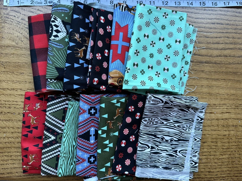 14 FQ that have had a bit cut from them. There are two full FQ—the black and white tree bark and the red and black circles. Happy to provide more info or pictures as requested.