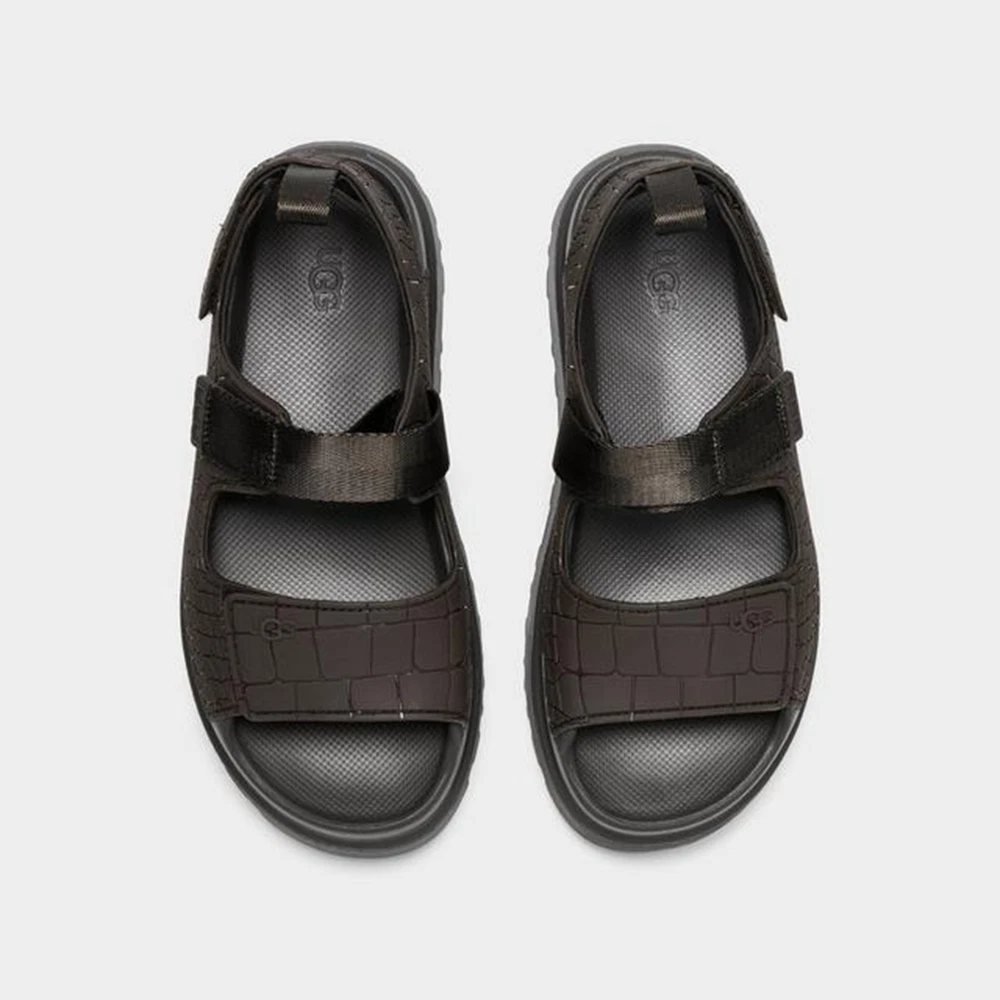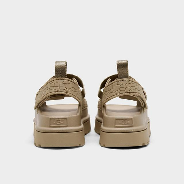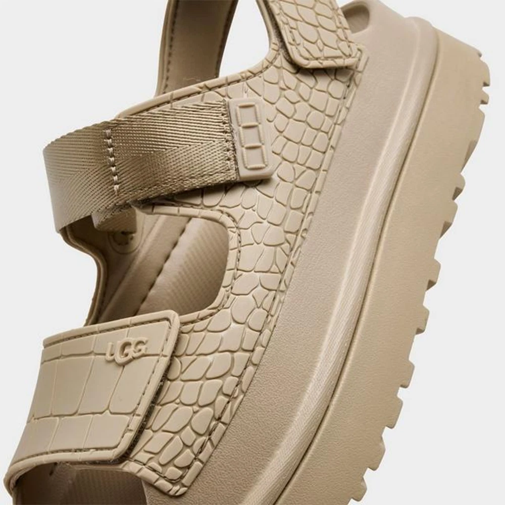 Made from Sustainable Materials Straps are made with about 100% recycled Polyester fibers Upper lining is made from about 100% recycled Polyester fibers Product Features TPU upper with all-over, embossed croc-print pattern Everyday, versatile slides with heat-embossed UGG® logo for distinctive style UGG-branded TPU hook-and-loop triple-strap closure with heel pull tab for a gently locked-in fit Sugarcane EVA midsole and EVA outsole for reliable grip across all surfaces The UGG GoldenGlow Embossed is imported. Roam about in reptilian-inspired comfort after slipping into these Women's UGG GoldenGlow Embossed Slide Sandals. Crafted from a TPU upper with an all-over croc-embossed print, this summer-ready slide silhouette is equipped with a triple-strap hook-and-loop closure, a rear pull tab, an ultralight sugarcane EVA midsole and outsole, and heat-embossed UGG® brand sign-offs.
