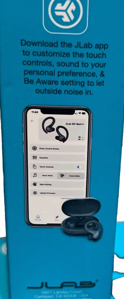 These are JLab GO SPORT+ true wireless Bluetooth earbuds with a charging case. They have an ear-hook form factor, with a graphite color and a double earpiece design. The earbuds feature built-in microphone and wireless connectivity via Bluetooth. The model is GO SPORT+.