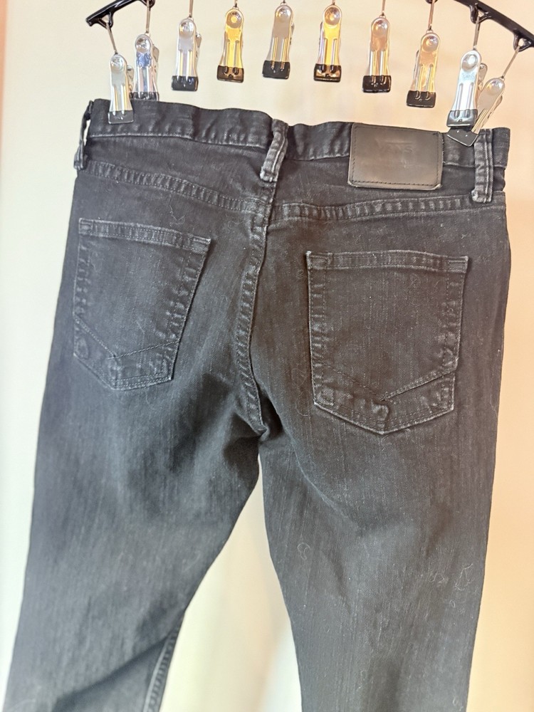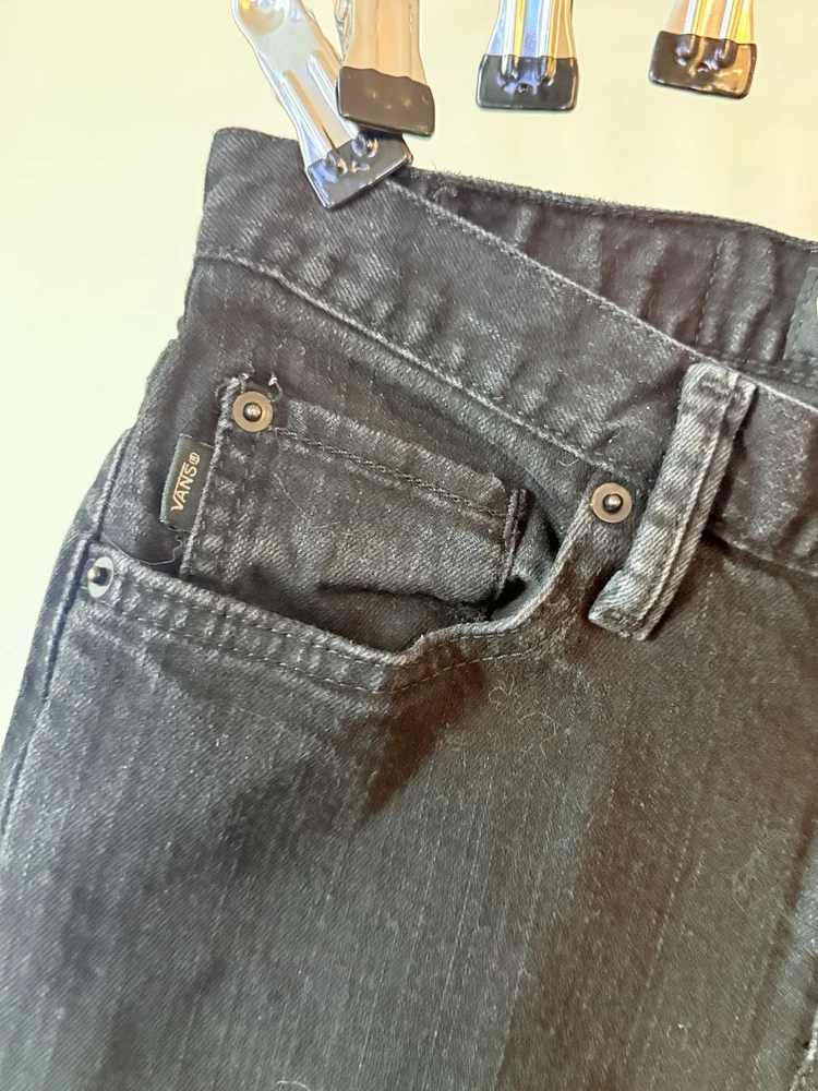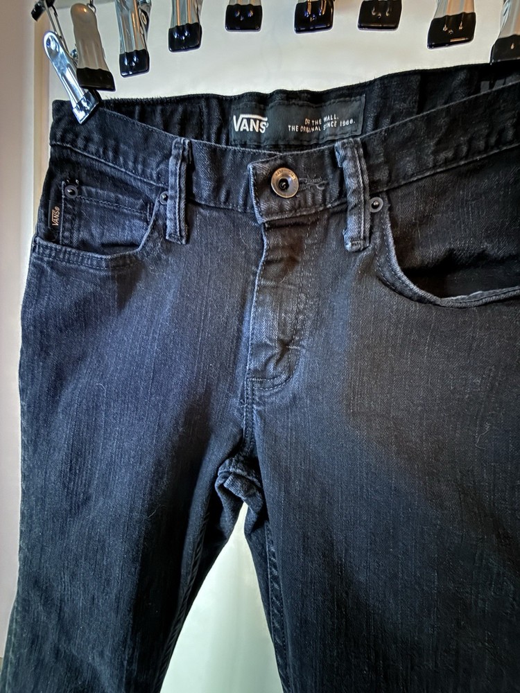 The product is a pair of VANS black jeans for men, with a classic fit and skinny style. The size is 28x28 inches, featuring a grunge theme that is perfect for those embracing a skater-inspired look. These jeans are a stylish addition to any wardrobe, offering both comfort and a trendy design that can be dressed up or down for various occasions.