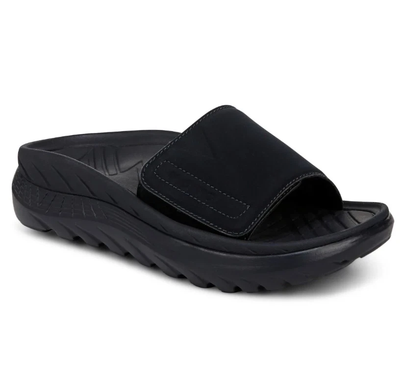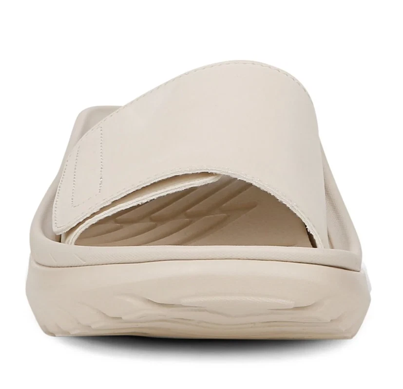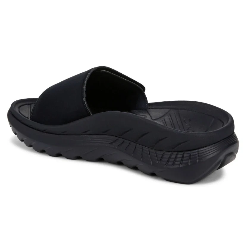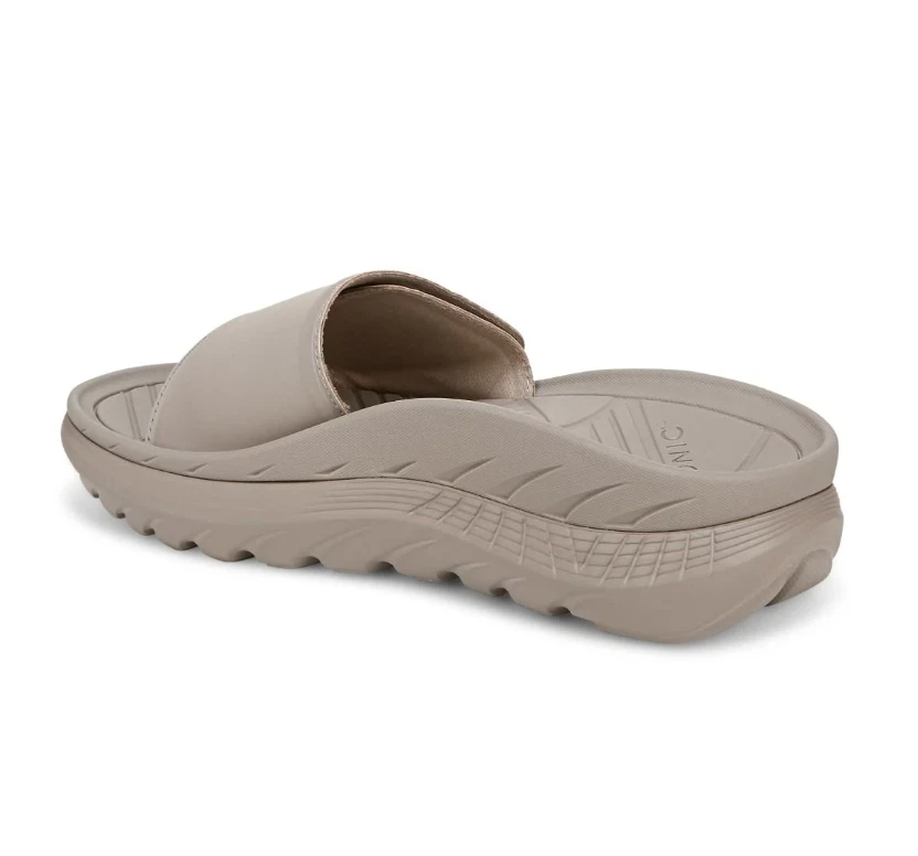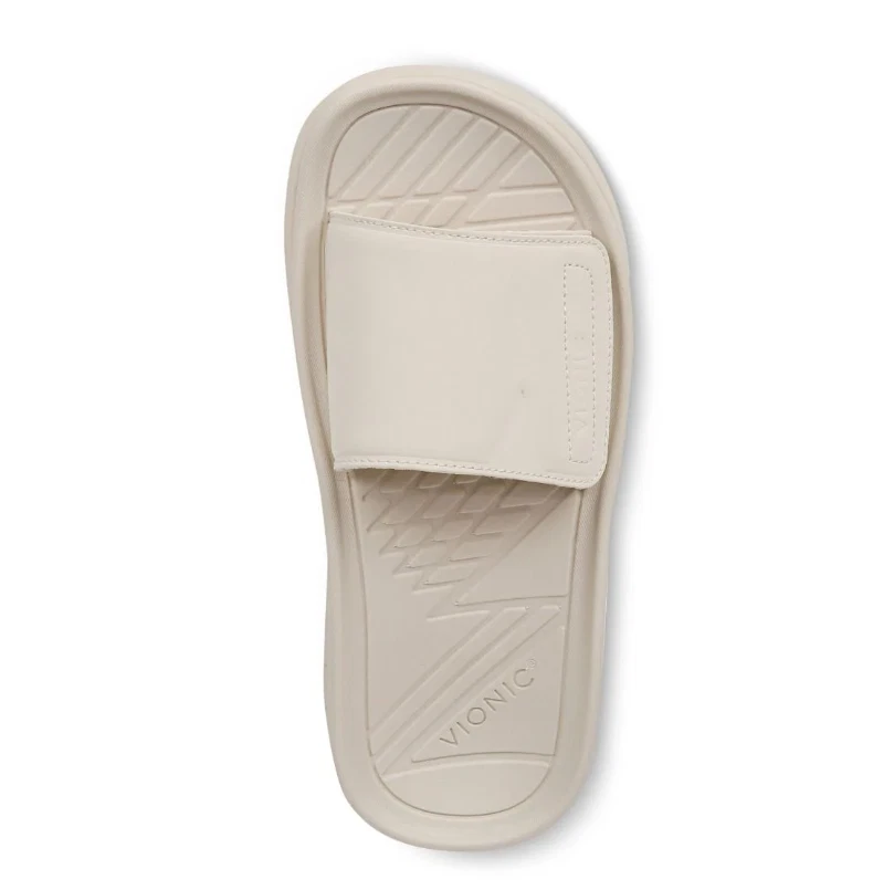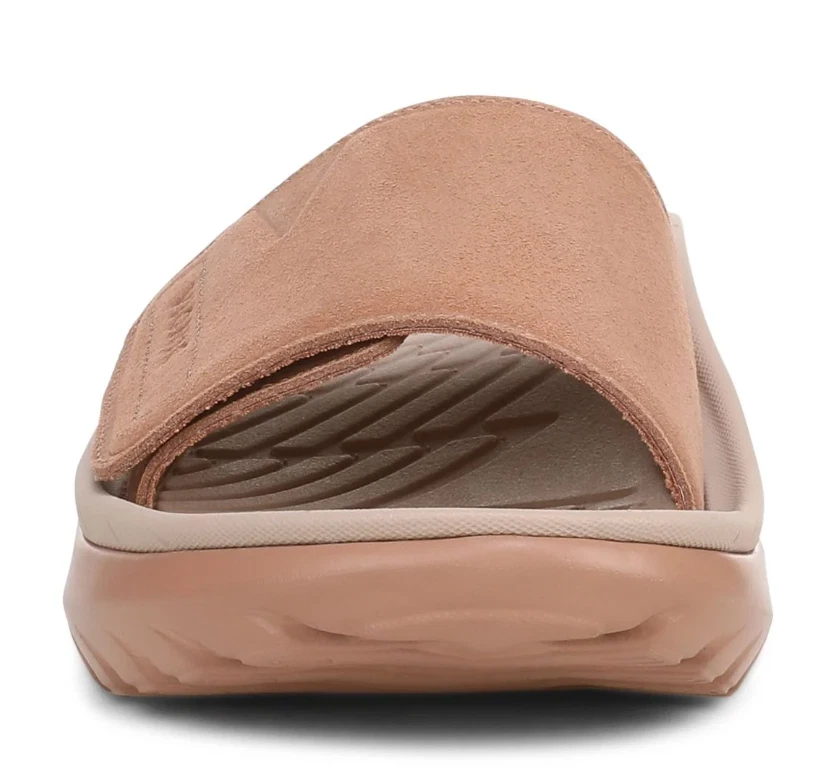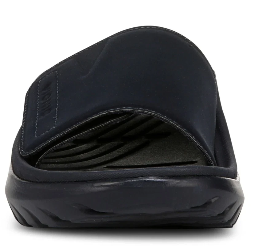 Description Show your feet some love in this recovery slide featuring adjustable straps, textured footbeds and dual-density cushioning. Details Tested by Heeluxe: The footwear industry gold standard, Heeluxe uses patented technology to analyze comfort and performance against competitive styles, in conditions that duplicate real-world wear. Superior dynamic stability and propulsion. Superior foot contact & pressure distribution for maximum recovery. Molded EVA footbed with oversized sidewall and deep heel cup. Uppers: Suede or synthetic nubuck. Dual-density midsole balancing cushion. Texturized footbed for massaging comfort. Adjustable cushioned upper. Outsole: EVA. Heel height: 2.0 inches. Received APMA Seal of Acceptance. Fit & Care Women's whole sizes 5 to 14 Men's half sizes 7.5 to 12.5 If you are between sizes, we recommend going up to the nearest size. Fits medium widths. For the greatest comfort, we recommend wearing your new Vionic footwear or orthotics for just a few hours for the first few days to allow your feet to adjust to the new level of orthotic comfort and support. Within one to two weeks you should find the product completely comfortable and supportive. To preserve the appearance of your Vionic shoes, we recommend that you clean the uppers, if needed, using a dry, cotton cloth to wipe away dirt or dust. If your shoes or sandals become wet, please allow them to dry naturally. We recommend that you test any cleaning product by applying a small amount to a discreet area and allowing it to dry. Do not use cleaners which contain acid or detergents, as they may damage and prematurely age the leather.
