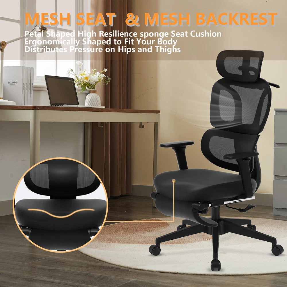 【 Customizable Comfort 】Featuring adjustable seat depth (20.8"-22"), height (20.1"-22.4"), and tilt functions to ensure a perfect fit for users between 5'1" and 6'2". 【 Enhanced Ergonomics 】 Dynamic lumbar support, 5-level adjustable back, a 3D adjustable headrest, nap footrest and tilt provide superior back and neck support for long hours. 【 3D Armrests 】Fully adjustable armrests (height, forward/back, and swivel) allow for precise positioning to reduce arm strain during extended use. 【 Breathable & Durable Design 】Choose between a mesh seat for cooling airflow or a cushioned foam seat for cradled support, with premium materials & class 4 gas lift built to last. 【 Optional Footrest 】Retractable footrest available for added relaxation—perfect for breaks or reclined seating, paired with a sleek modern design that suits any workspace. Details: Product Height: 43.7" - 52.4" Product Dimensions: 27.8" D× 27.8 " W× 52.4 "H Seat Depth: 20.8" - 22" Seat Width: 20.5" Adjustable Seat Height: 20.1" - 22.4" Weight: 38 lbs Weight Capacity: 400 lbs Features: 3D Headrest, 3D Armrests, Dynamic Height, Tilt Function, Adjustable Lumbar Support, Adjustable Seat Depth Lifting Mechanism: Gas Spring Seat Material: Mesh Frame Material: Nylon On Feb 10, 2025 at 00:38:50 PST, seller added the following information: